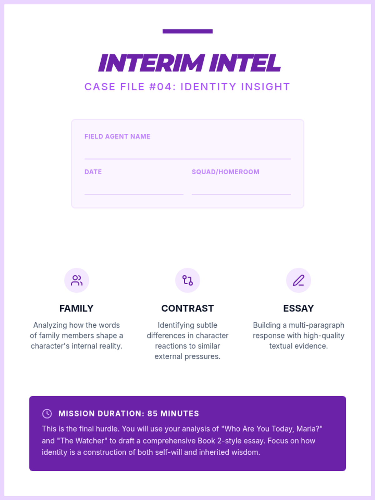 A specialized essay-writing workshop focused on comparing and contrasting two fictional narratives. Students analyze how family influences shape the identities of Maria and Evan, leading to a full-length essay response aligned with Book 2 of the IA.