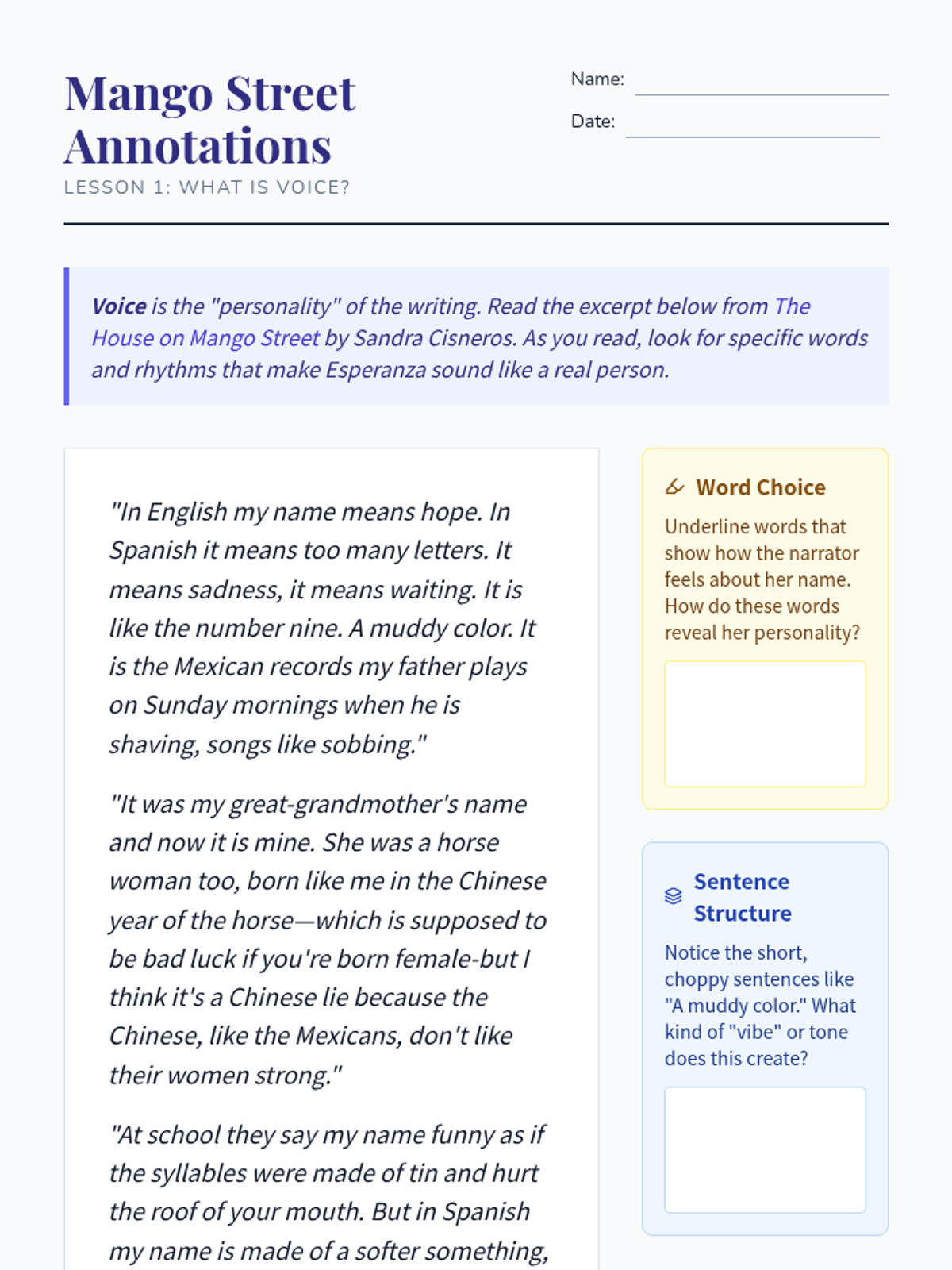 An introduction to 'voice' in literature, using Sandra Cisneros's 'The House on Mango Street' as a primary text. Students learn to identify word choice and sentence structure that contribute to a narrator's unique personality.