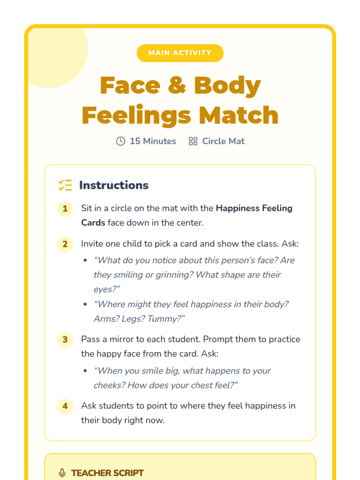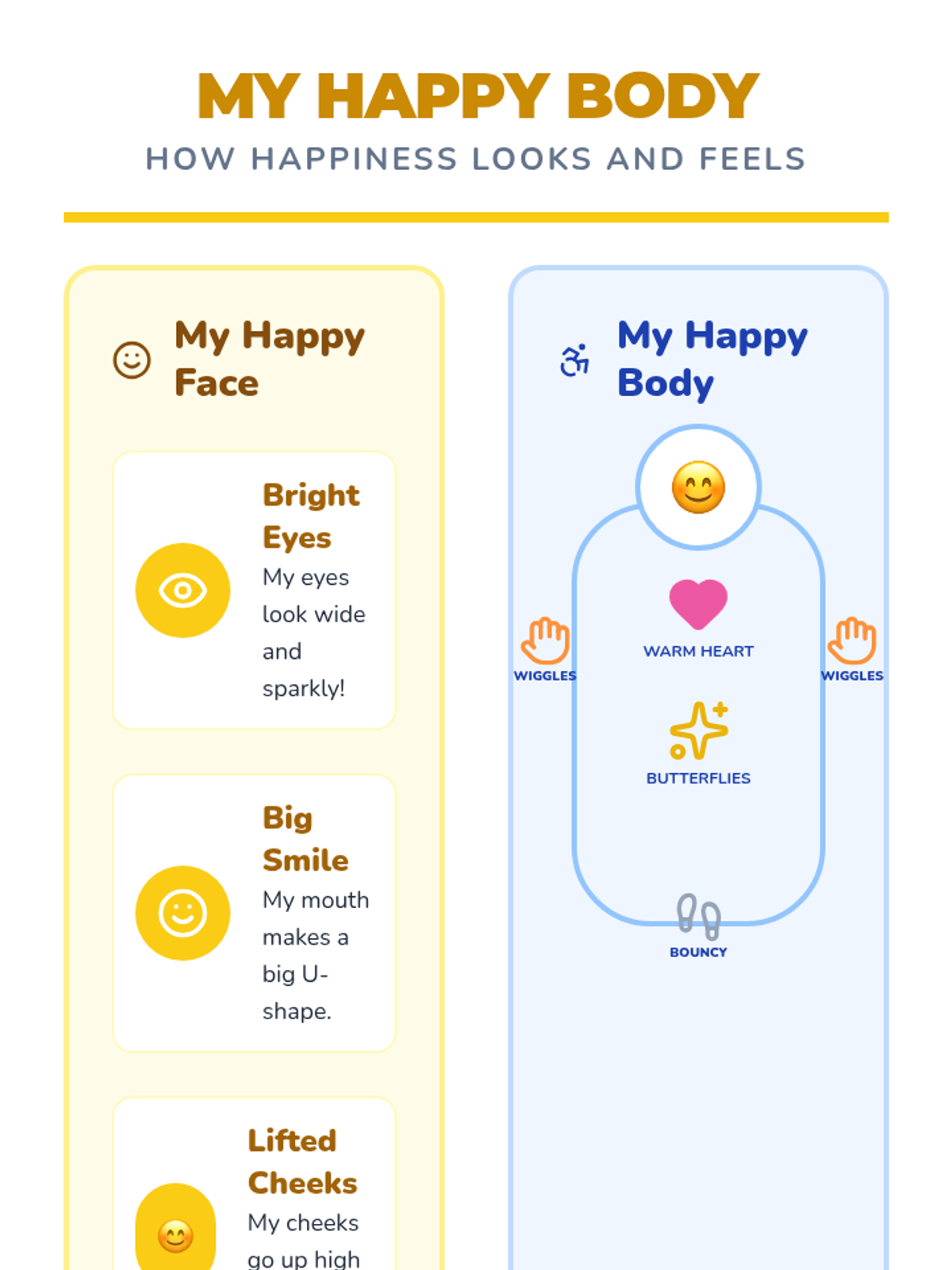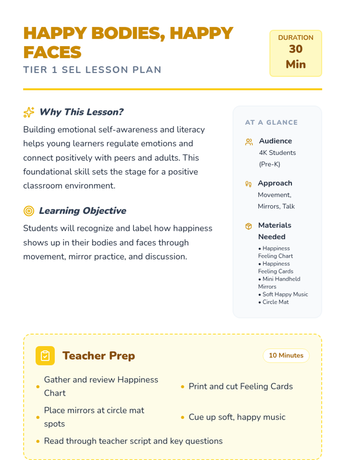 A foundational social-emotional learning lesson for 4K students to identify and express happiness through facial expressions and body sensations.