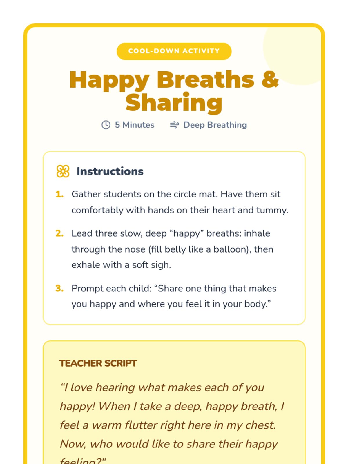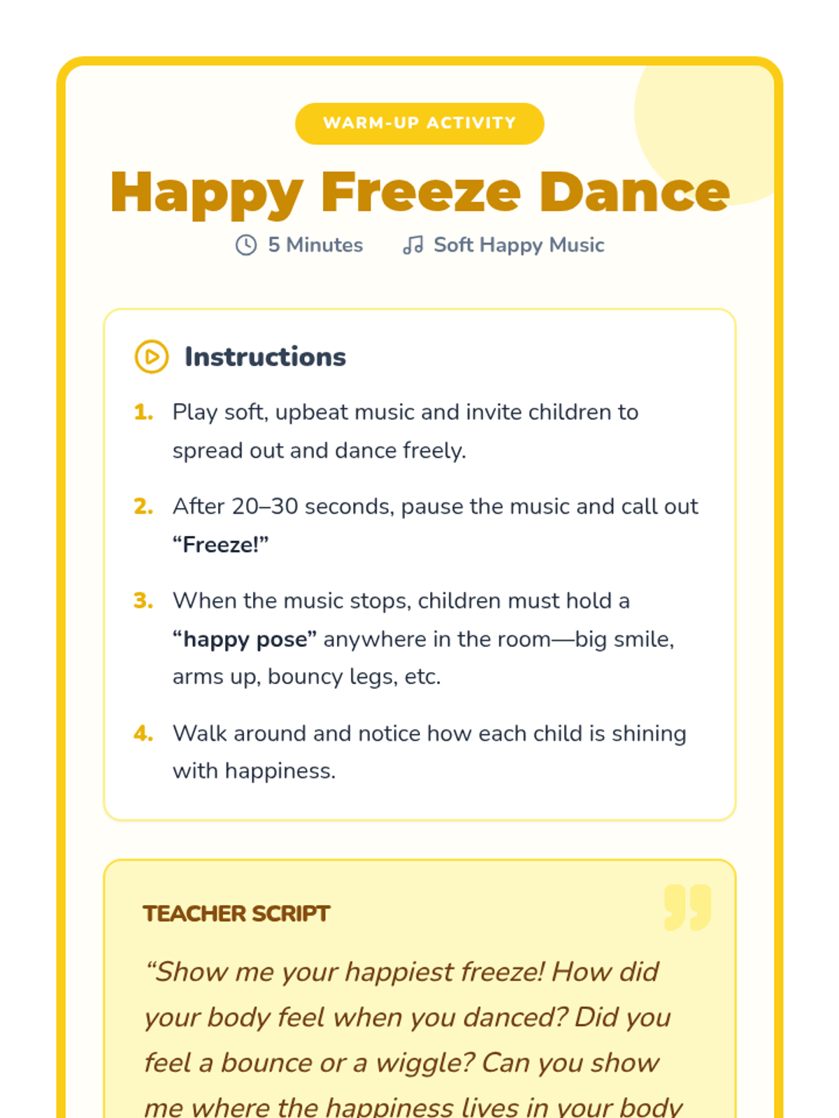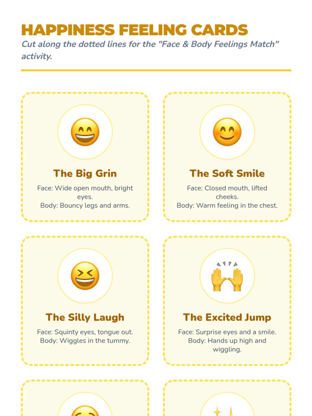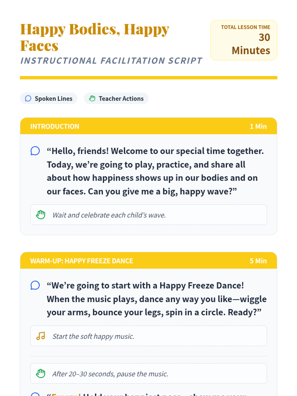 A foundational social-emotional learning lesson for 4K students to identify and express happiness through facial expressions and body sensations.