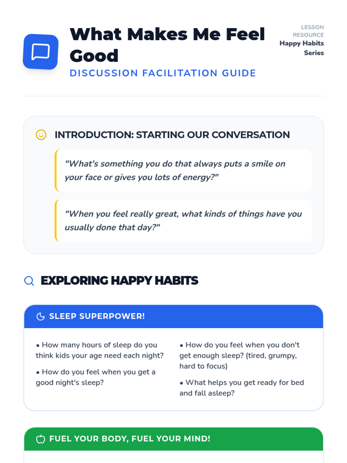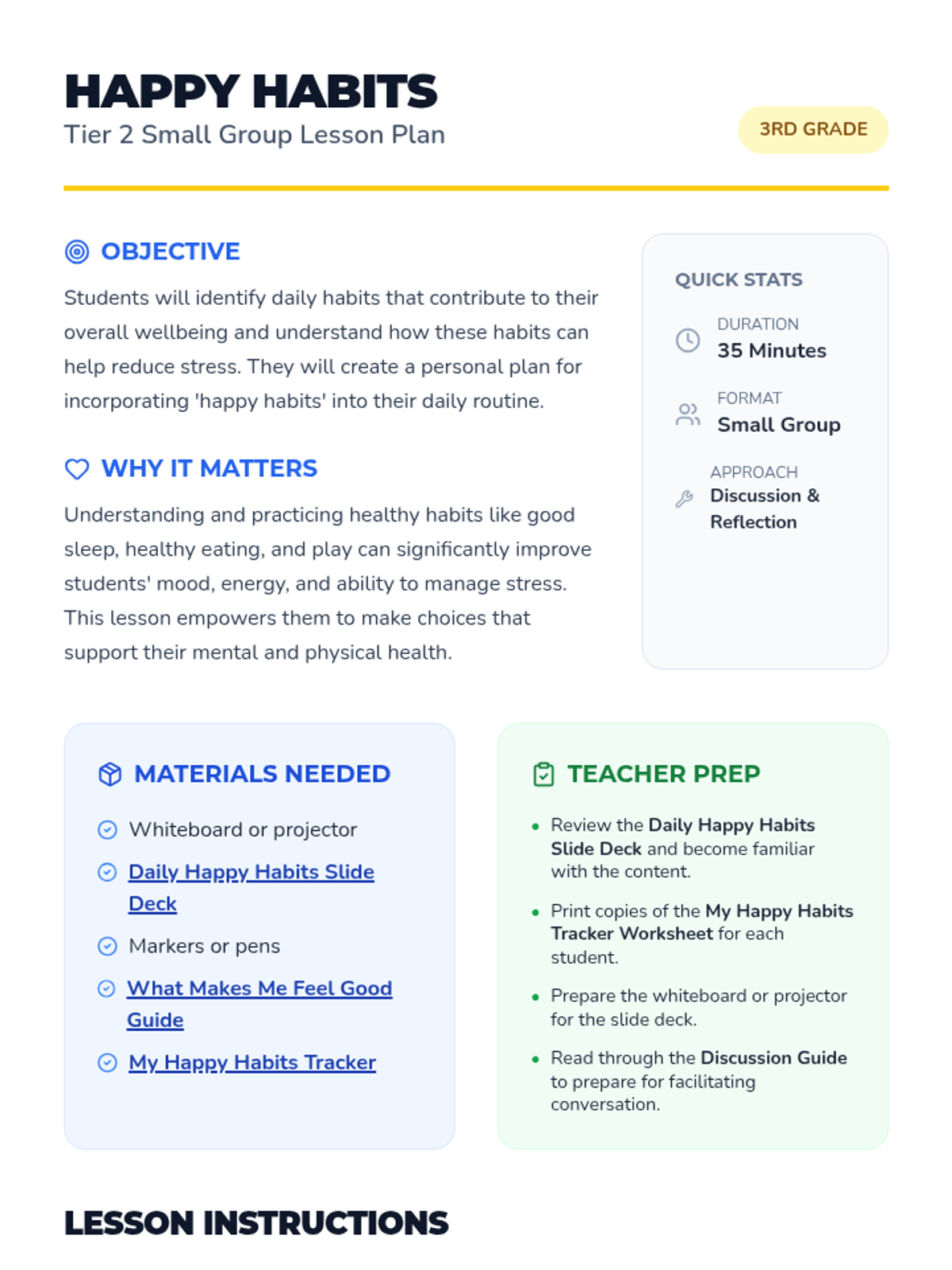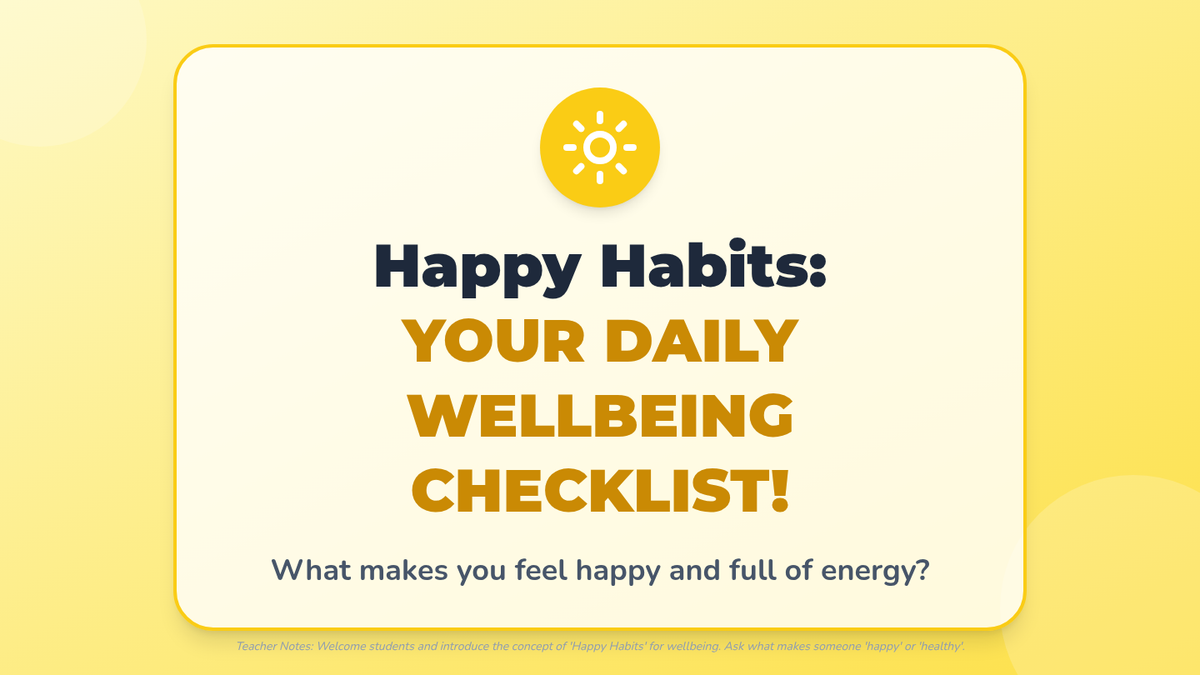 A 3rd-grade small group lesson focused on identifying and practicing daily 'Happy Habits' like sleep, nutrition, and play to improve mood and reduce stress.