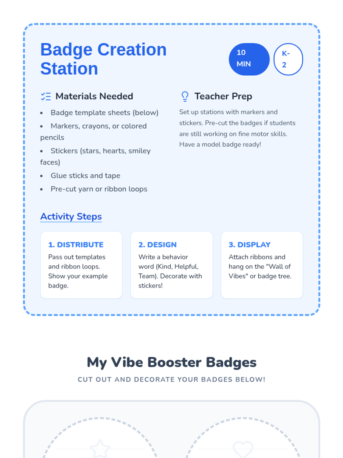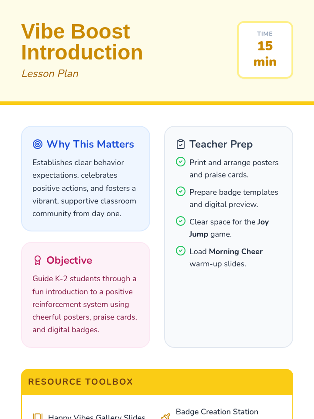 A fun, 15-minute introduction to a Tier 1 positive reinforcement system for K-2 students, featuring colorful visuals and interactive activities.