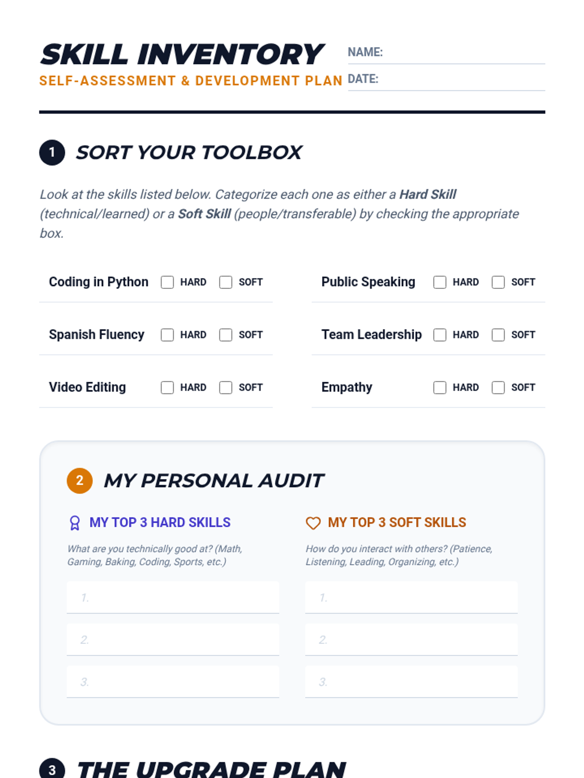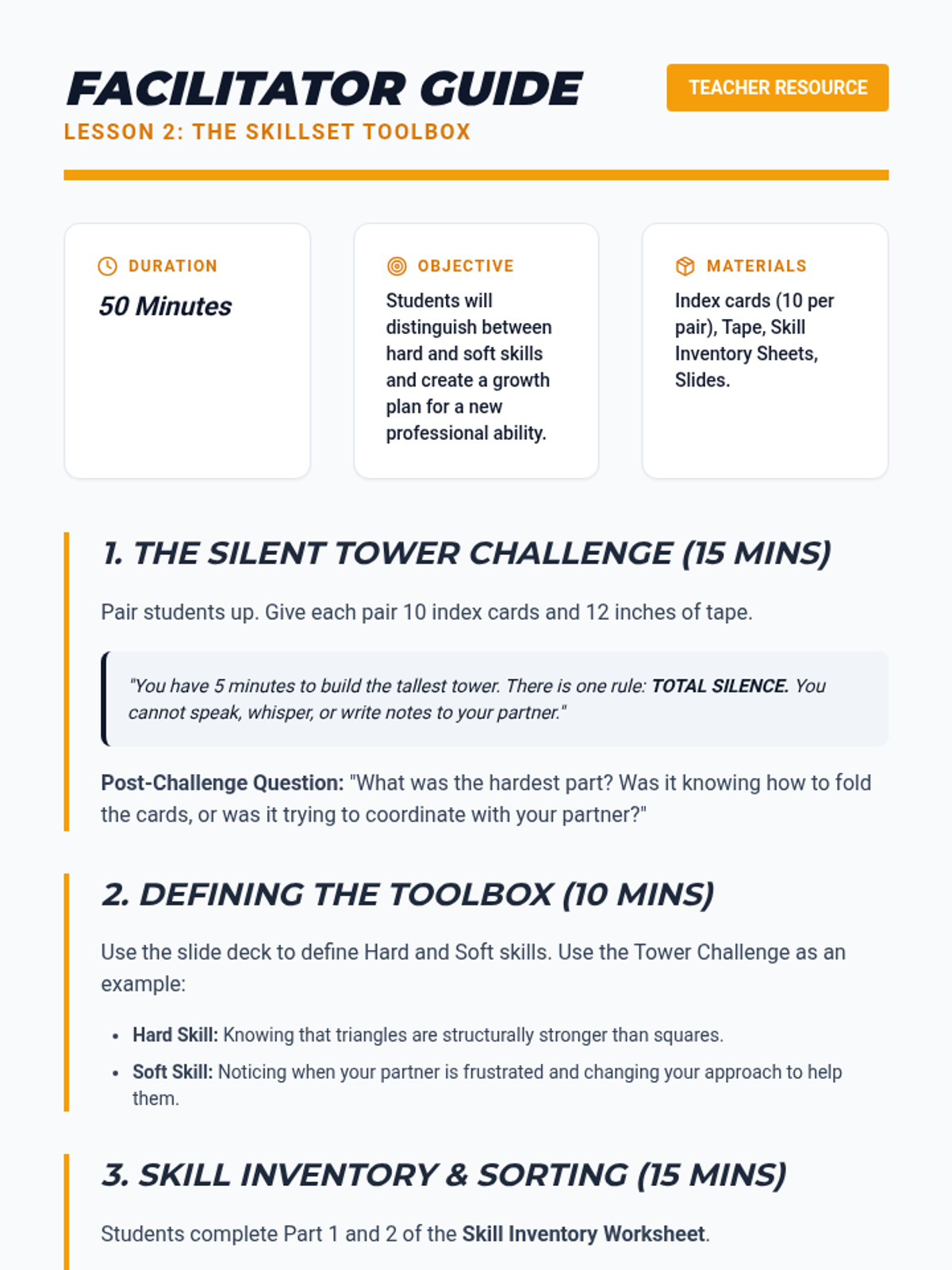 Students distinguish between hard and soft skills through a collaborative building challenge and a personal inventory. They will assess their current strengths and create a plan for future skill development.