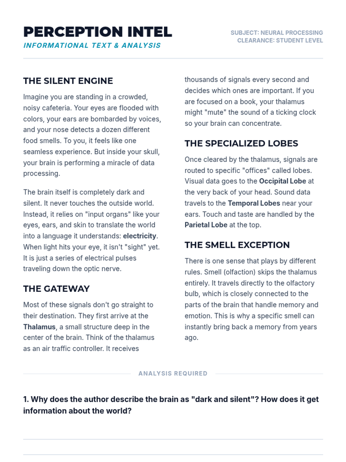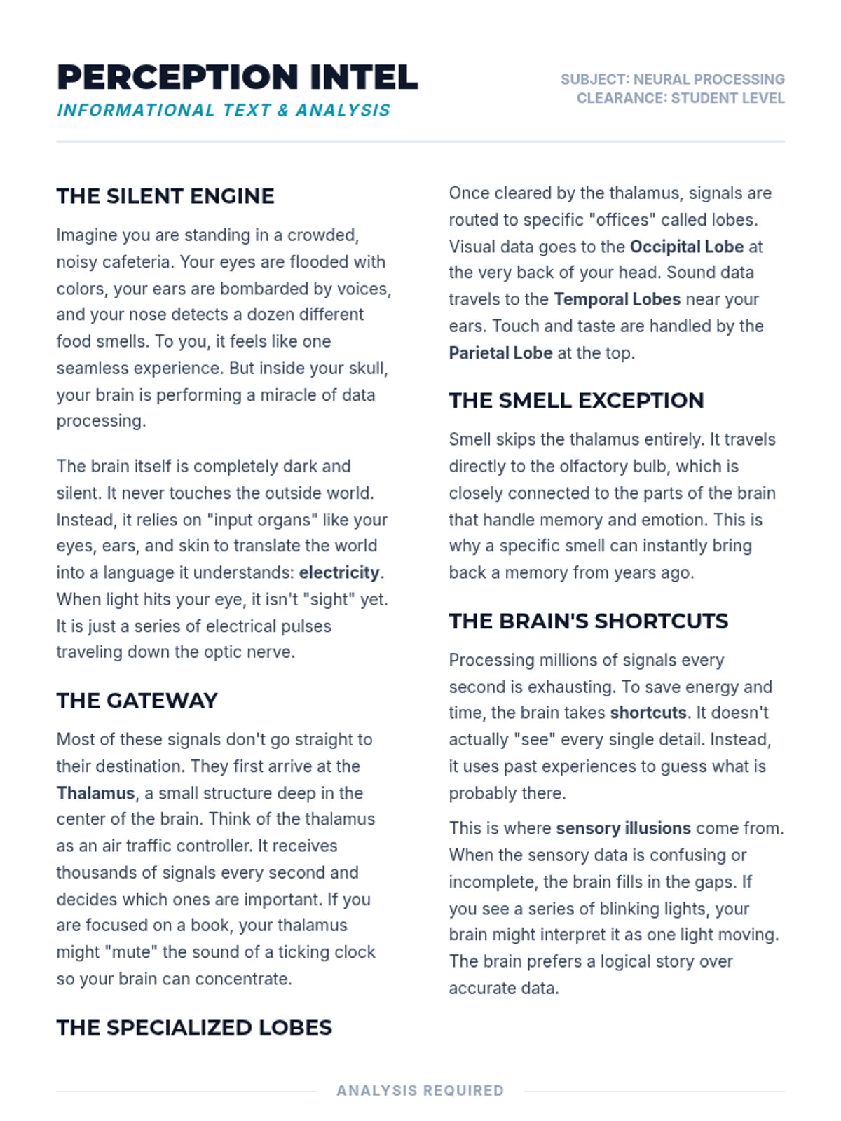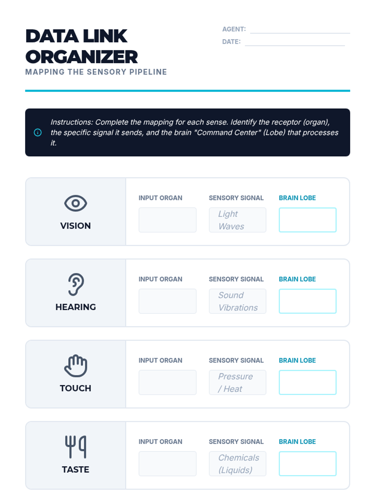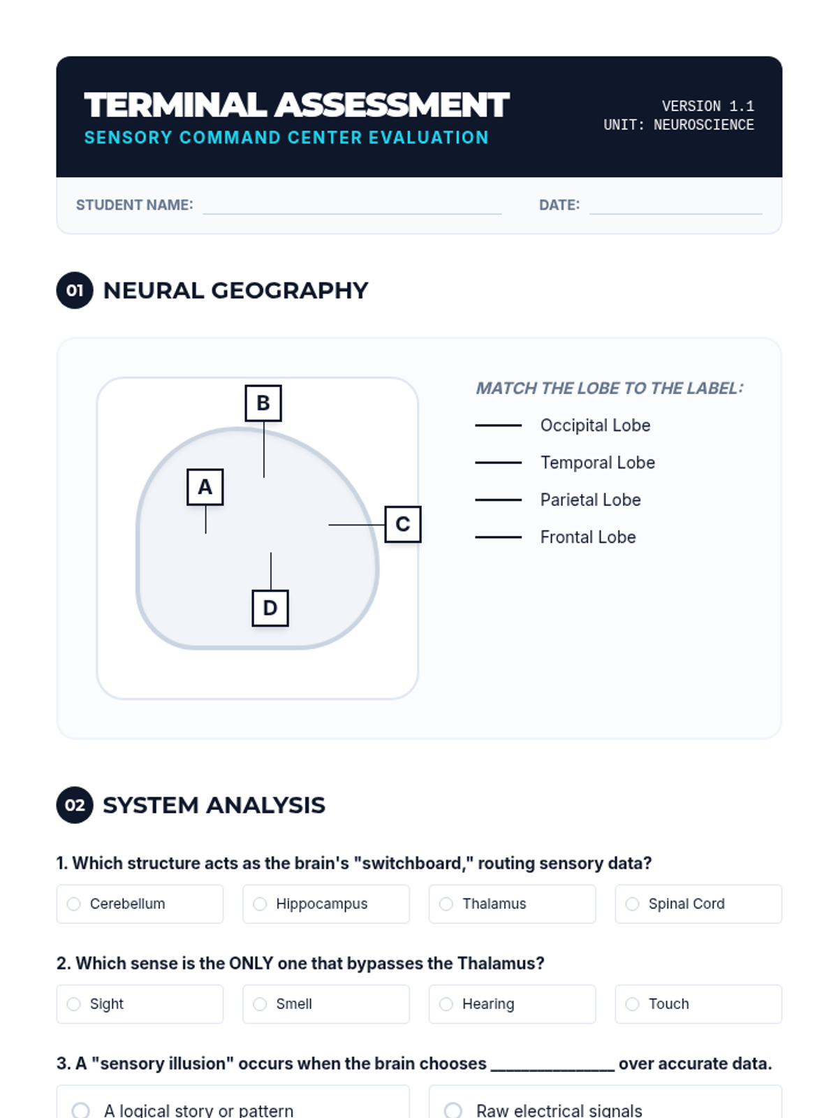 A comprehensive lesson exploring how the five senses collect data and how the brain processes that information to create our perception of the world. Students will map the neural pathways from organ to brain and identify specific brain regions responsible for each sense.