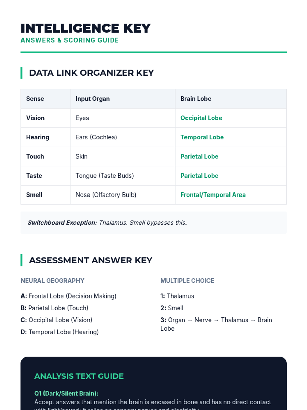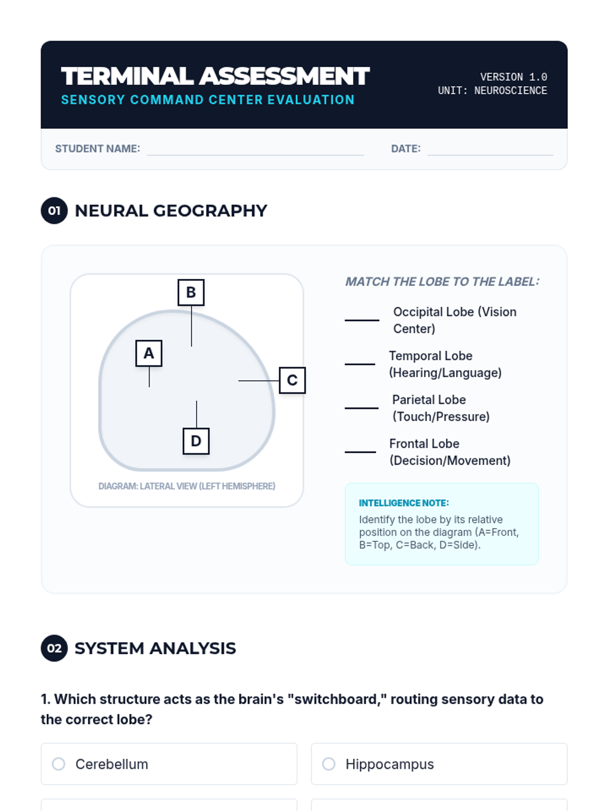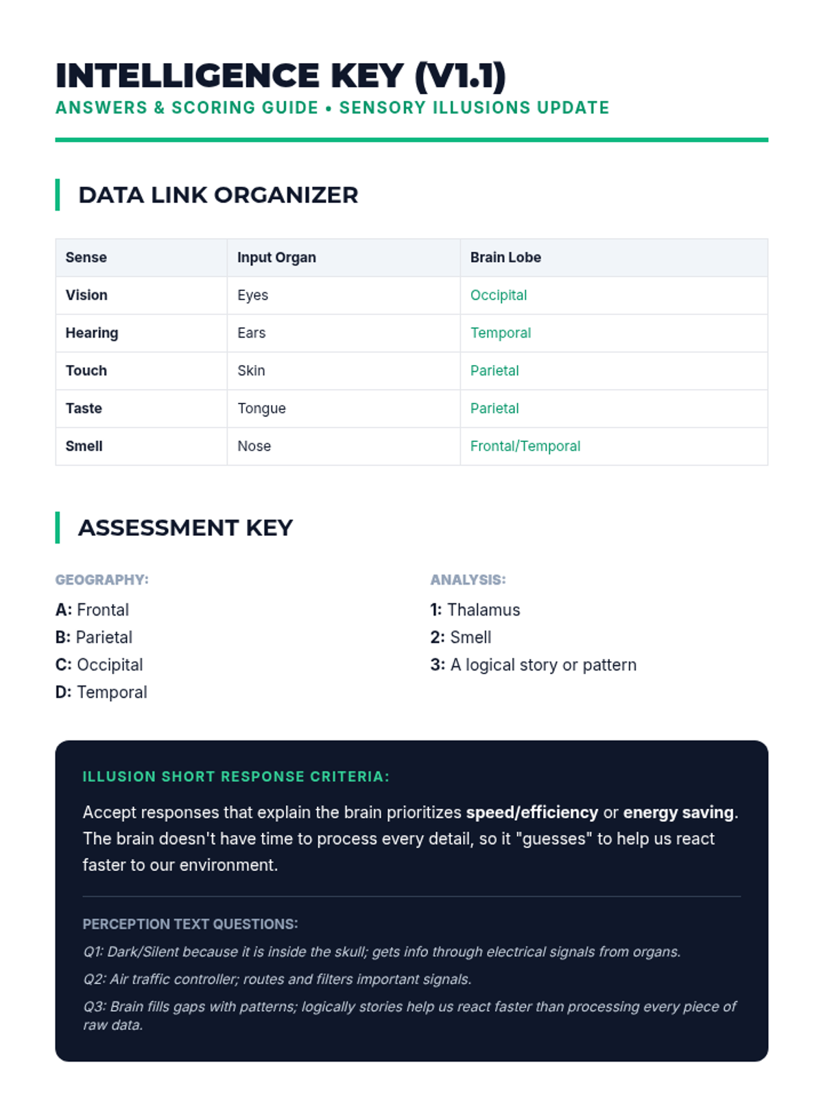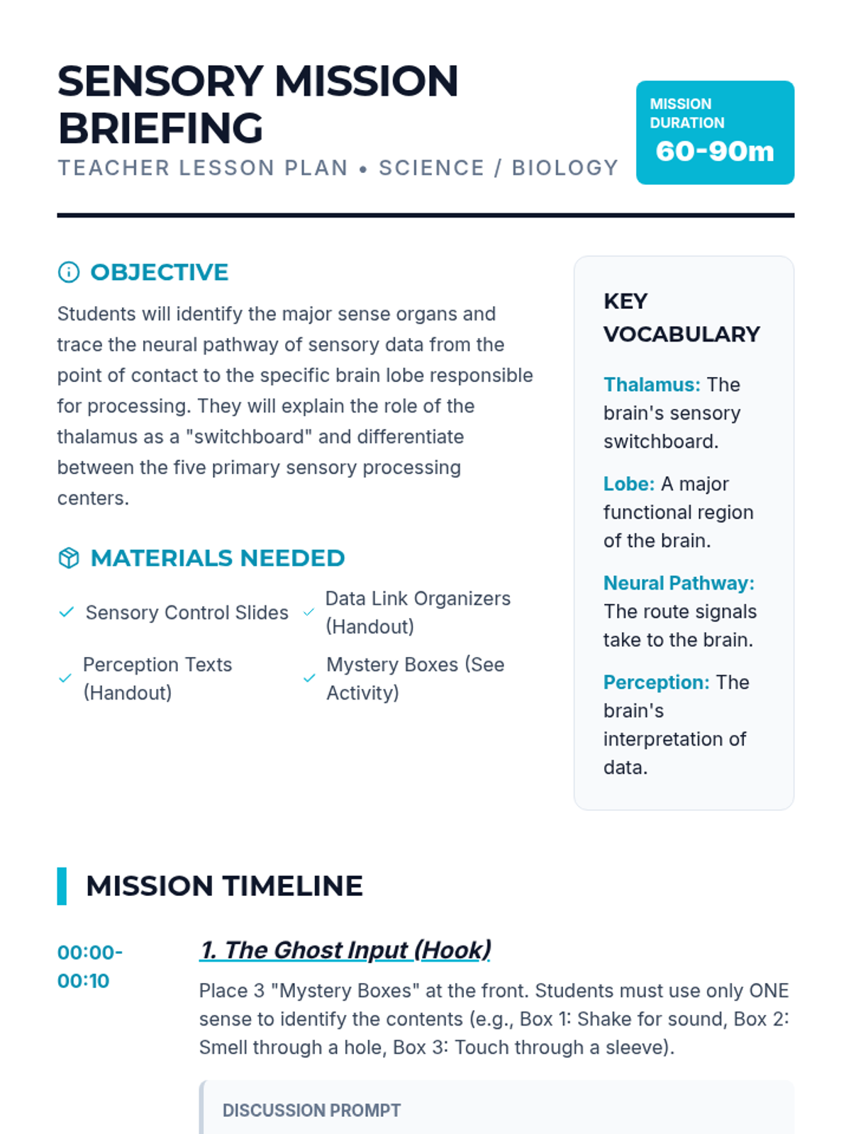 A comprehensive lesson exploring how the five senses collect data and how the brain processes that information to create our perception of the world. Students will map the neural pathways from organ to brain and identify specific brain regions responsible for each sense.