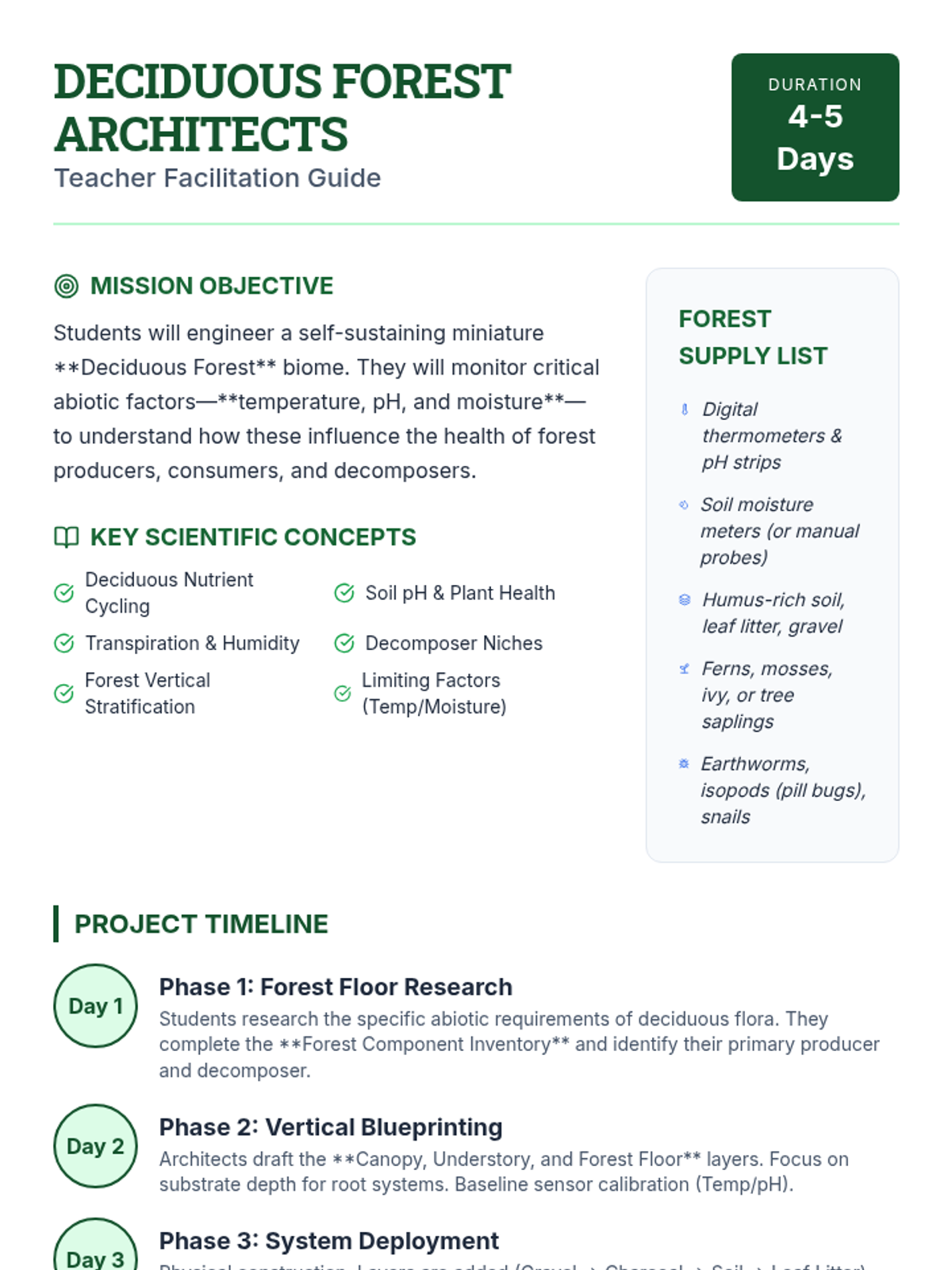 Students become 'Ecosystem Architects' to design and build a miniature biome, identifying biotic and abiotic factors and their complex interactions. This hands-on project-based lesson covers ecosystem components, energy flow, and environmental balance.