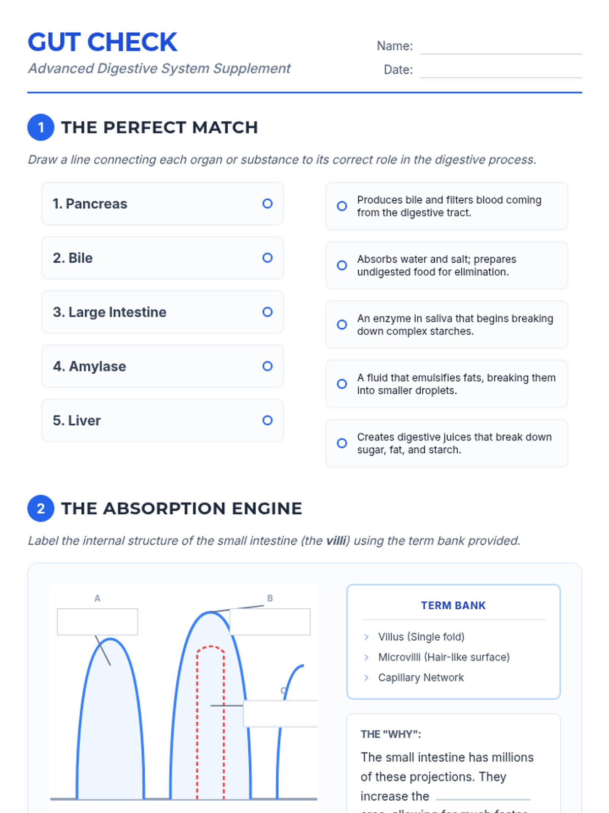 A set of supplementary materials for students who finish their digestive system studies early, focusing on the specific functions of organs and microscopic structures like villi.