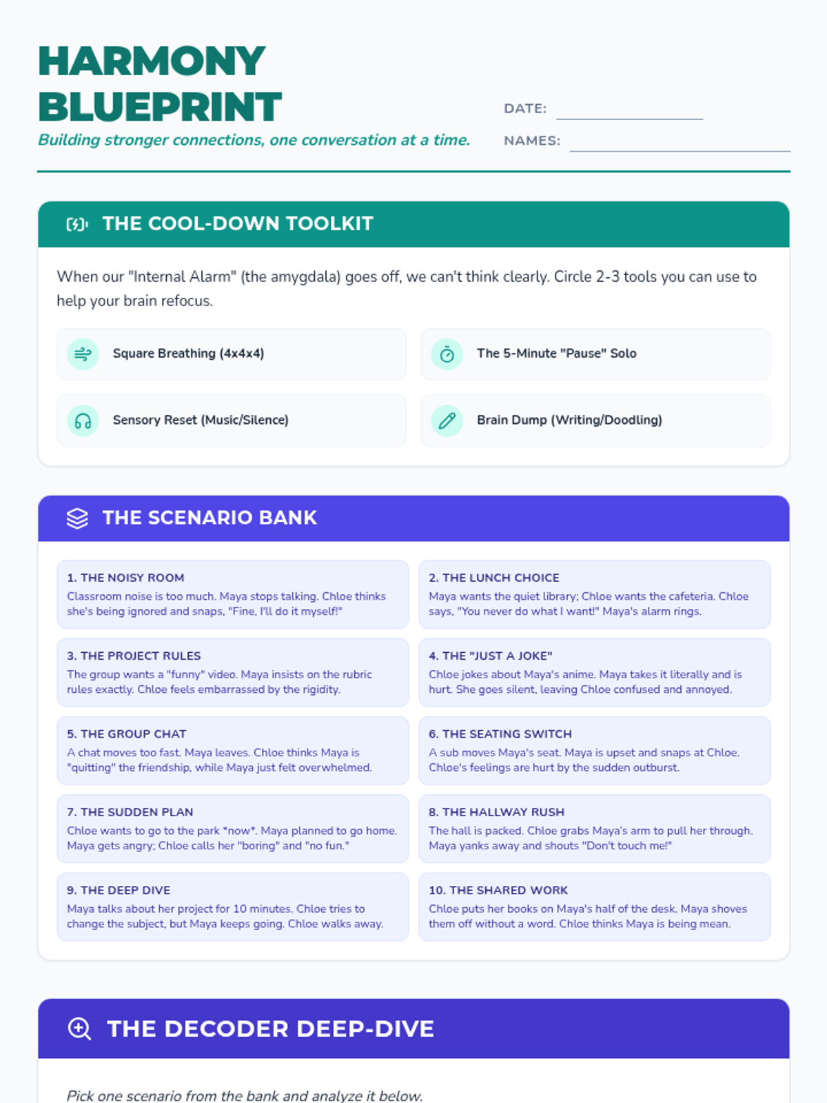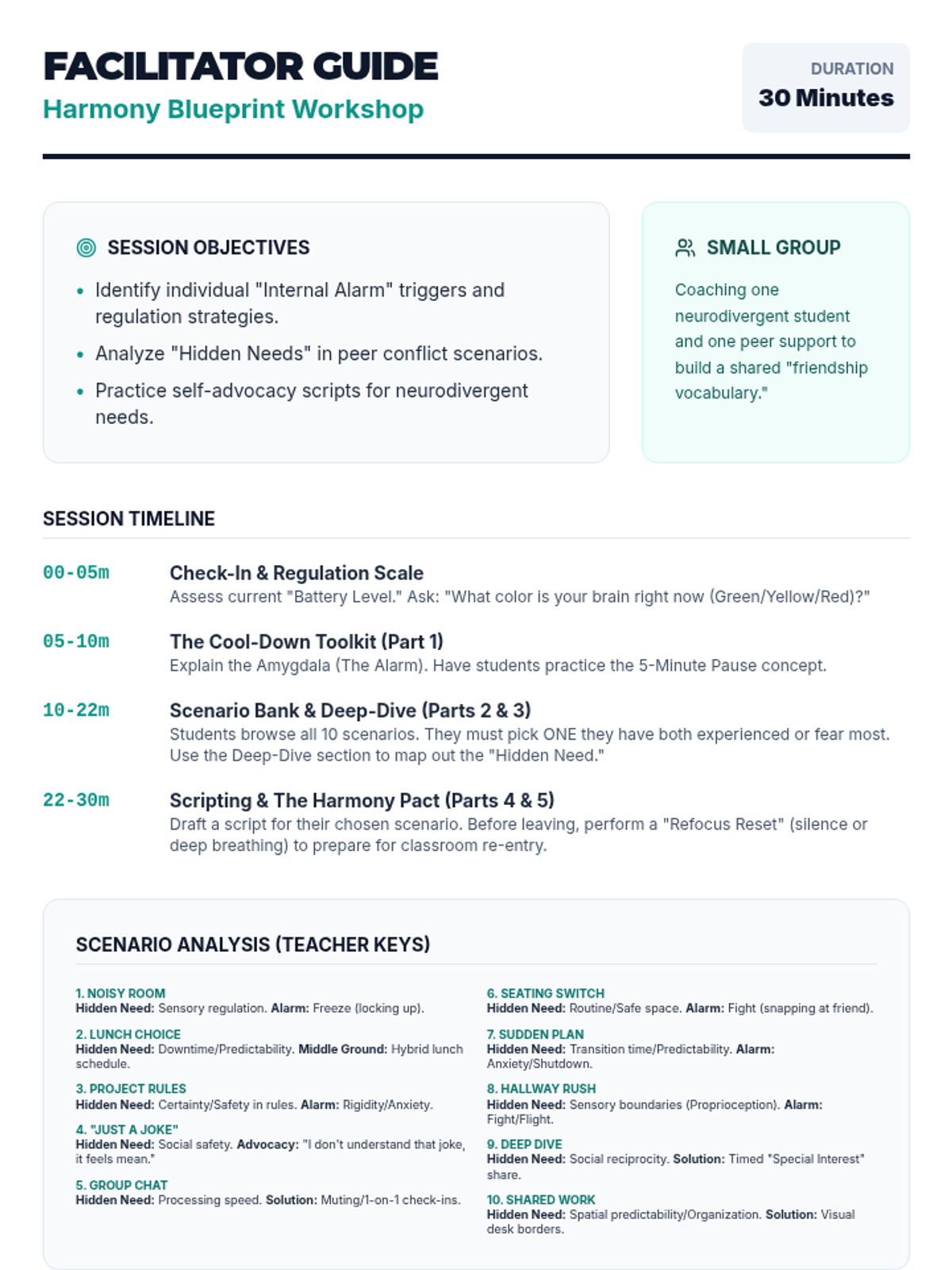 A structured session for two 8th-grade girls focused on navigating peer conflict, emotional regulation, and supportive friendship. Includes a workshop handout and a detailed facilitator guide with specific strategies for neurodivergent students.
