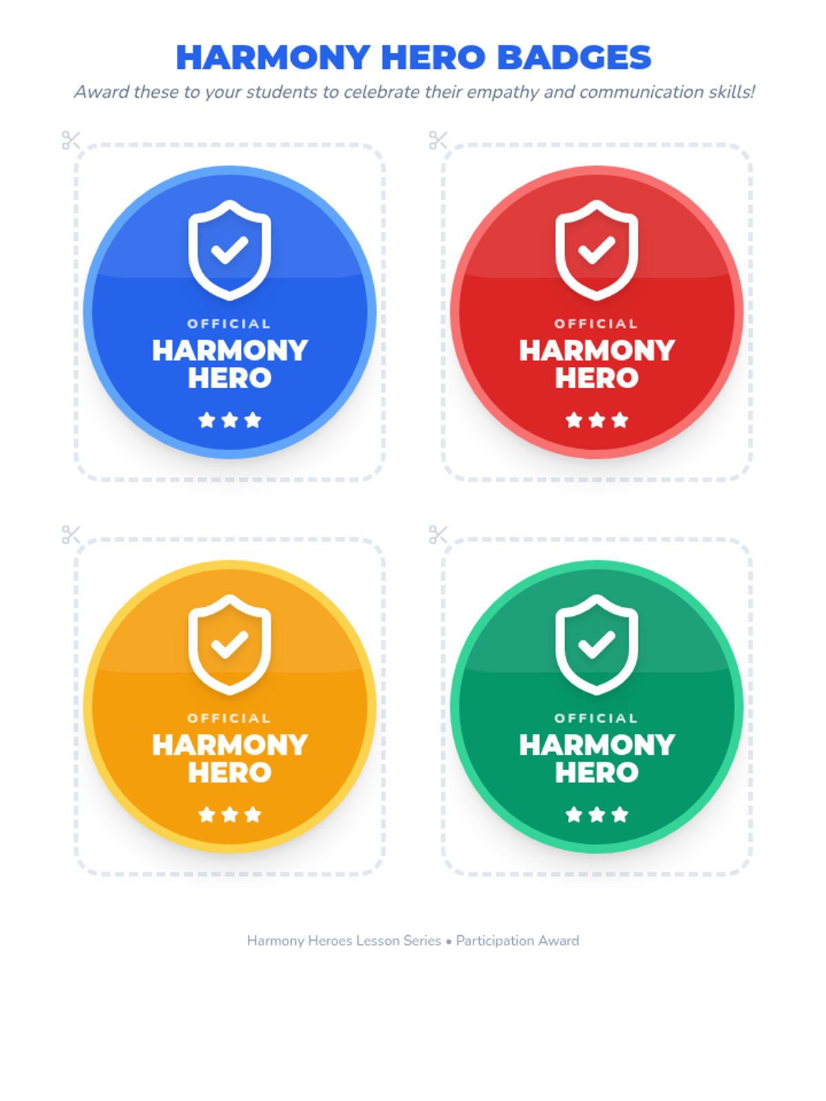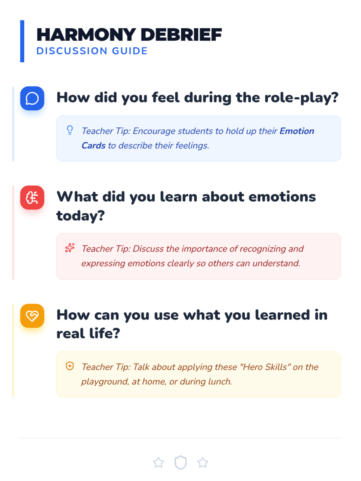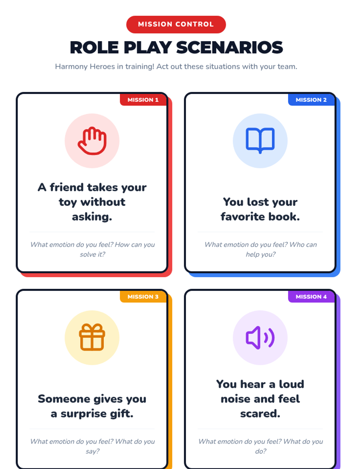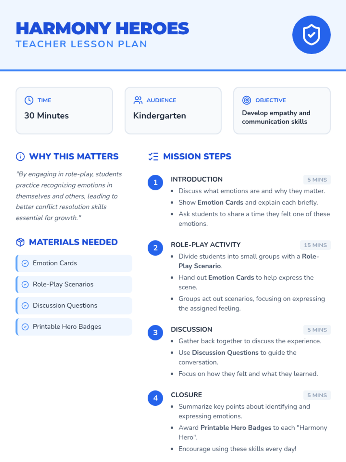 A Kindergarten social-emotional learning lesson where students learn to identify emotions and resolve conflicts through role-play and empathy-building activities to become 'Harmony Heroes'.