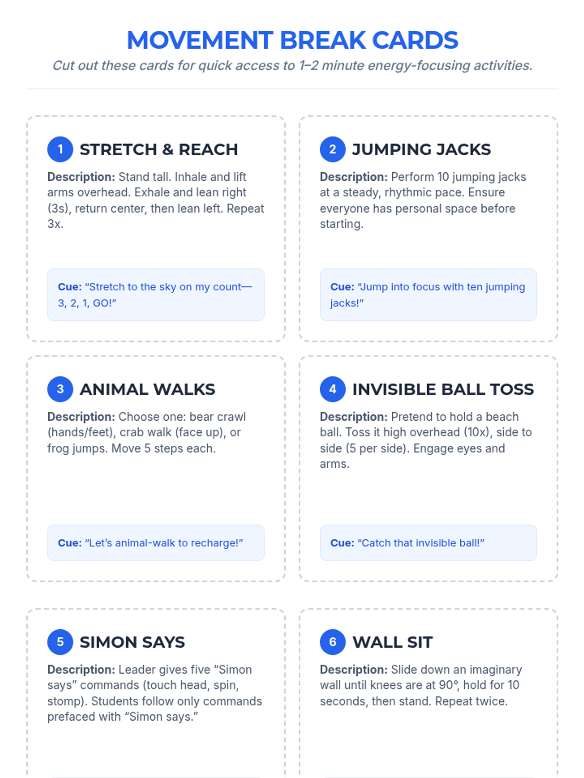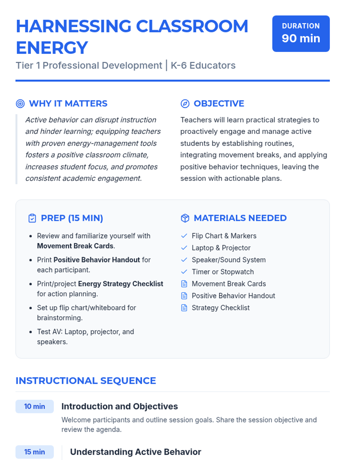 A 90-minute Tier 1 professional development session for K-6 teachers on engaging and managing active students through proactive routines and movement.