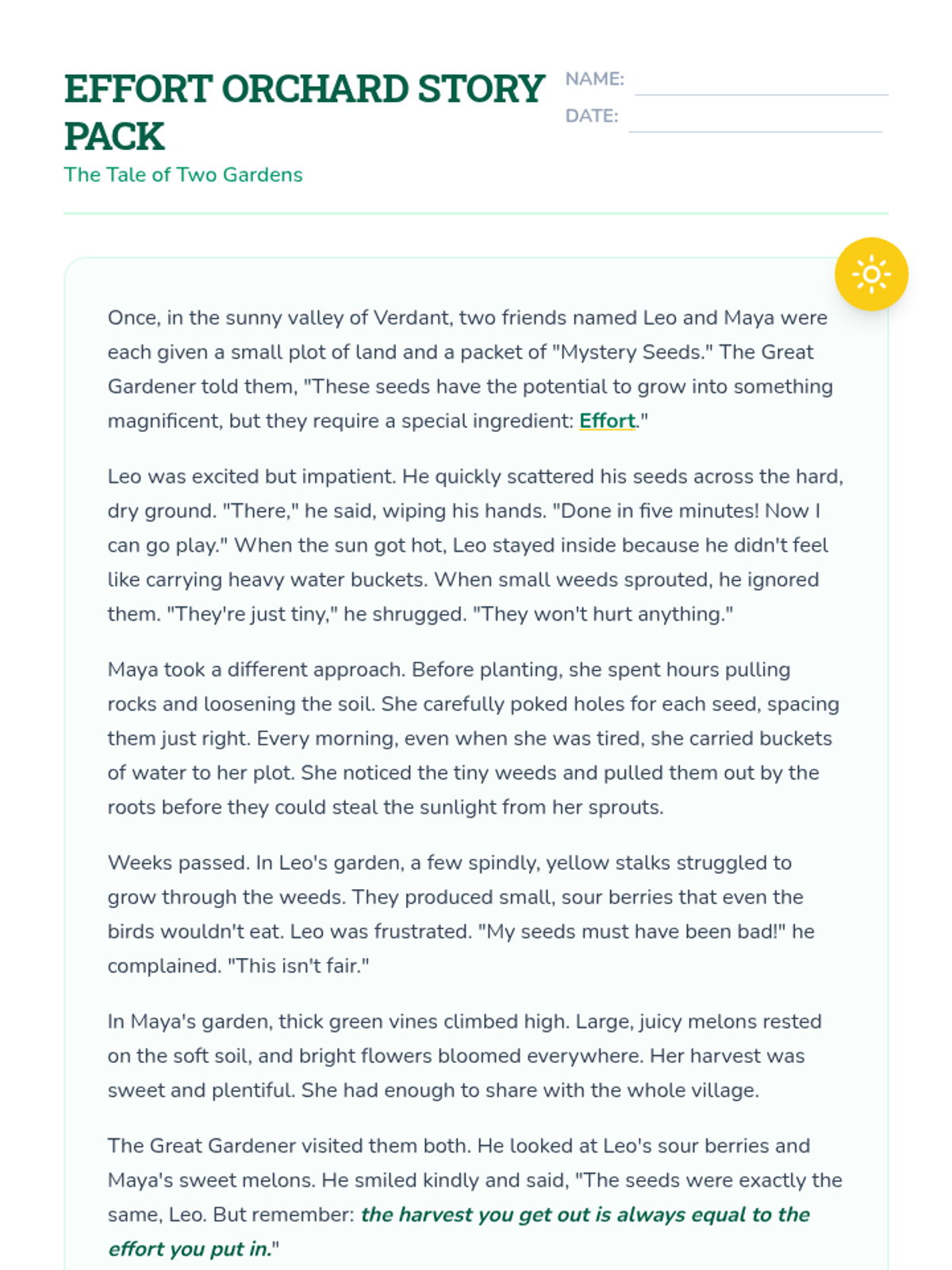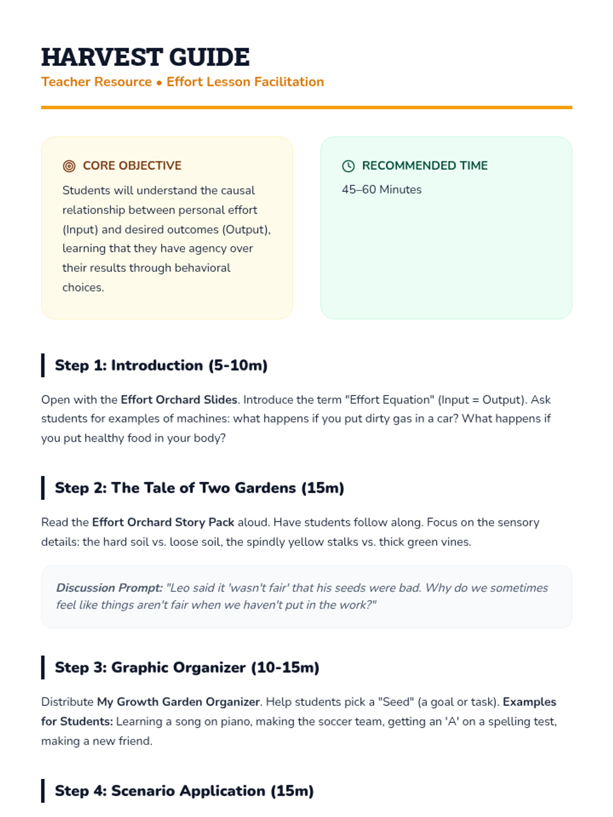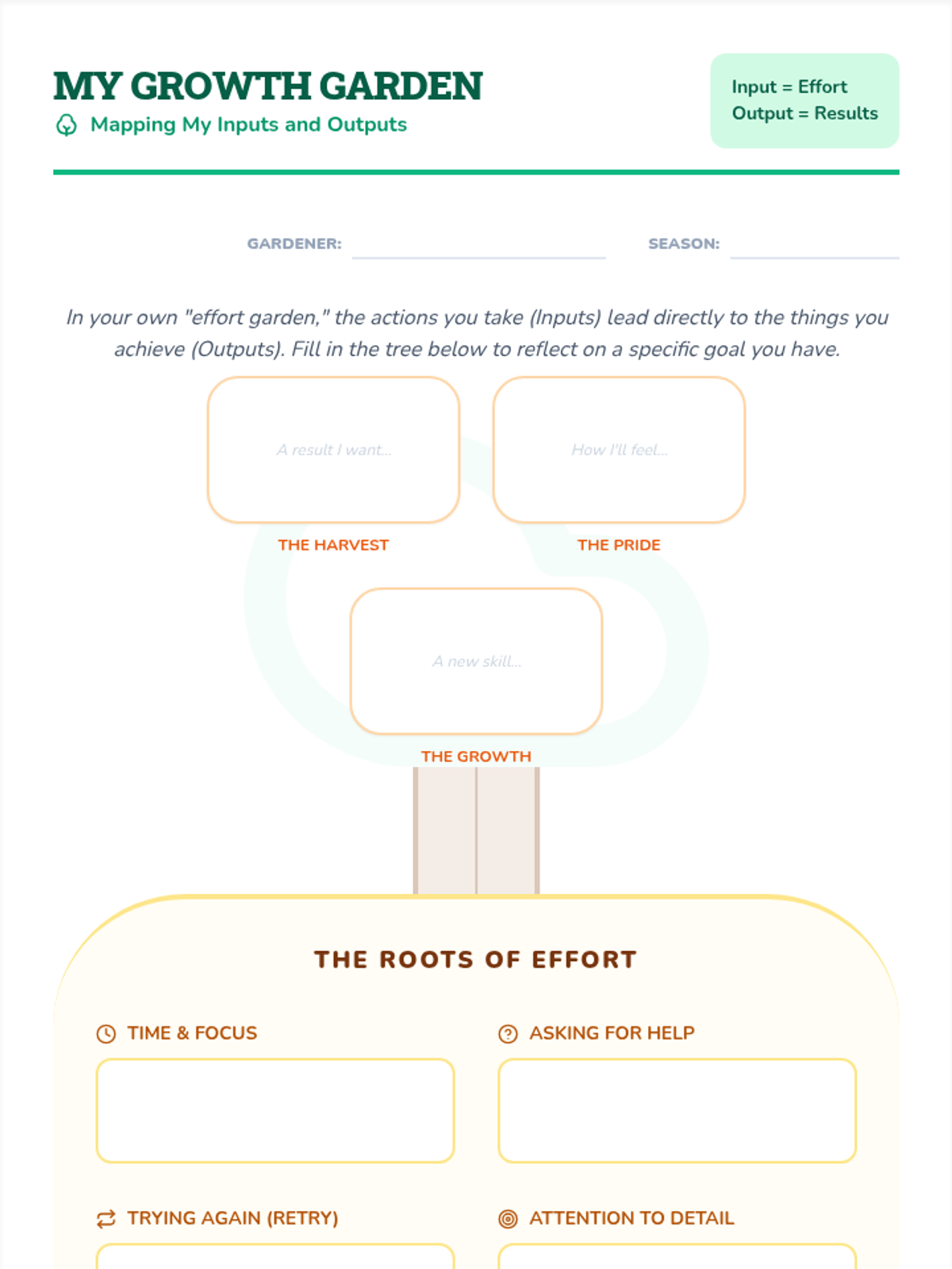A counseling lesson focused on the principle that 'you get out what you put in.' Students explore the concept of effort through a metaphorical story about two gardens, reflecting on their own habits and applying effort strategies to real-life scenarios.