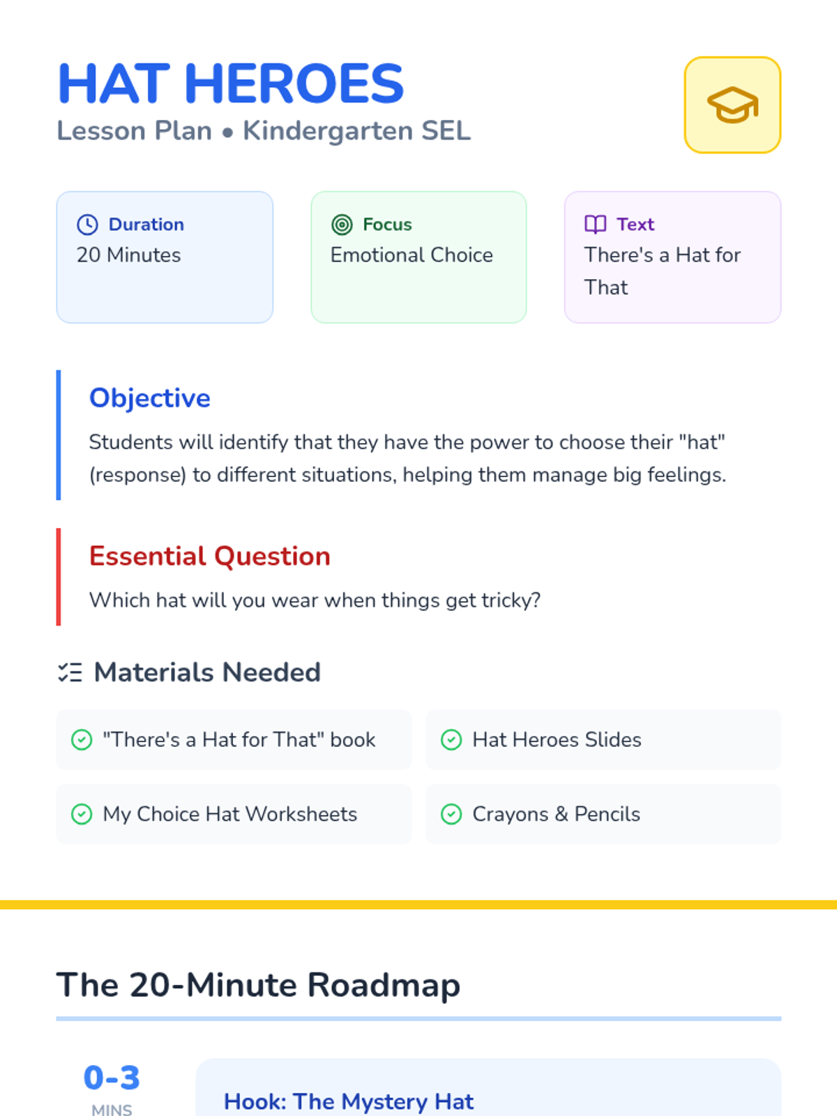 A 20-minute SEL lesson for kindergarteners exploring emotional choice and perspective-taking based on 'There\'s a Hat for That' by Dr. Kevin J. Fleming.
