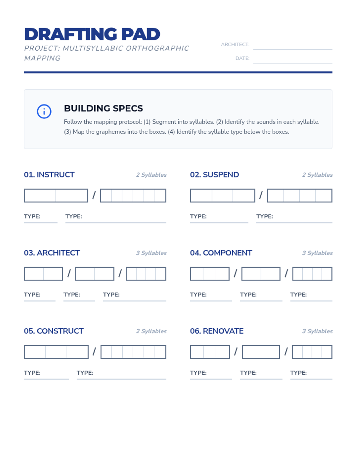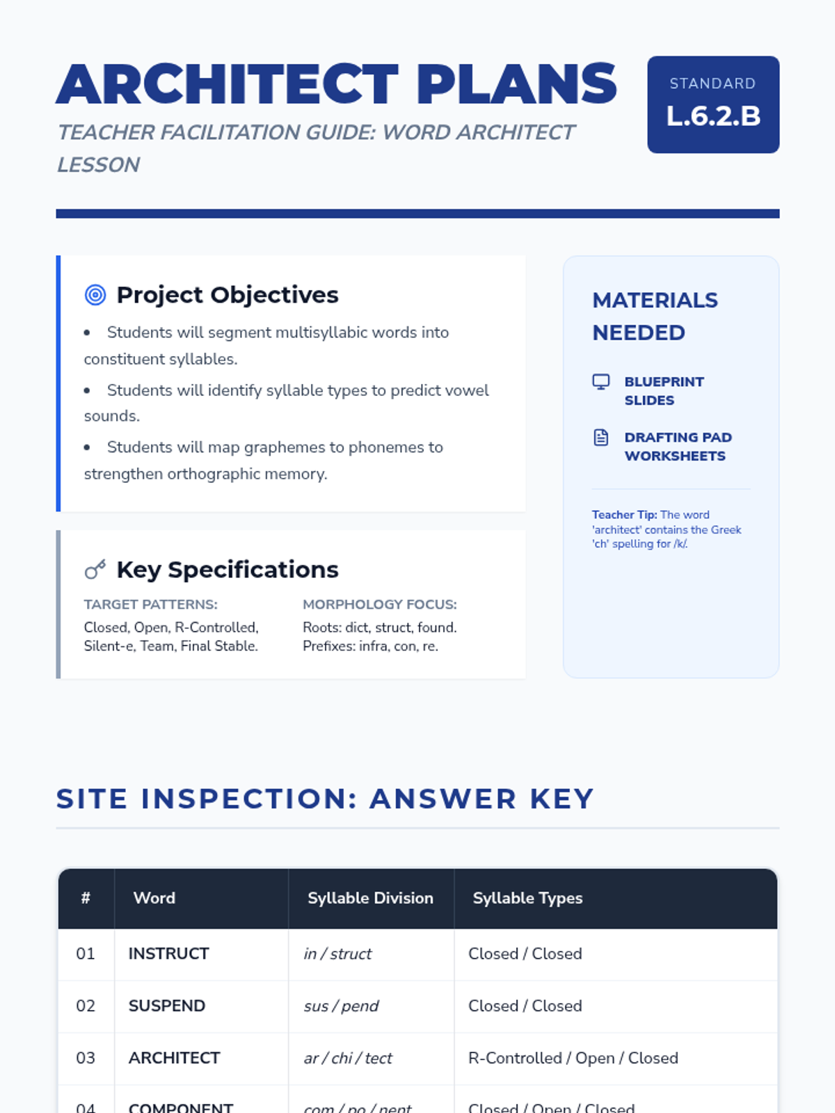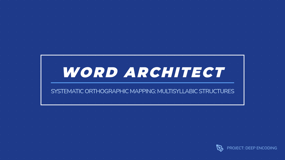 A middle school spelling lesson focusing on orthographic mapping for multisyllabic words using an architectural blueprint theme. Students learn to break down complex words into syllables and map sounds to graphemes for permanent storage.