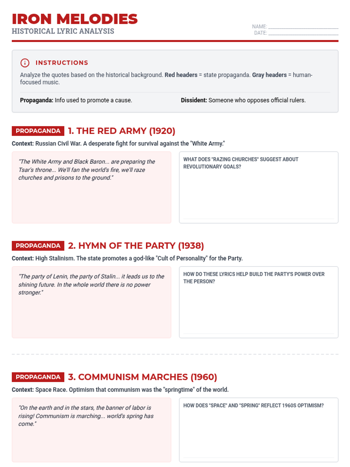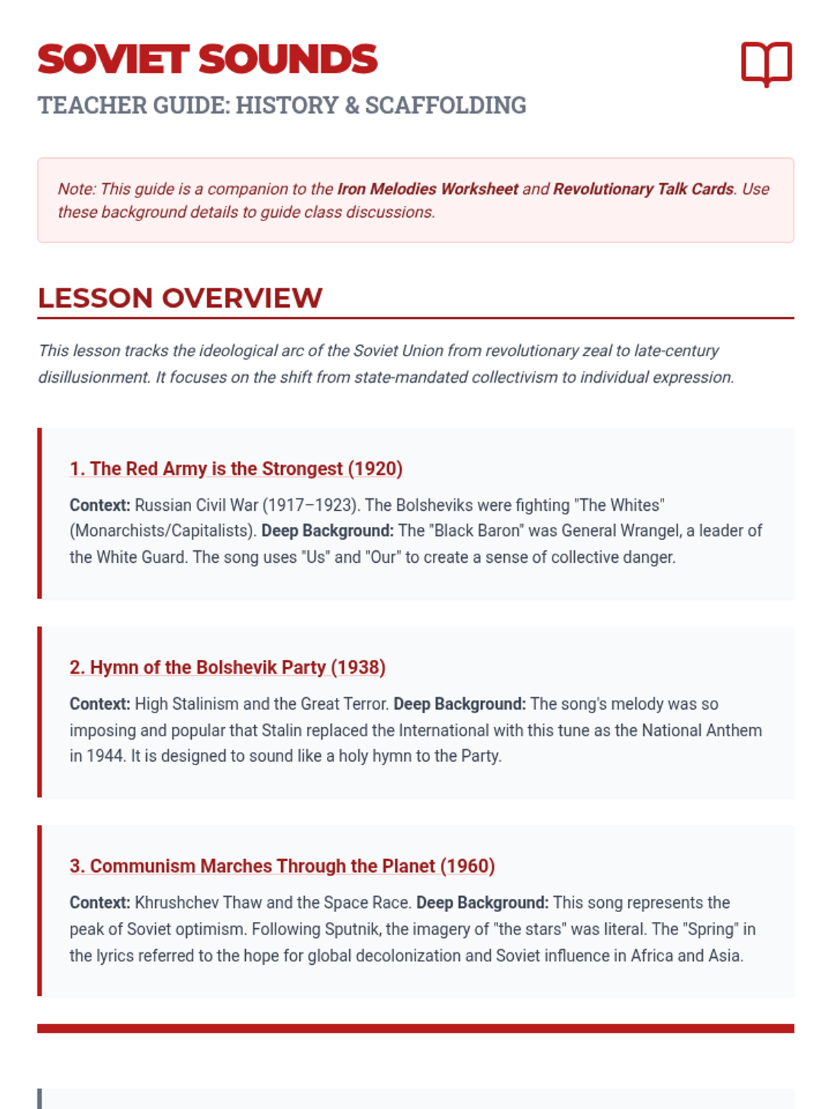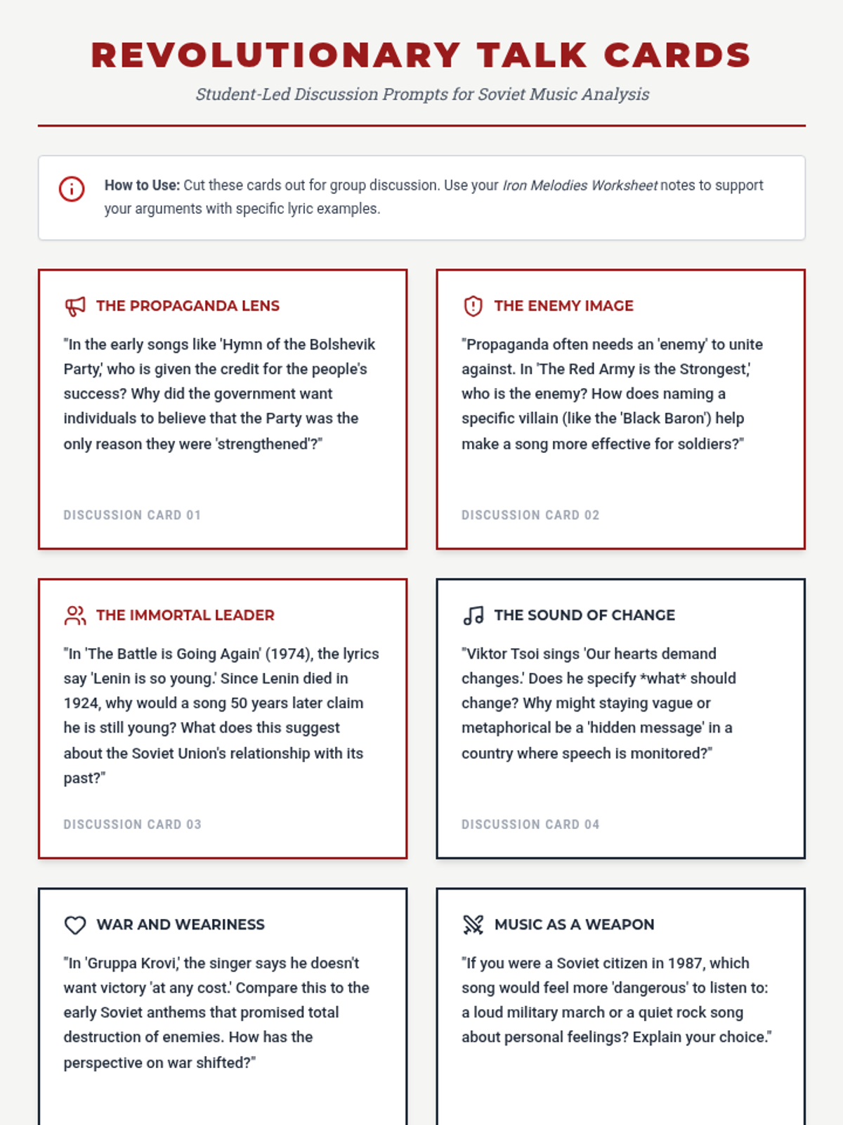 A deep dive into Soviet history through the lens of music, comparing early revolutionary propaganda with the dissident rock of the late 20th century. Students analyze lyrics to uncover state-sanctioned messages and the calls for change that eventually echoed through the USSR.