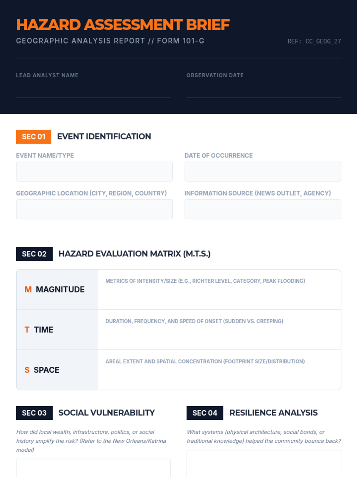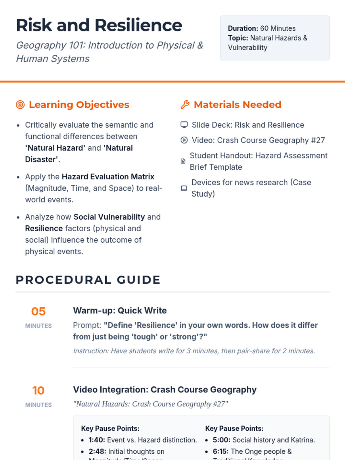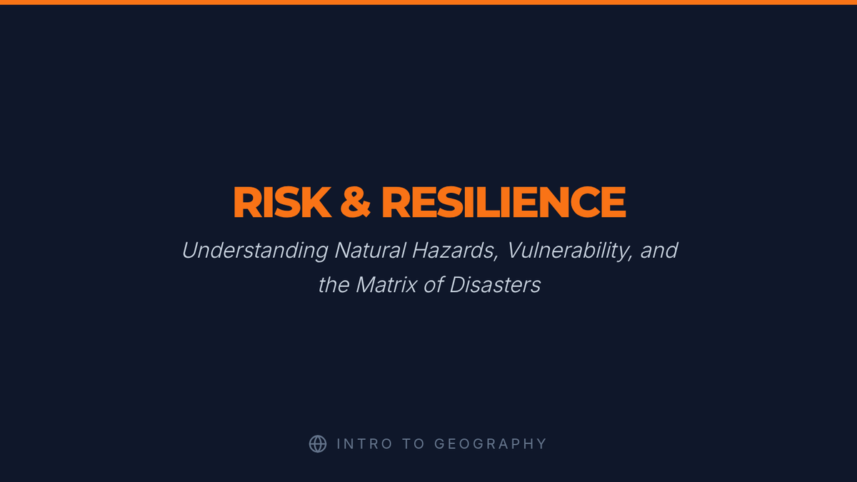An undergraduate introductory geography lesson exploring the critical distinctions between natural hazards and disasters, utilizing the Hazard Evaluation Matrix (Magnitude, Time, Space) and analyzing social vulnerability and resilience.