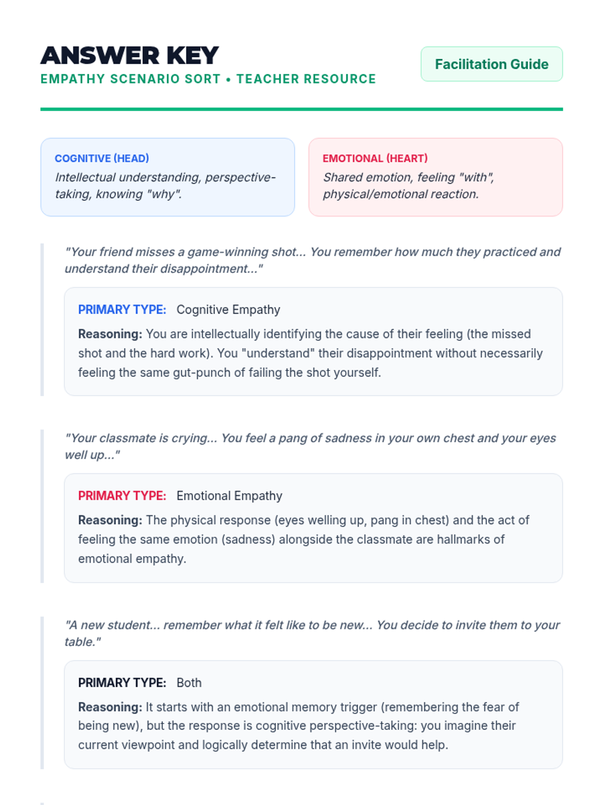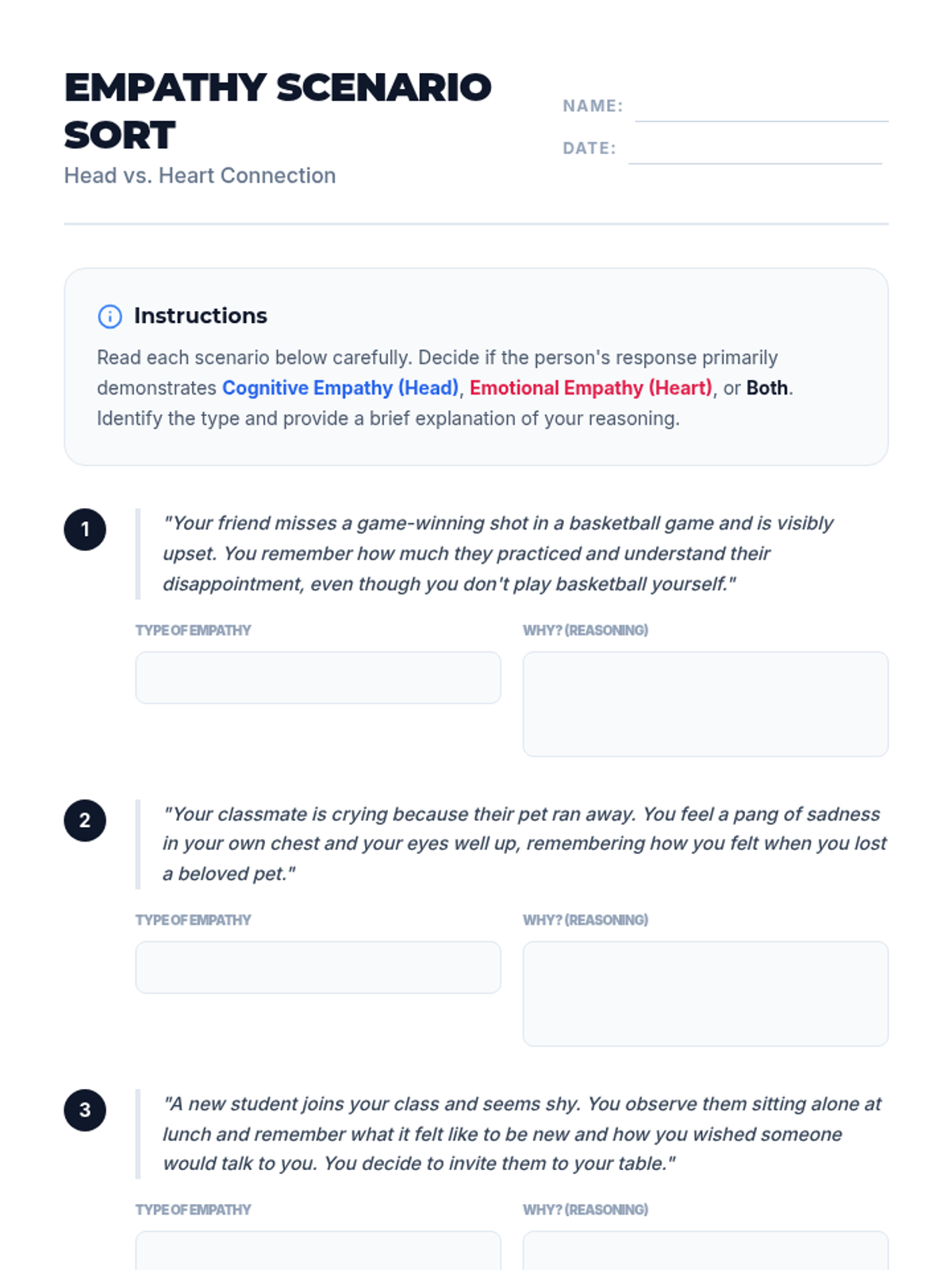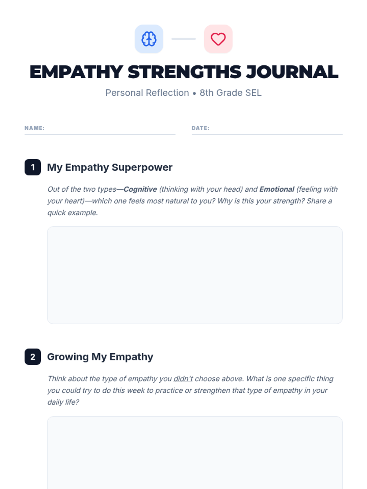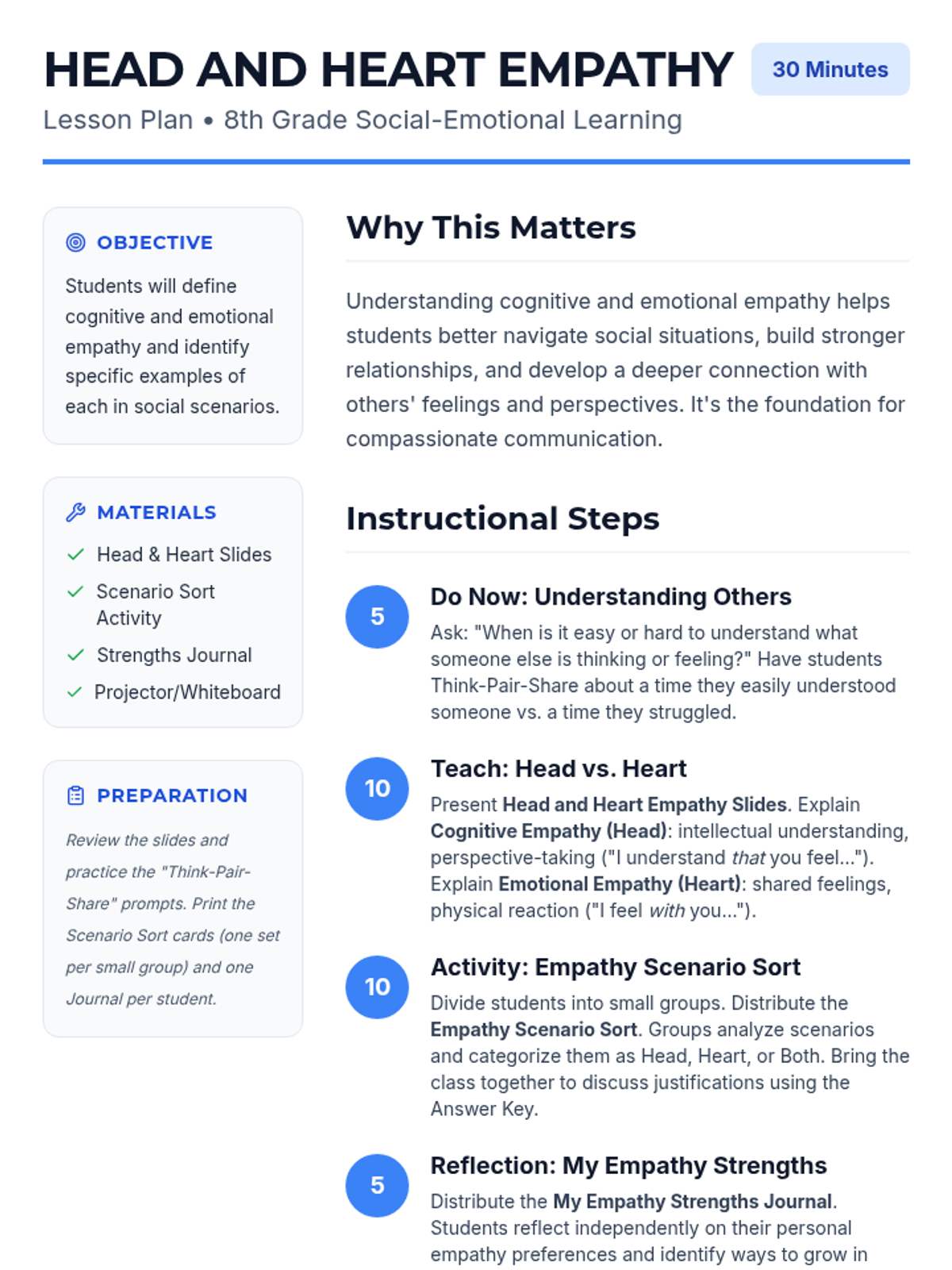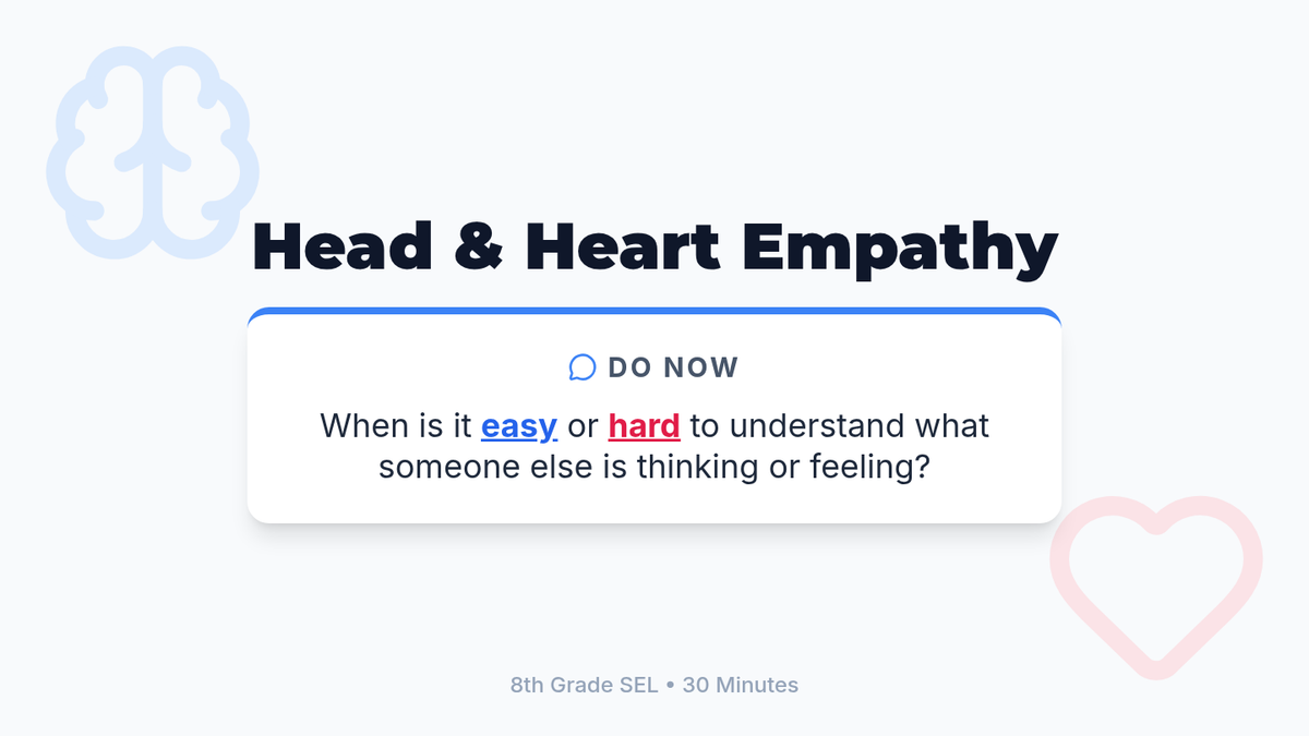 A 30-minute SEL lesson for 8th graders exploring the differences between cognitive and emotional empathy through scenario analysis and personal reflection.
