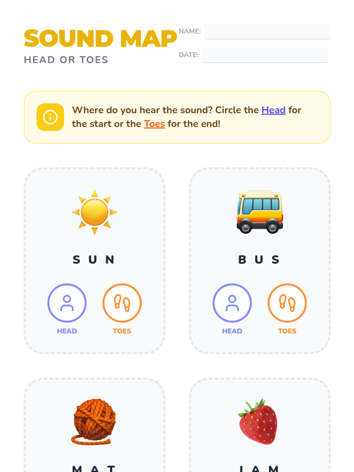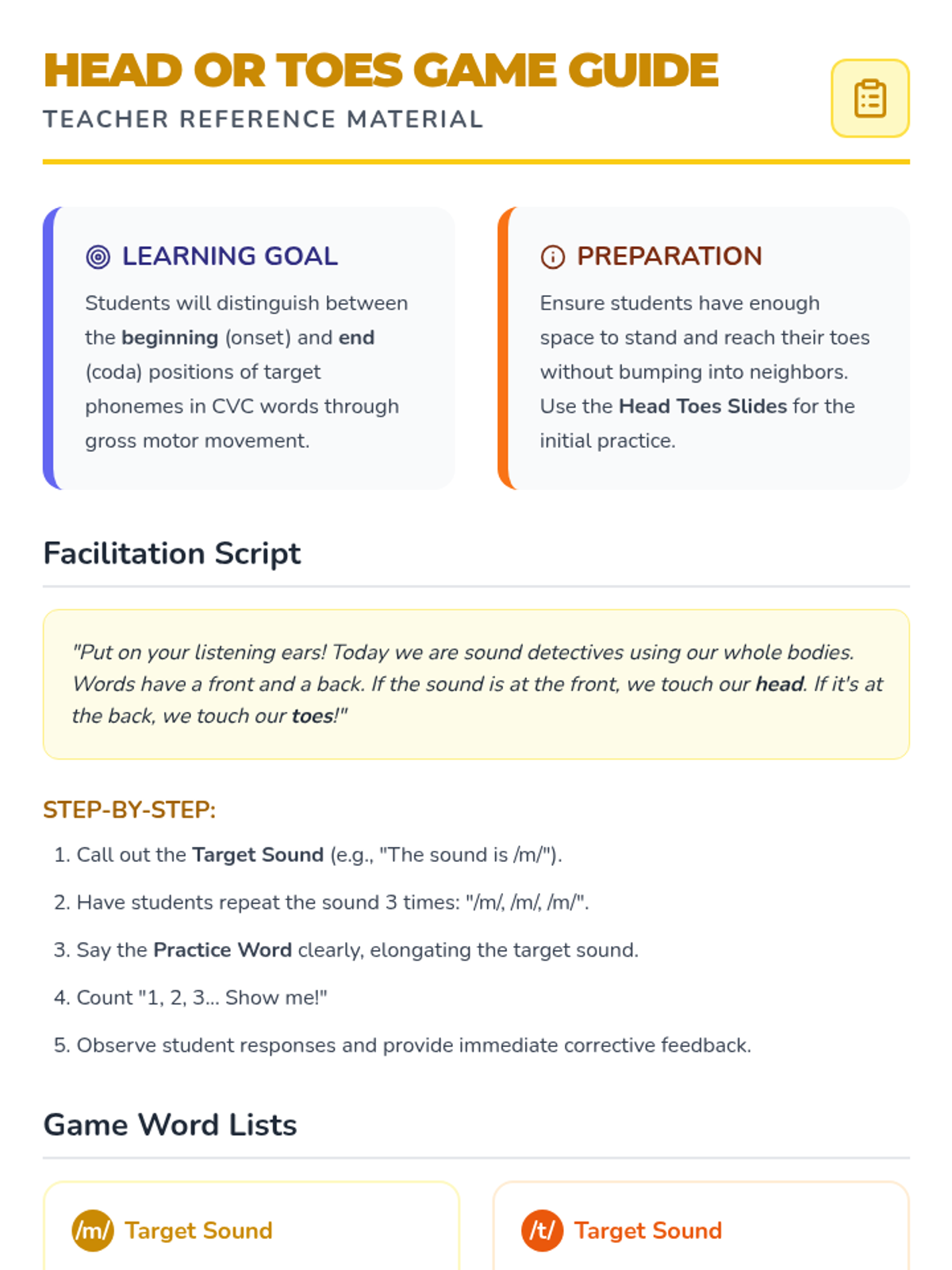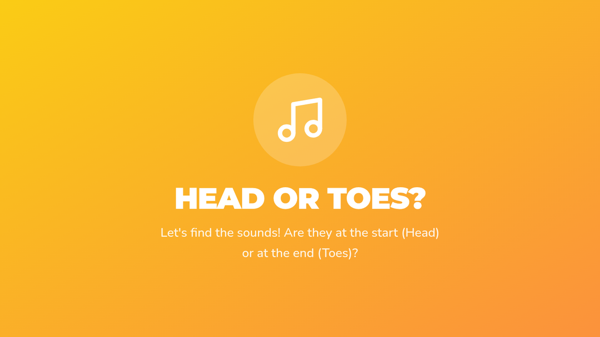 A physical response lesson using body mapping (head and toes) to identify if a target sound is at the beginning or end of a word.
