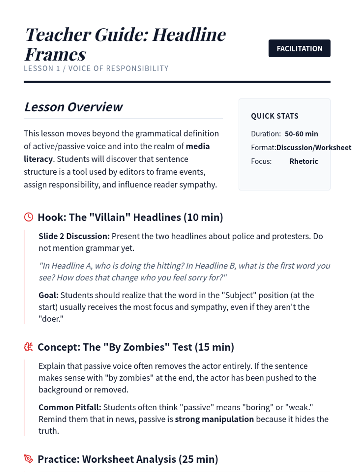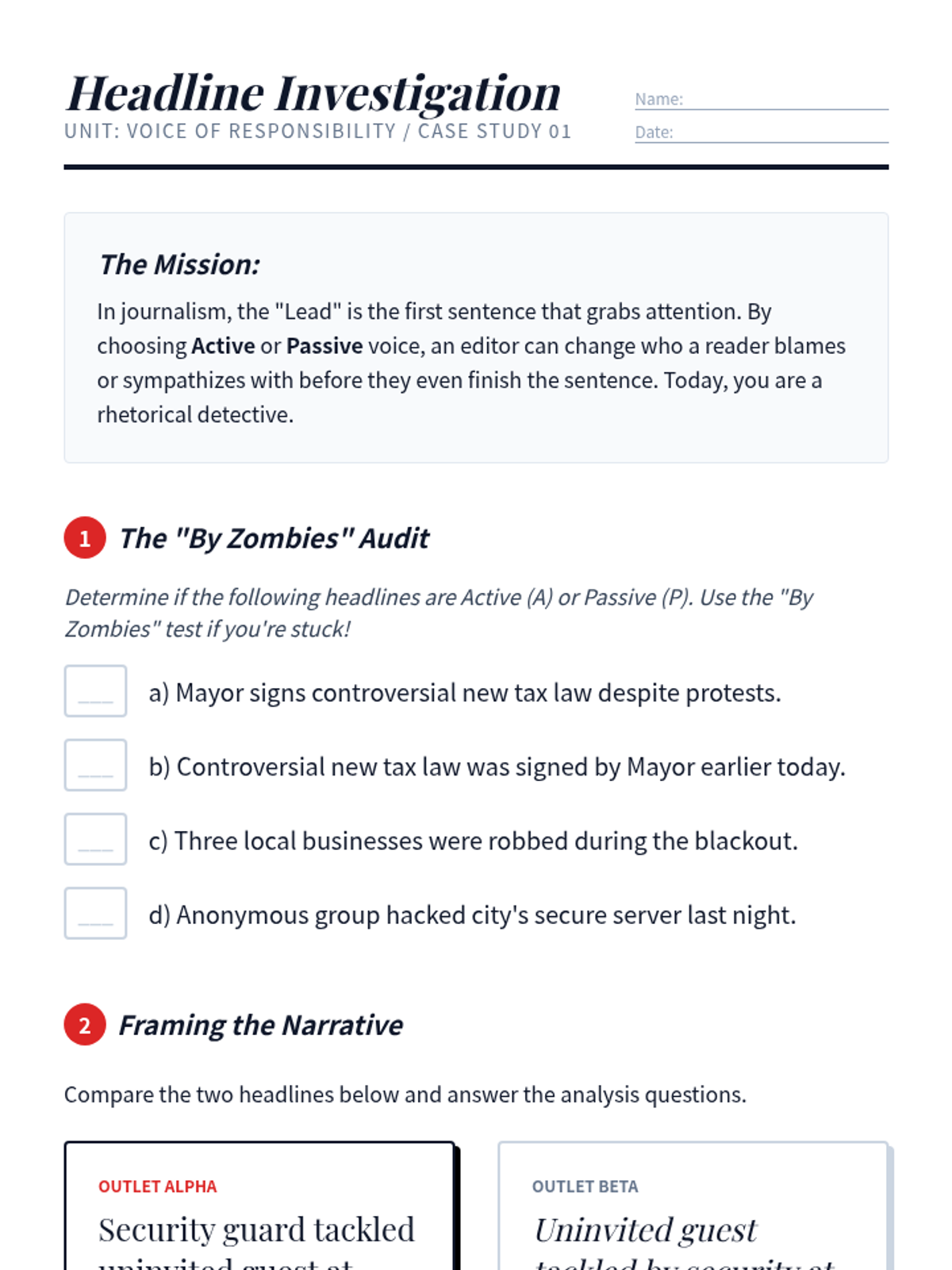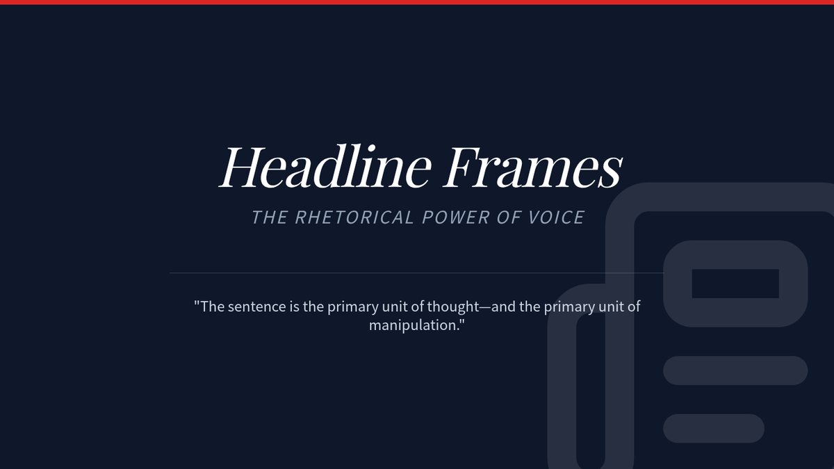 Students analyze how news headlines use voice to frame narratives and shift reader focus between different actors in an event.