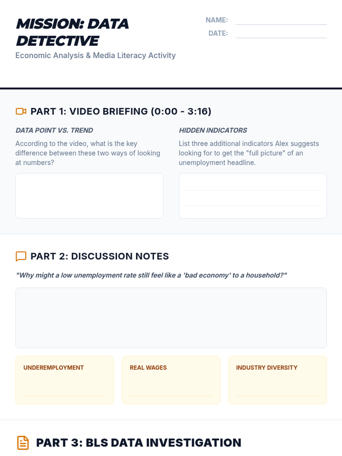 A high school economics and media literacy lesson focused on analyzing economic headlines, interpreting labor data beyond surface-level statistics, and understanding the nuances of the modern job market.