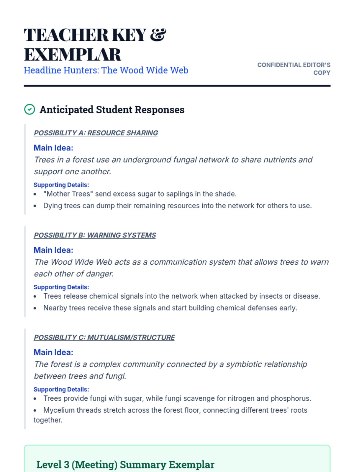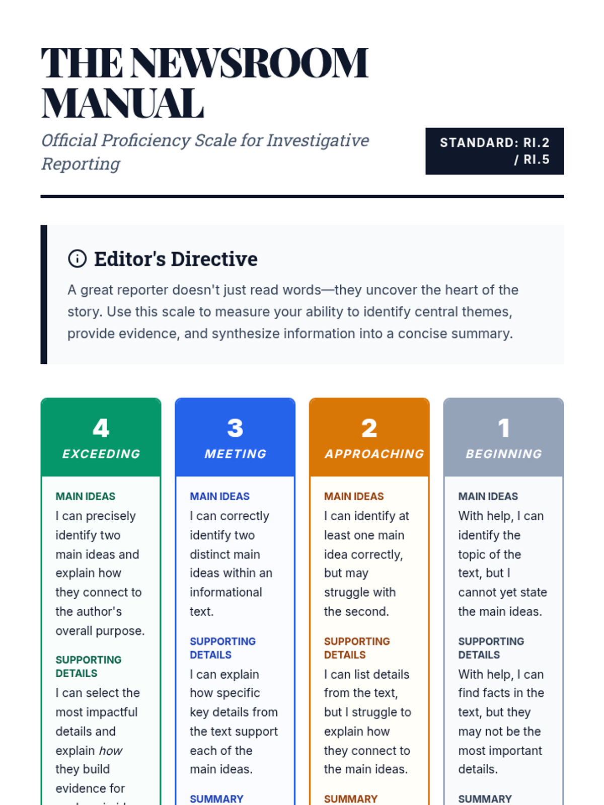 A lesson focused on identifying main ideas, supporting details, and summarizing informational texts using a 4-point proficiency scale.
