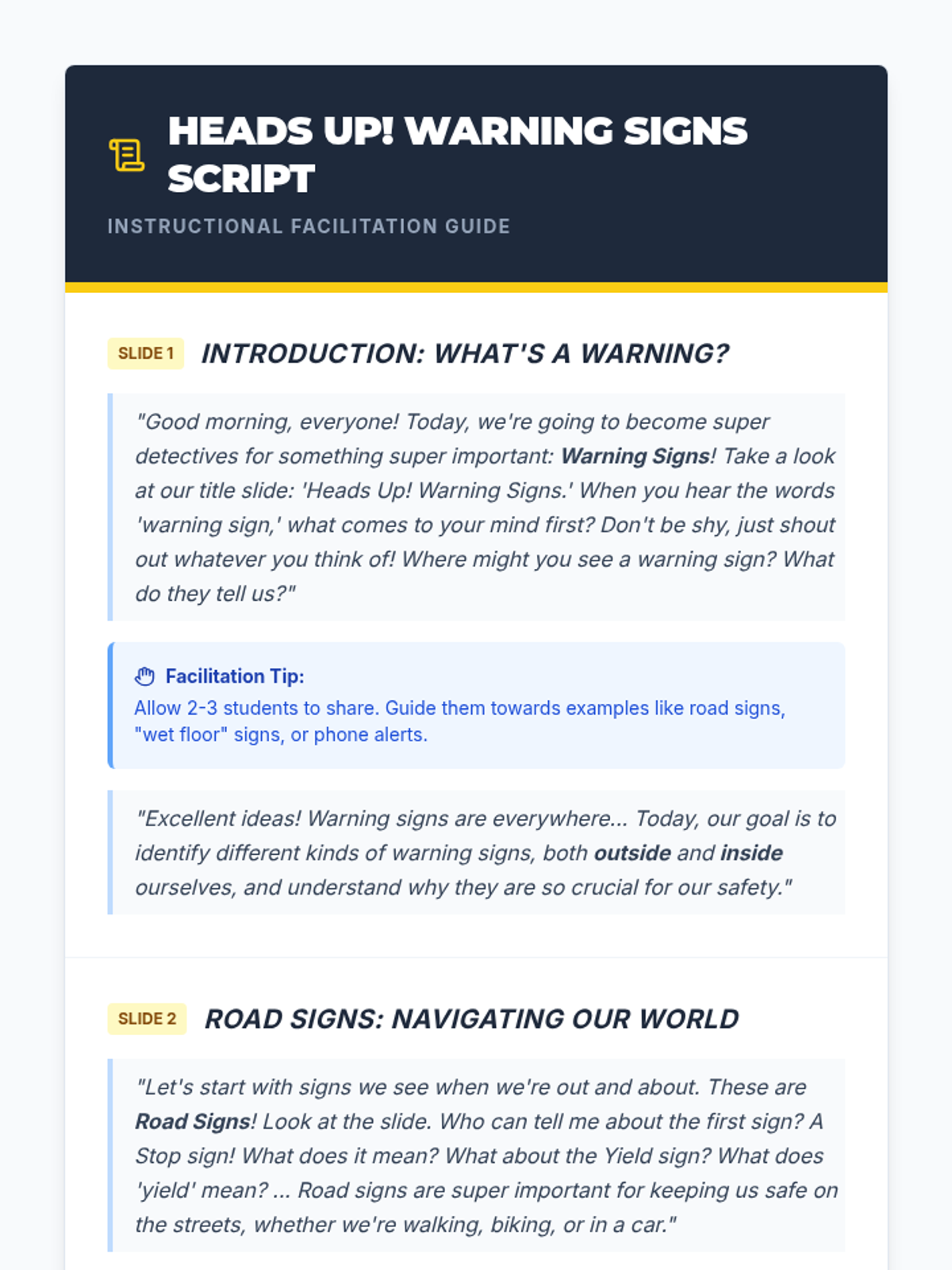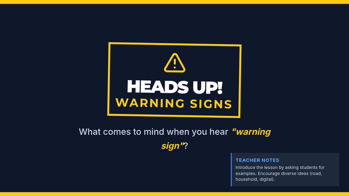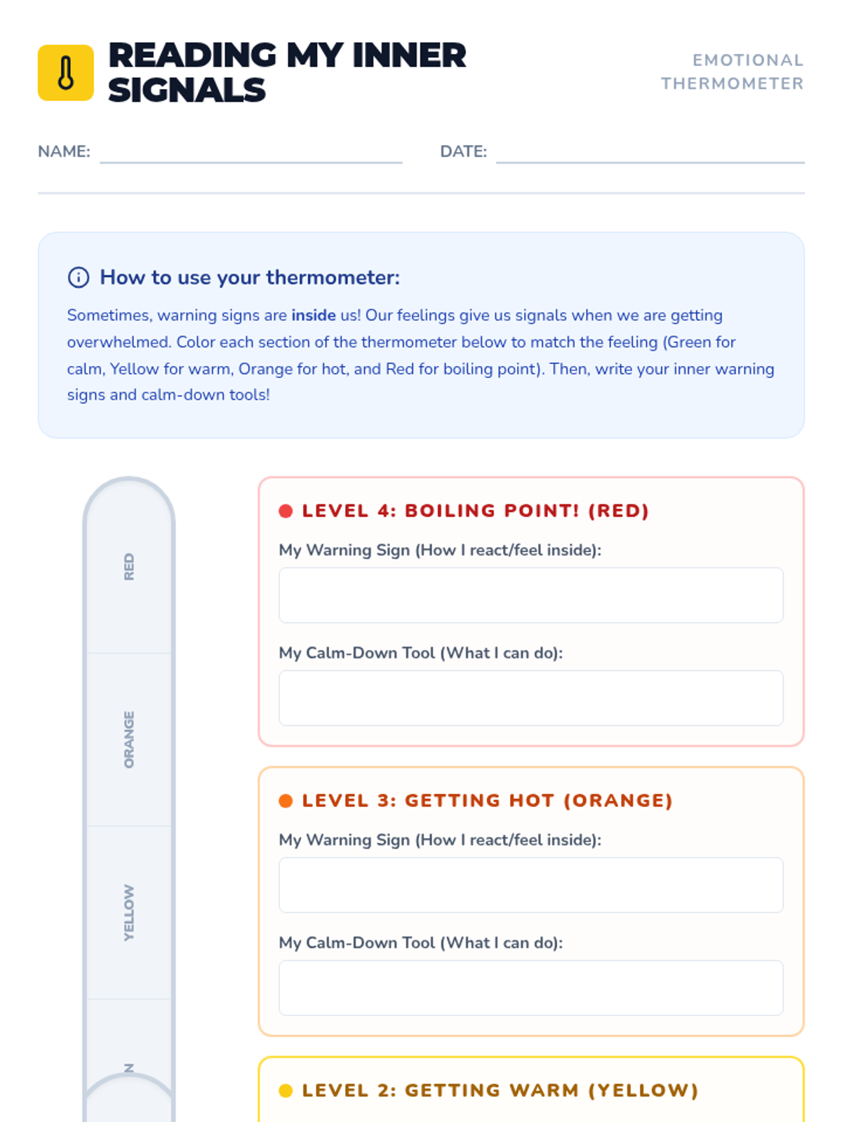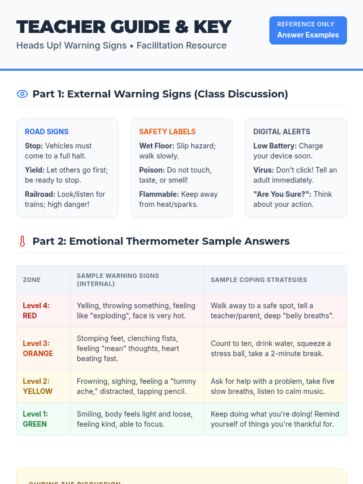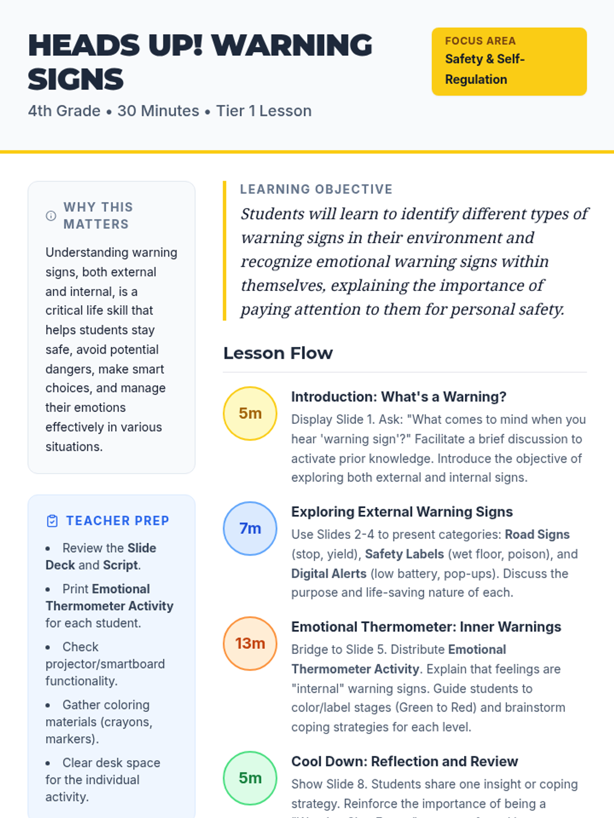 A 30-minute lesson for 4th graders to identify external warning signs (road, safety, digital) and internal emotional warning signs using an 'Emotional Thermometer' activity.