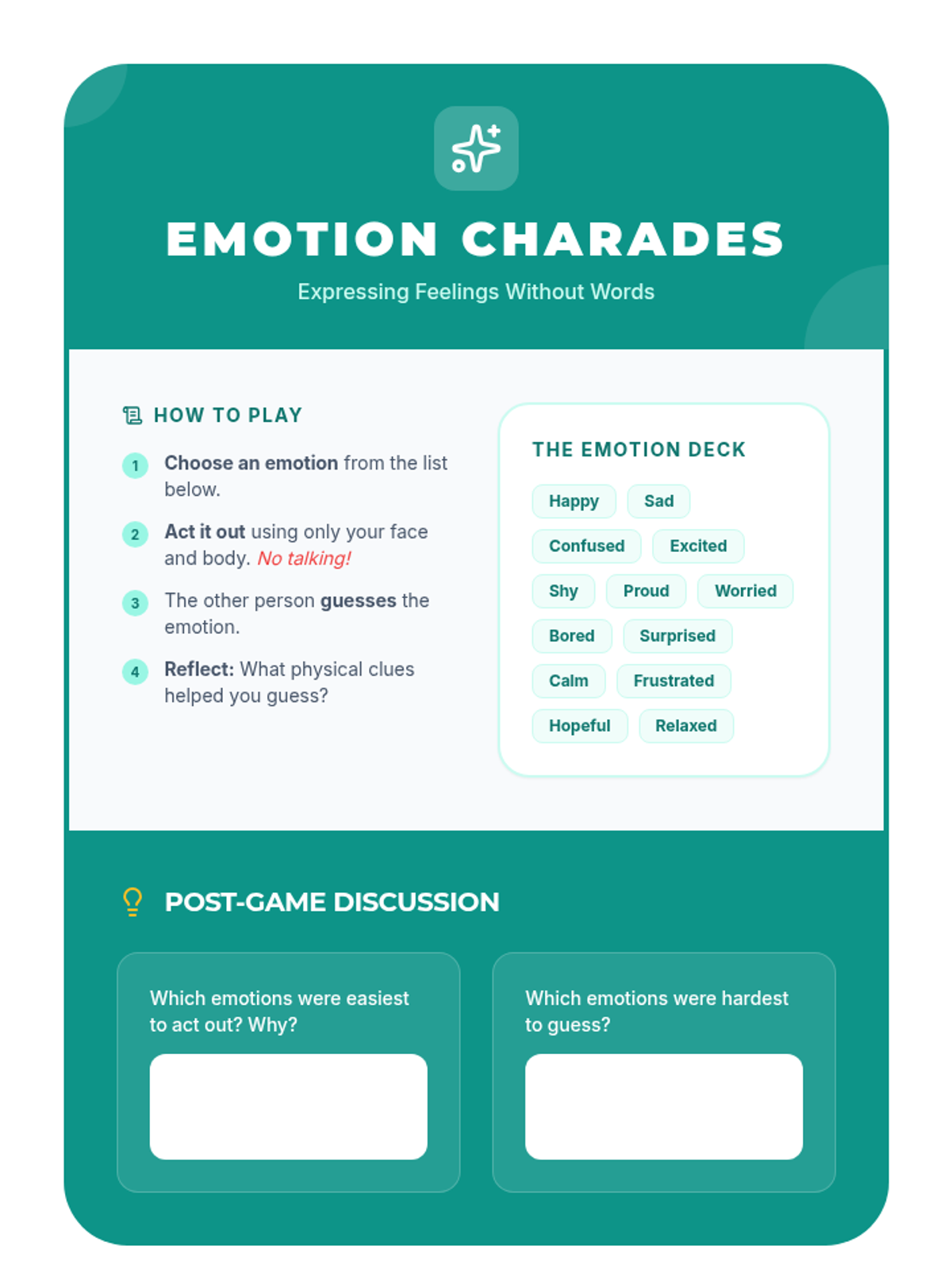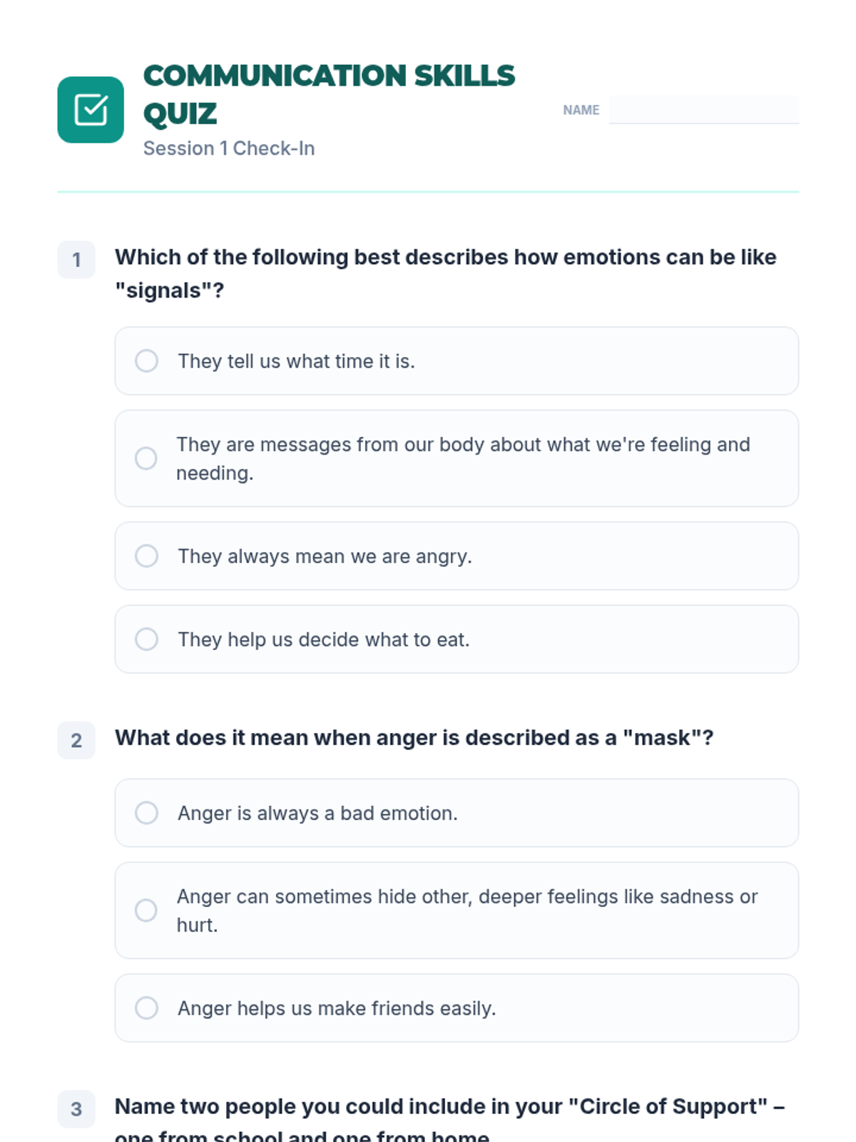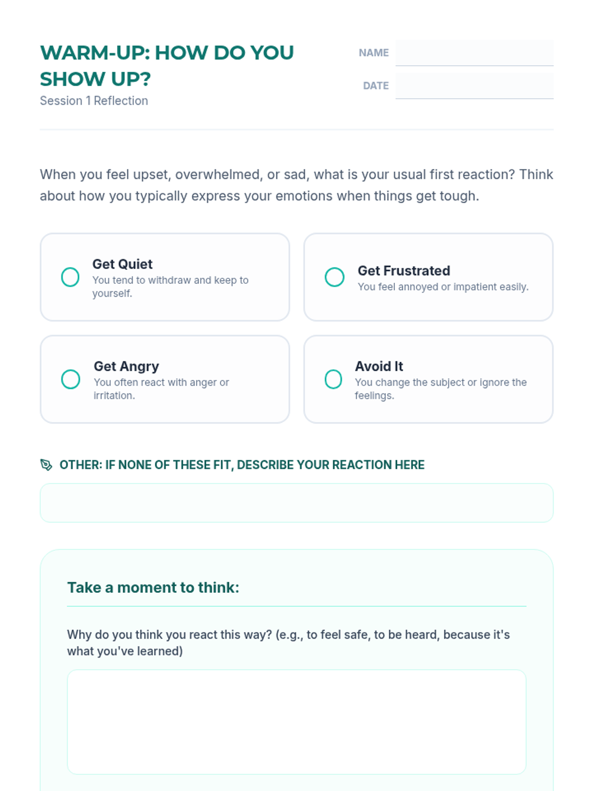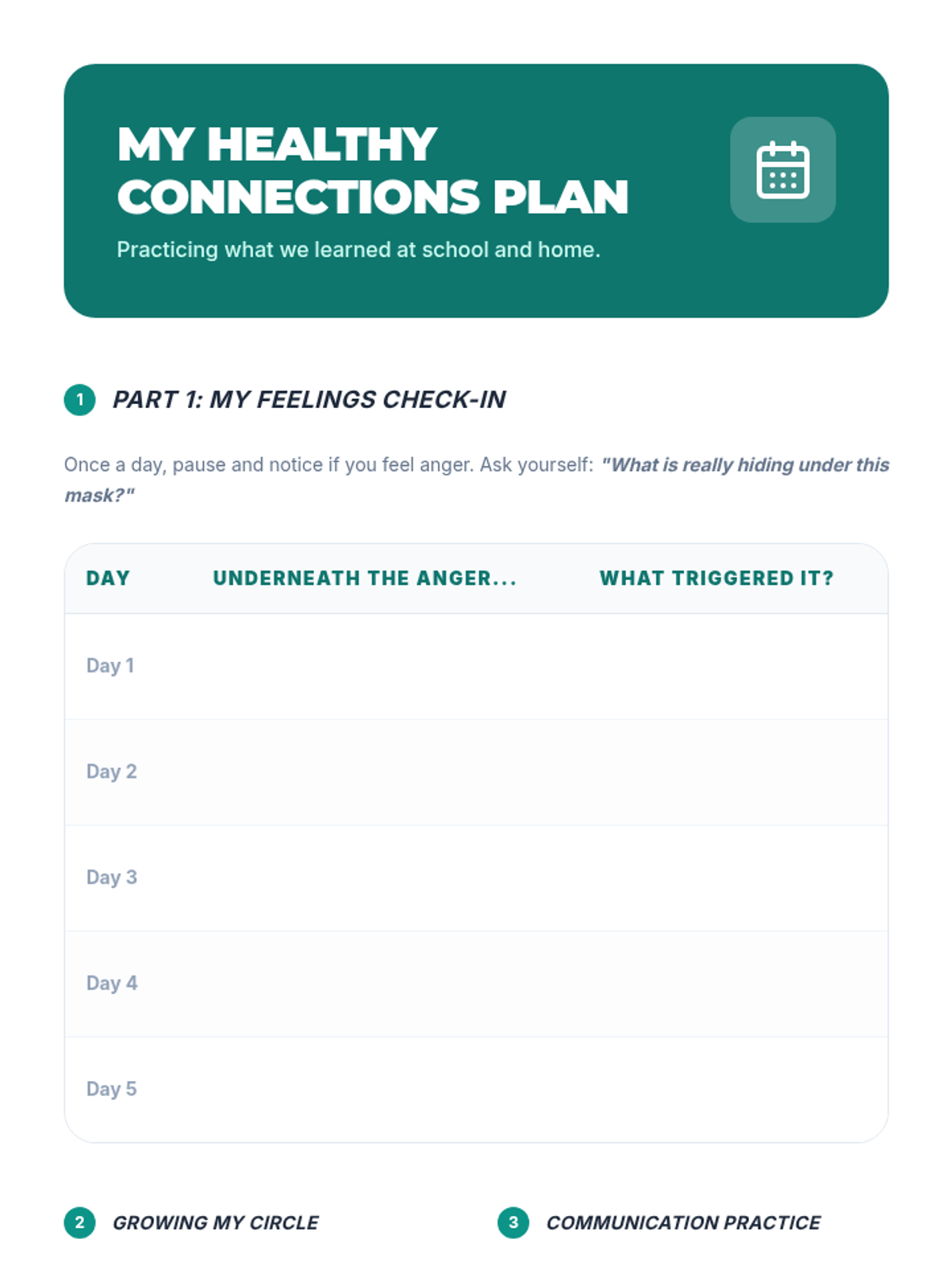 Students synthesize their learning by creating a personal coping plan and reflecting on their growth throughout the group.