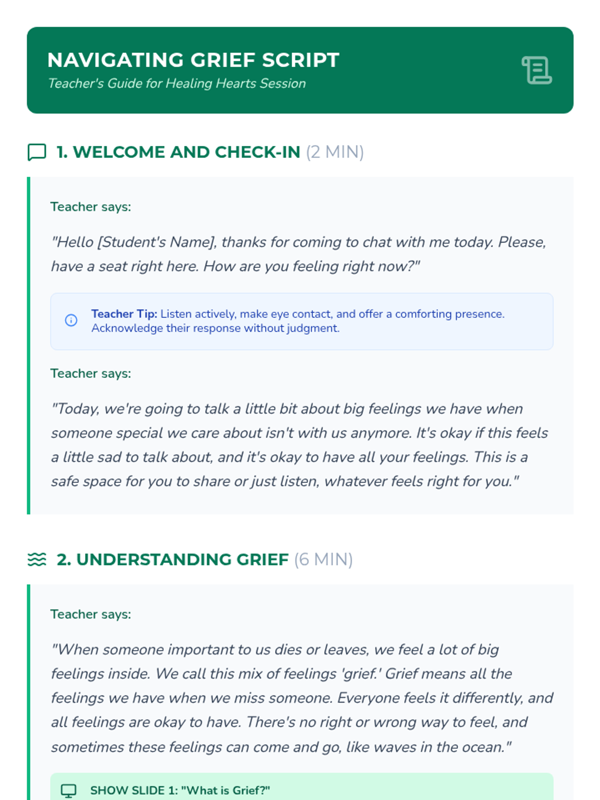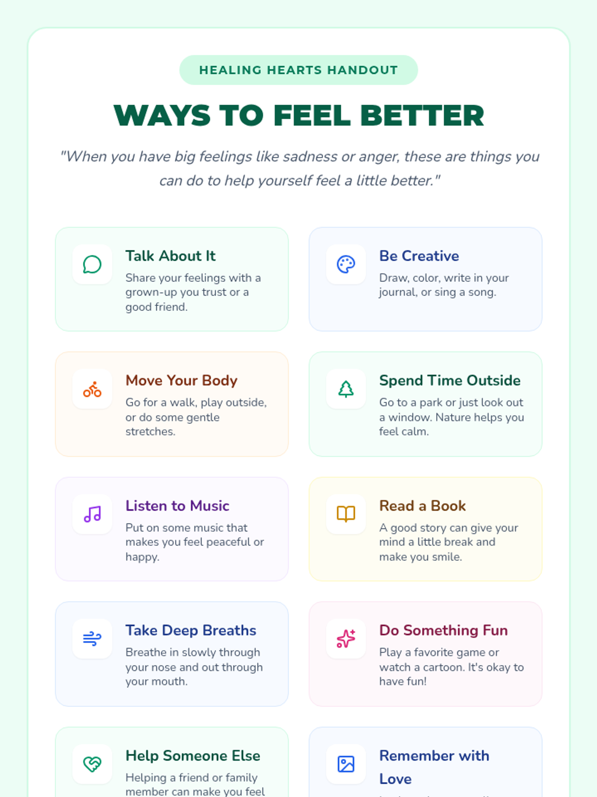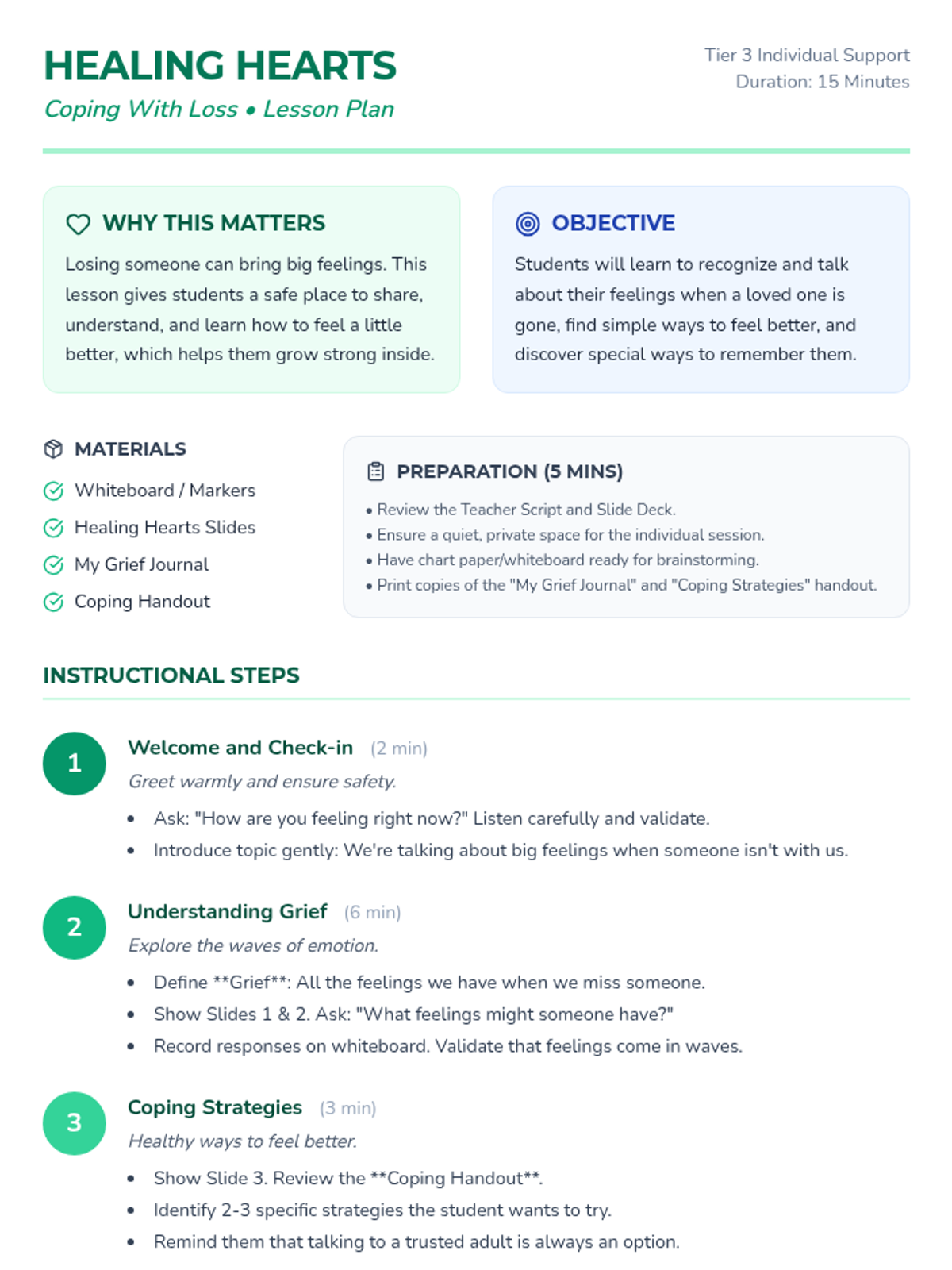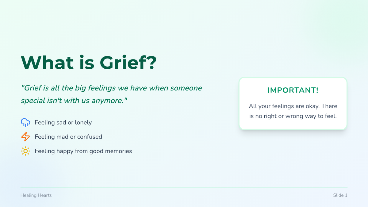 A gentle 15-minute individual session designed to help elementary students navigate the complex emotions of grief, explore healthy coping mechanisms, and find meaningful ways to remember their loved ones.