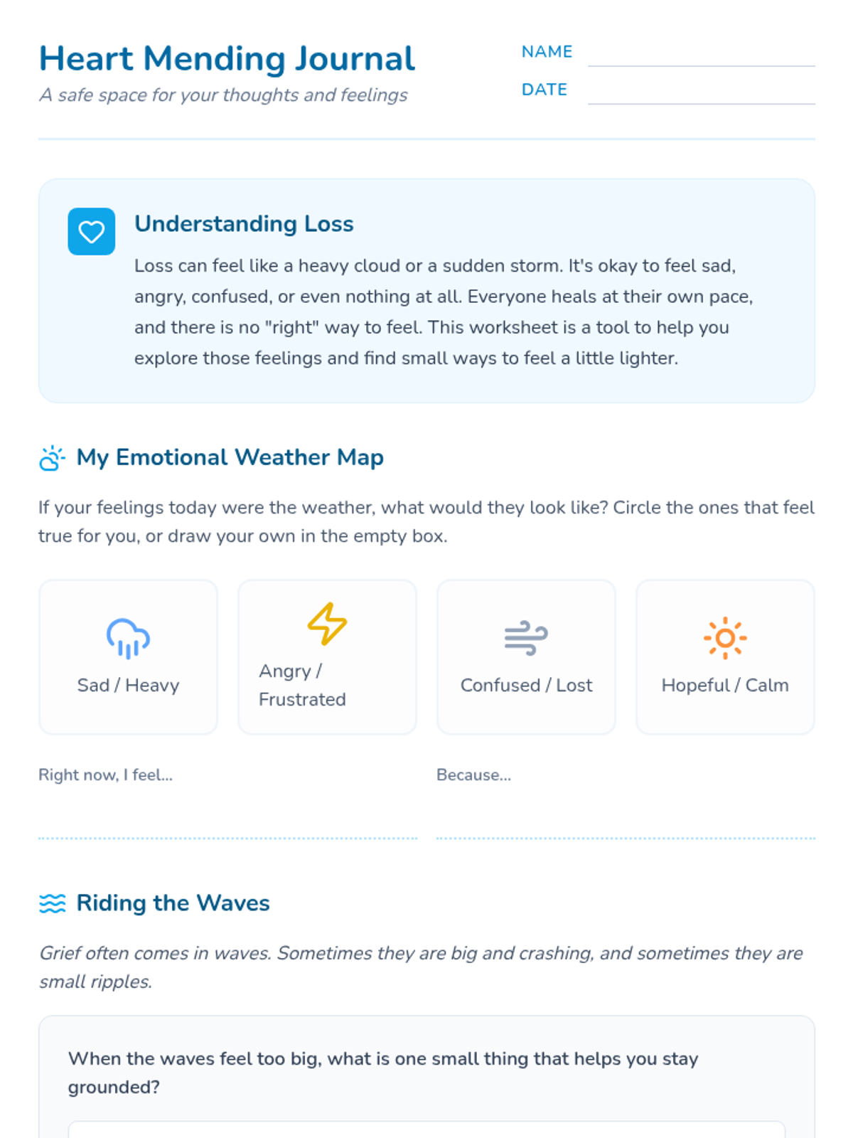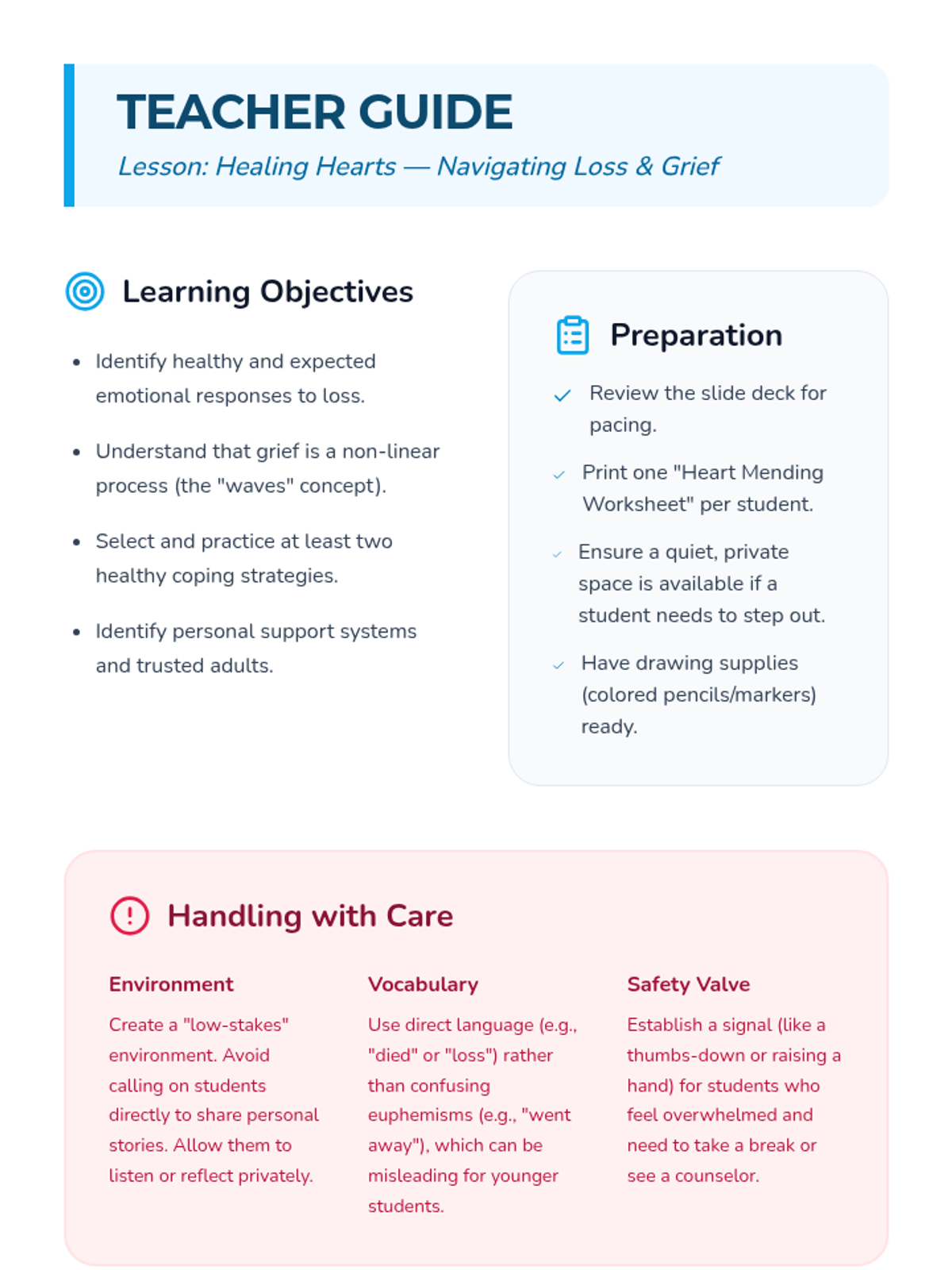 A supportive lesson designed to help students understand grief, identify healthy emotional responses, and develop practical coping strategies for dealing with loss.
