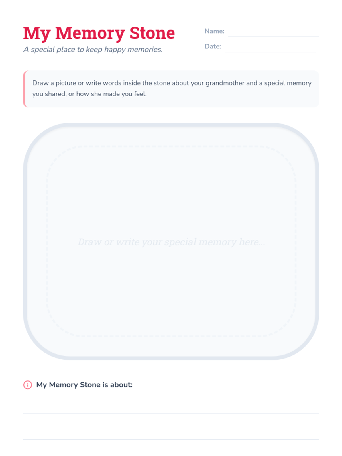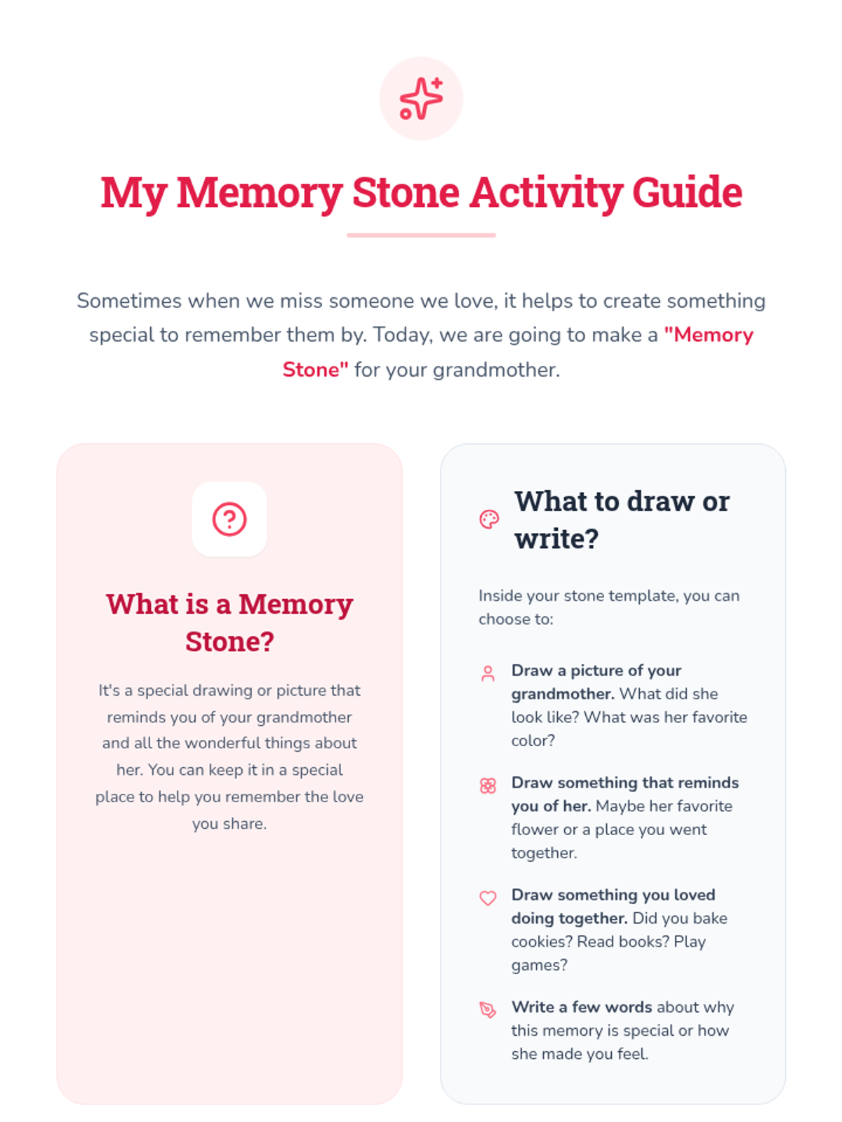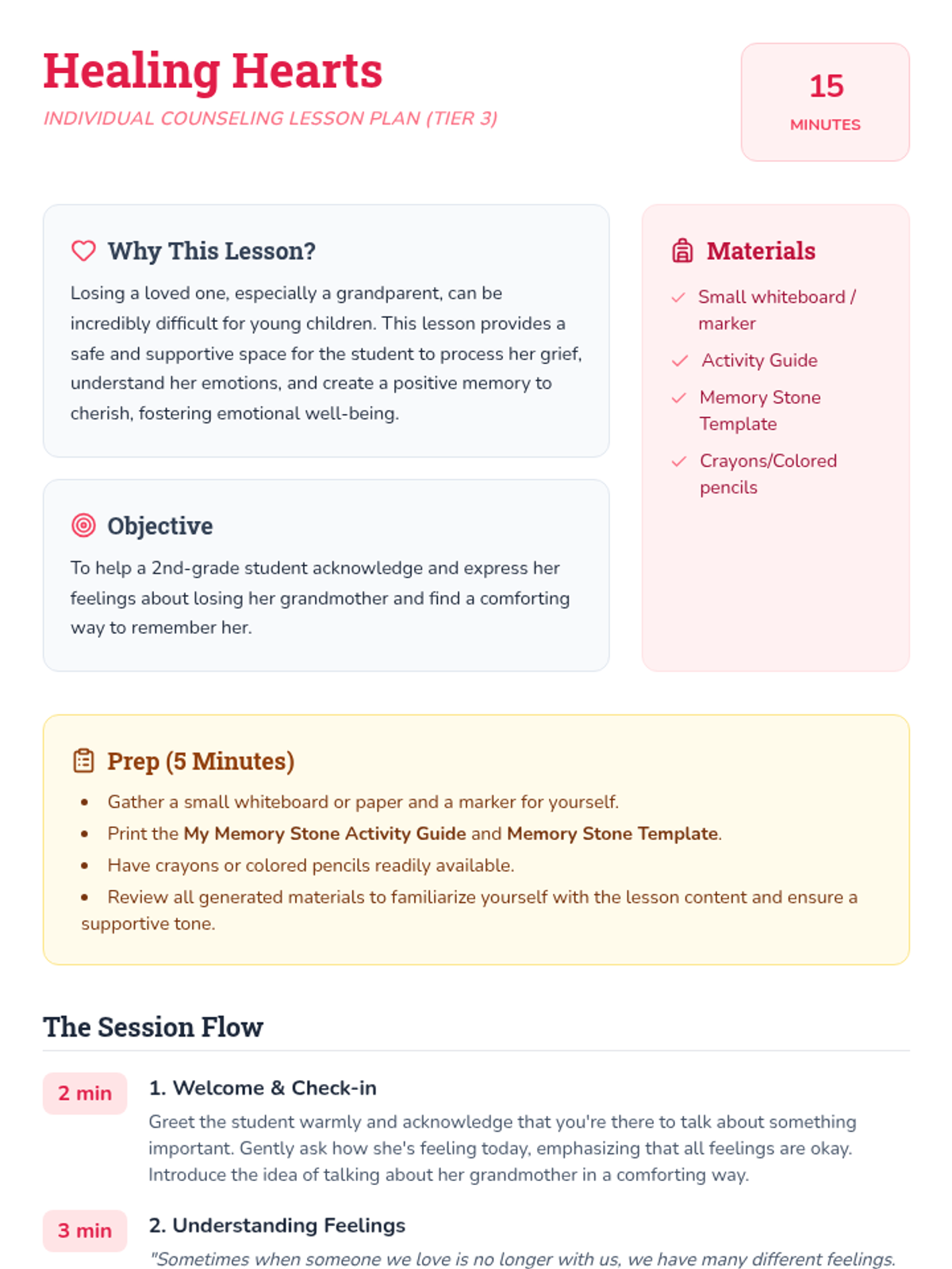 A gentle 15-minute individual Tier 3 counseling session for a 2nd-grade student coping with the loss of her grandmother, focusing on emotional expression and positive remembrance.