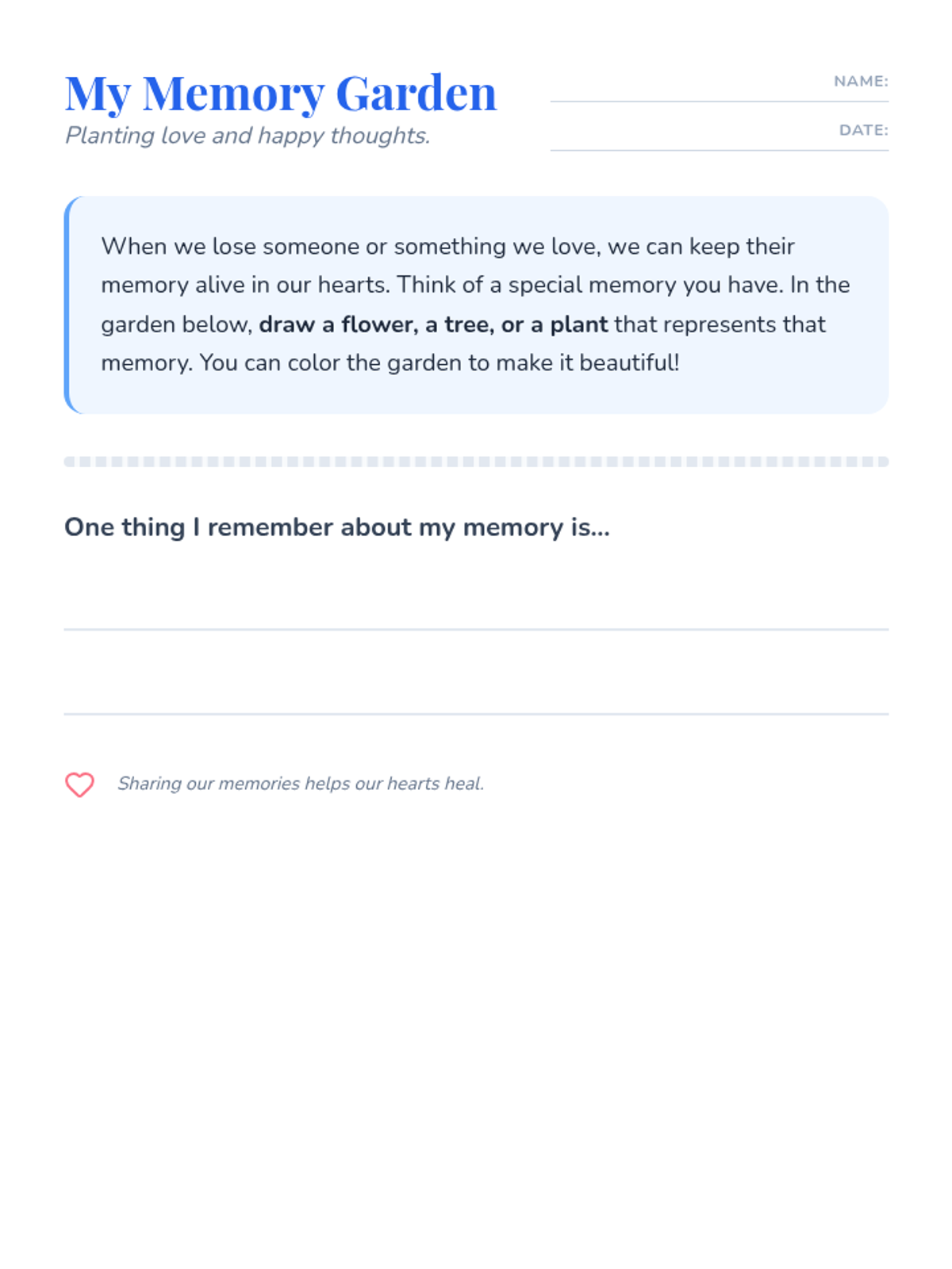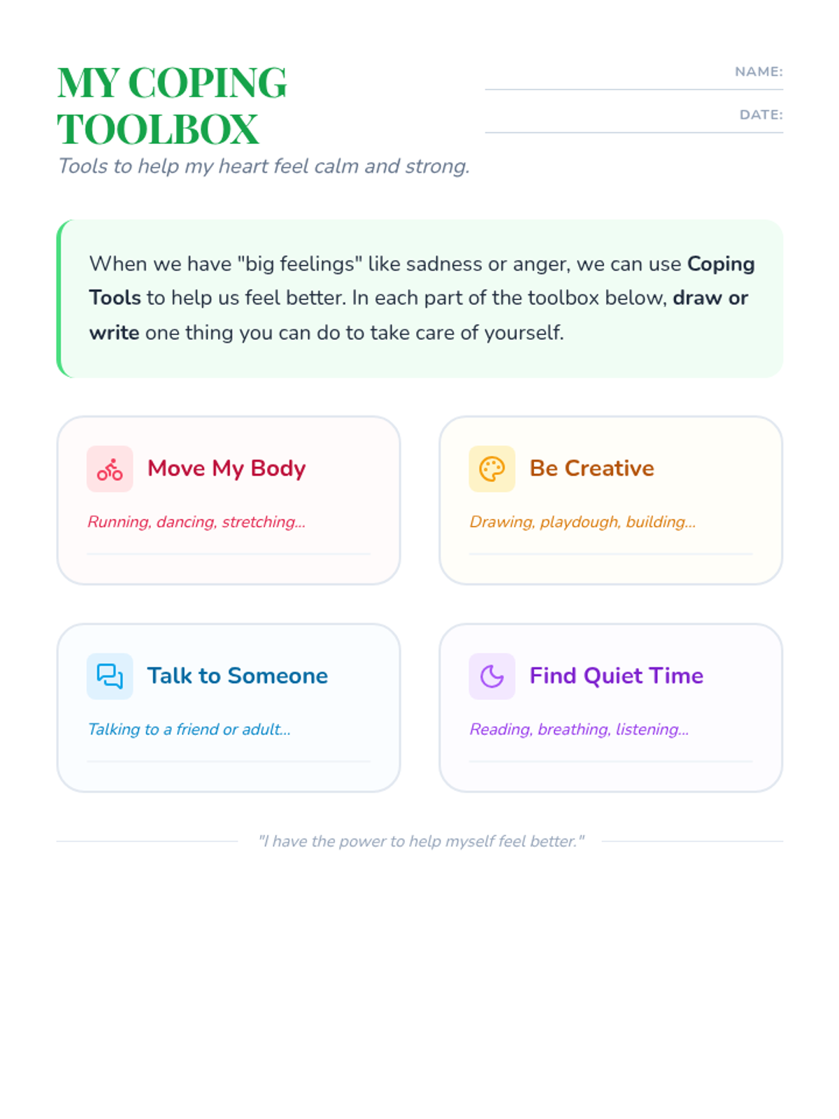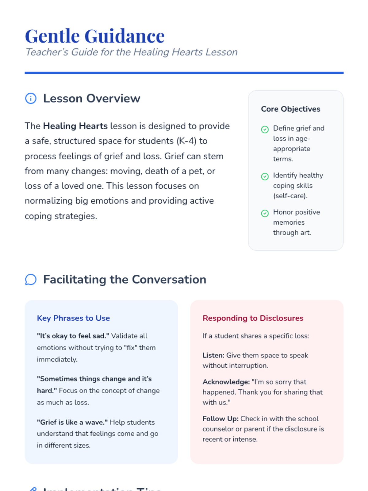 A gentle and supportive lesson designed for K-4 students to explore grief, loss, and self-care. Through art-based activities like drawing and coloring, students learn to identify their feelings, honor memories, and build a personal 'toolbox' of coping strategies.