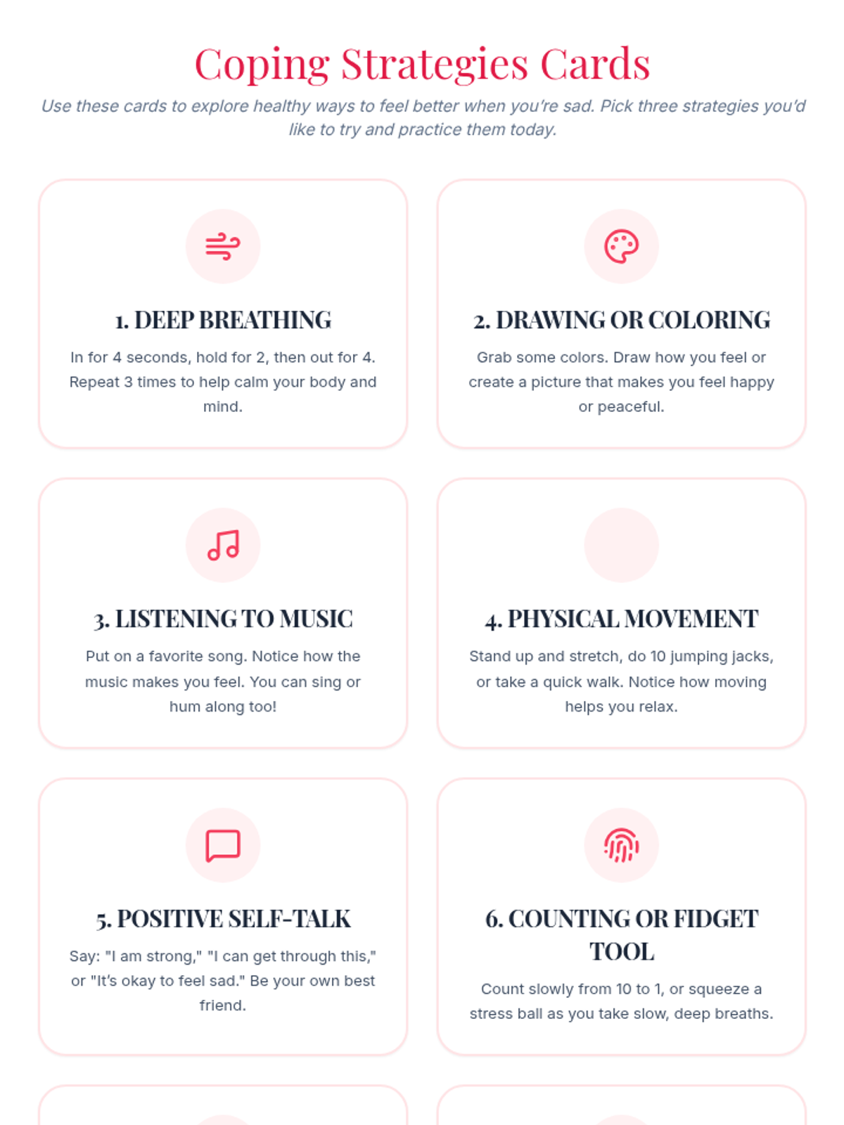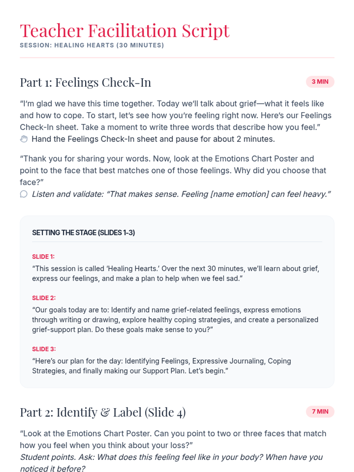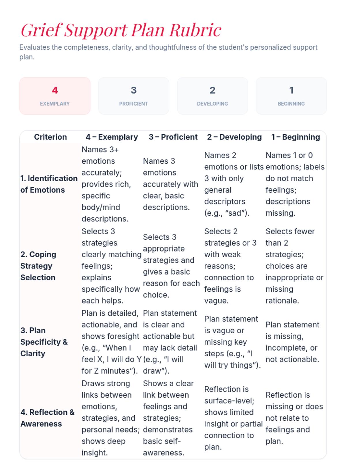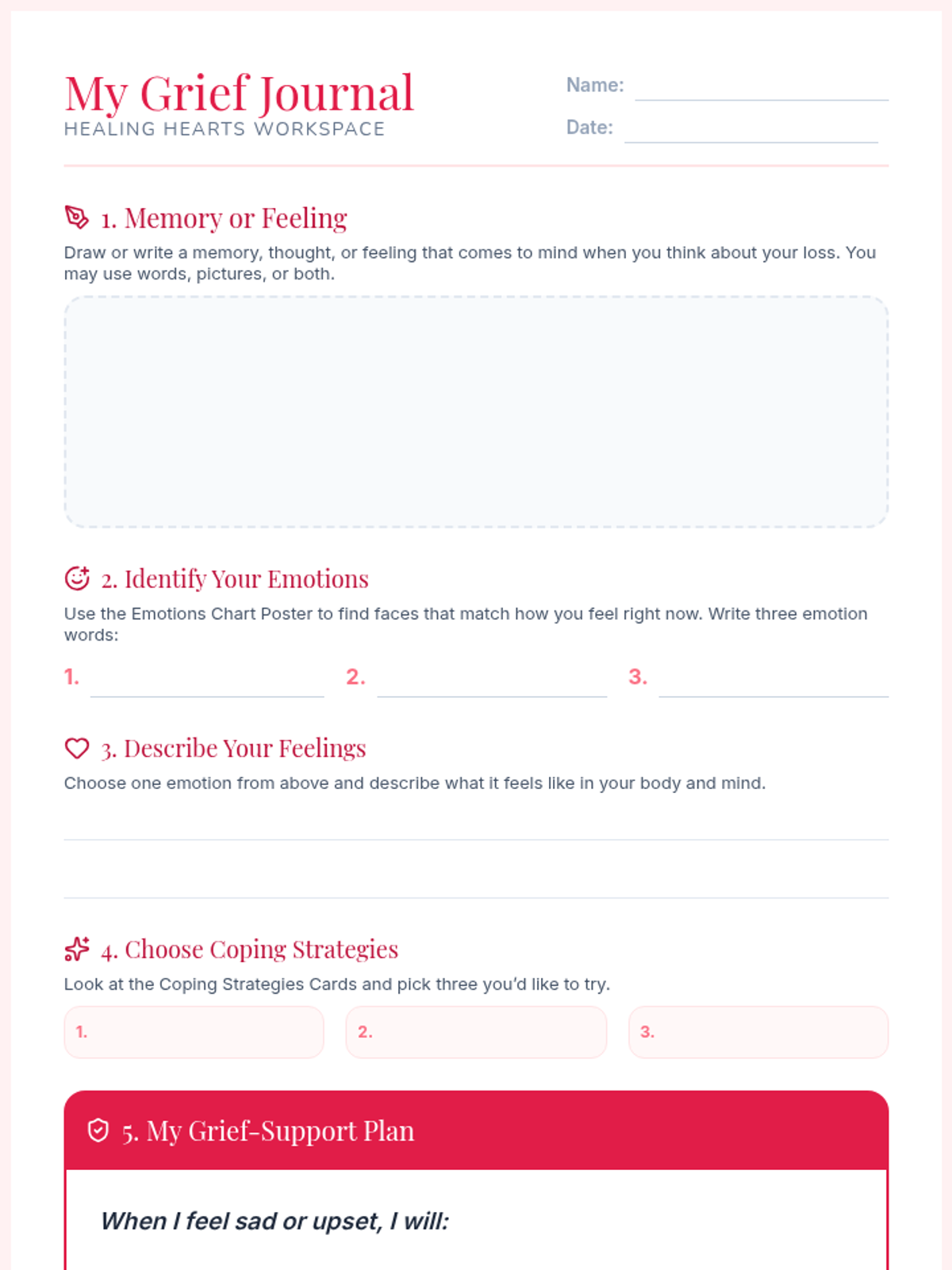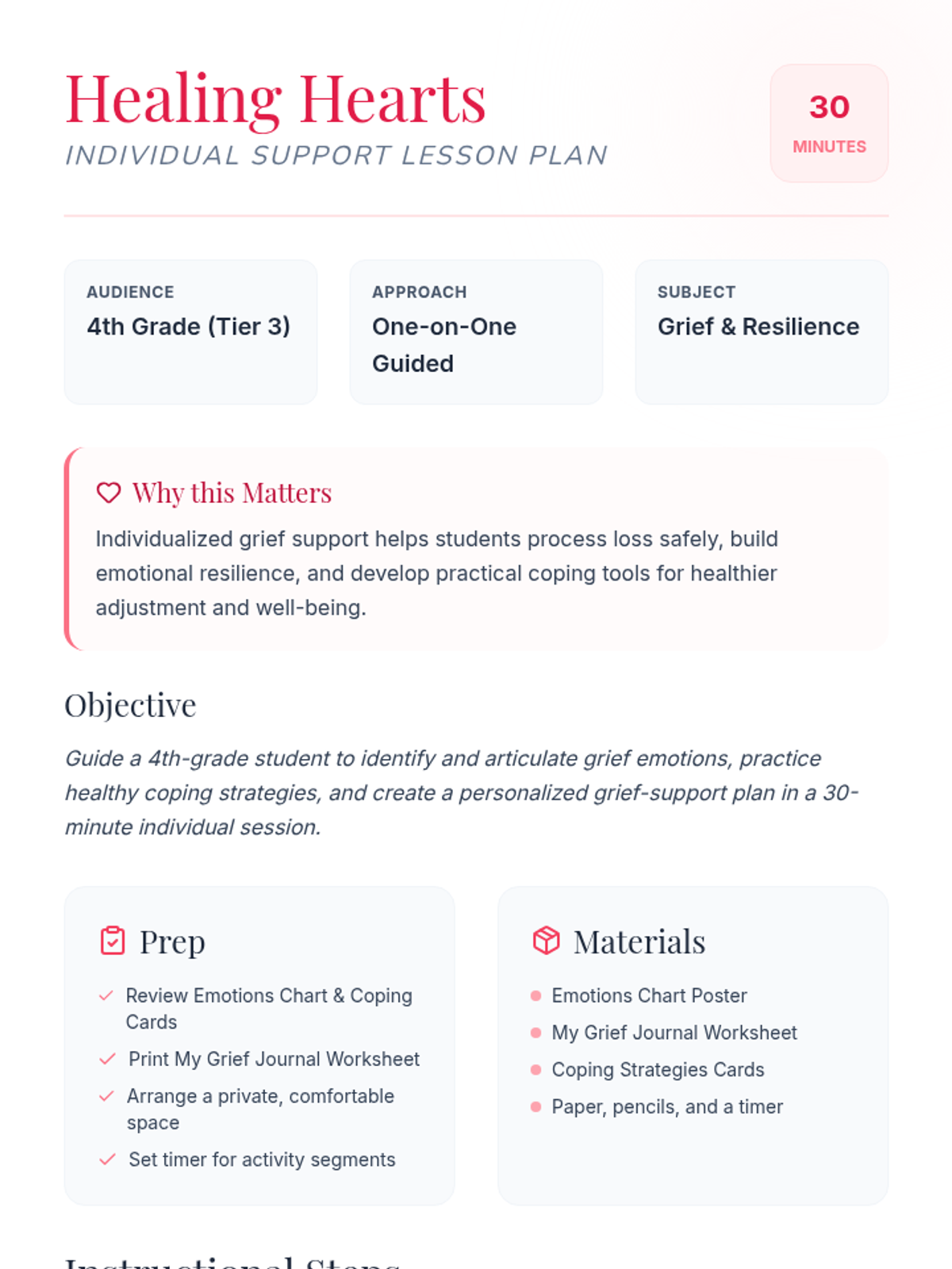 A 30-minute Tier 3 individual session for 4th graders to navigate grief through emotional identification, journaling, and coping strategy development. This lesson provides a safe, structured environment for students to build resilience and create a personalized support plan.