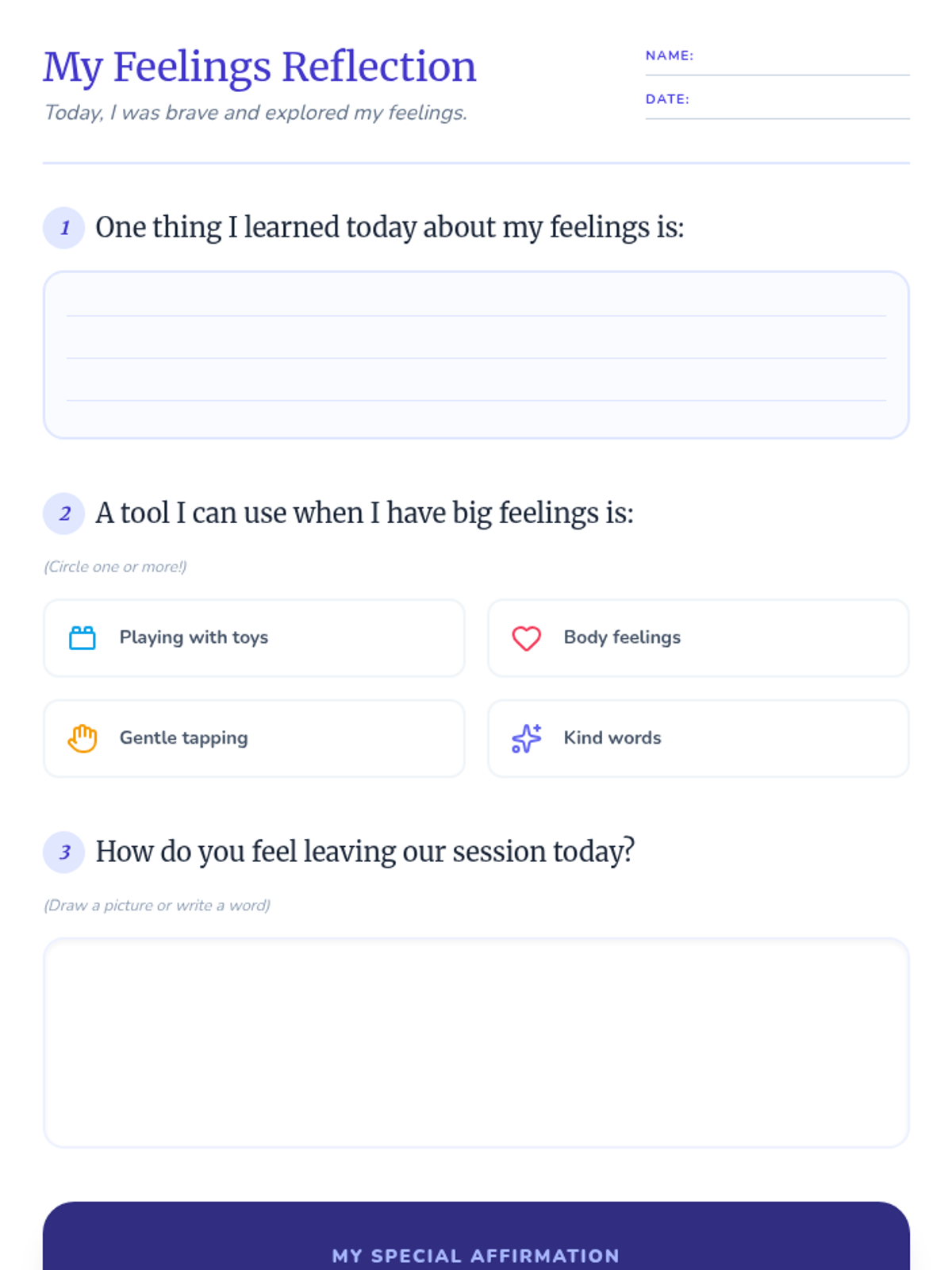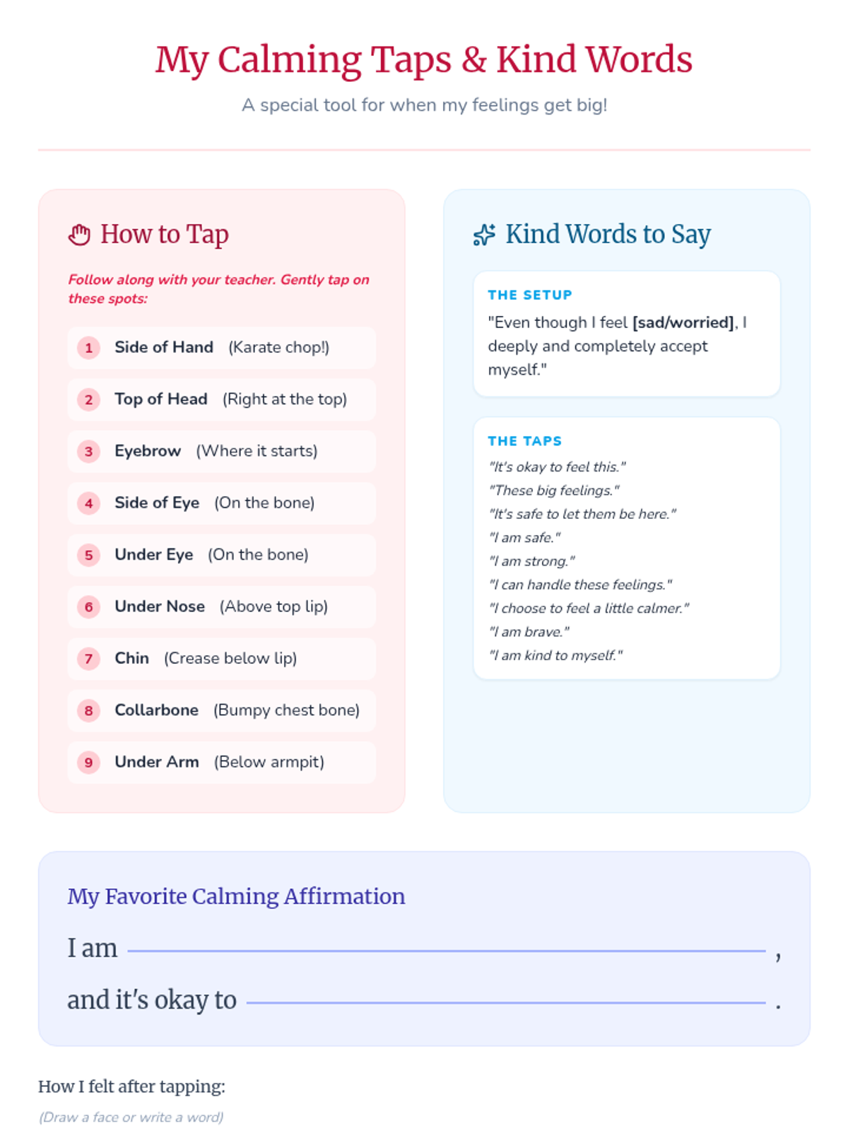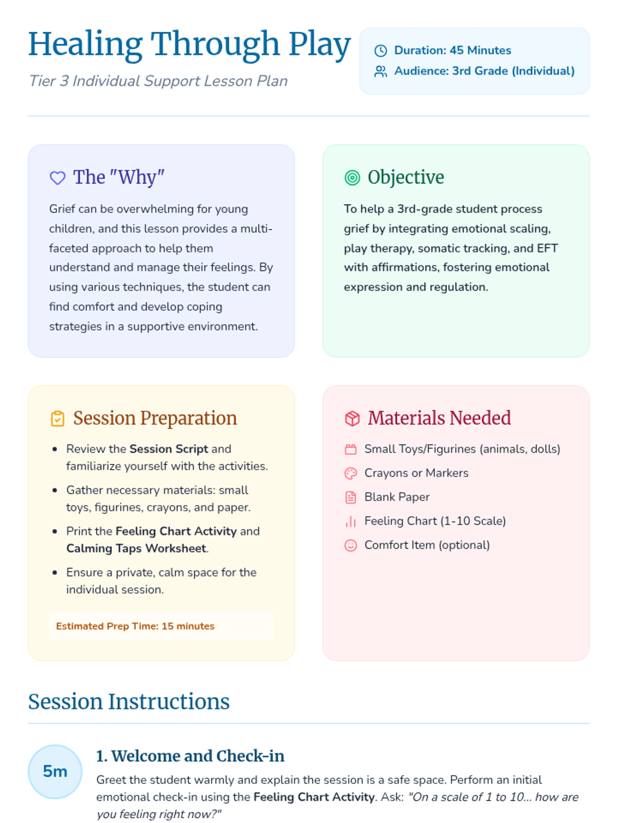 A 45-minute individual Tier 3 session for 3rd-grade students to process grief through play therapy, somatic tracking, and EFT tapping. This trauma-informed lesson helps students explore big emotions and develop self-regulation tools in a safe, supportive environment.