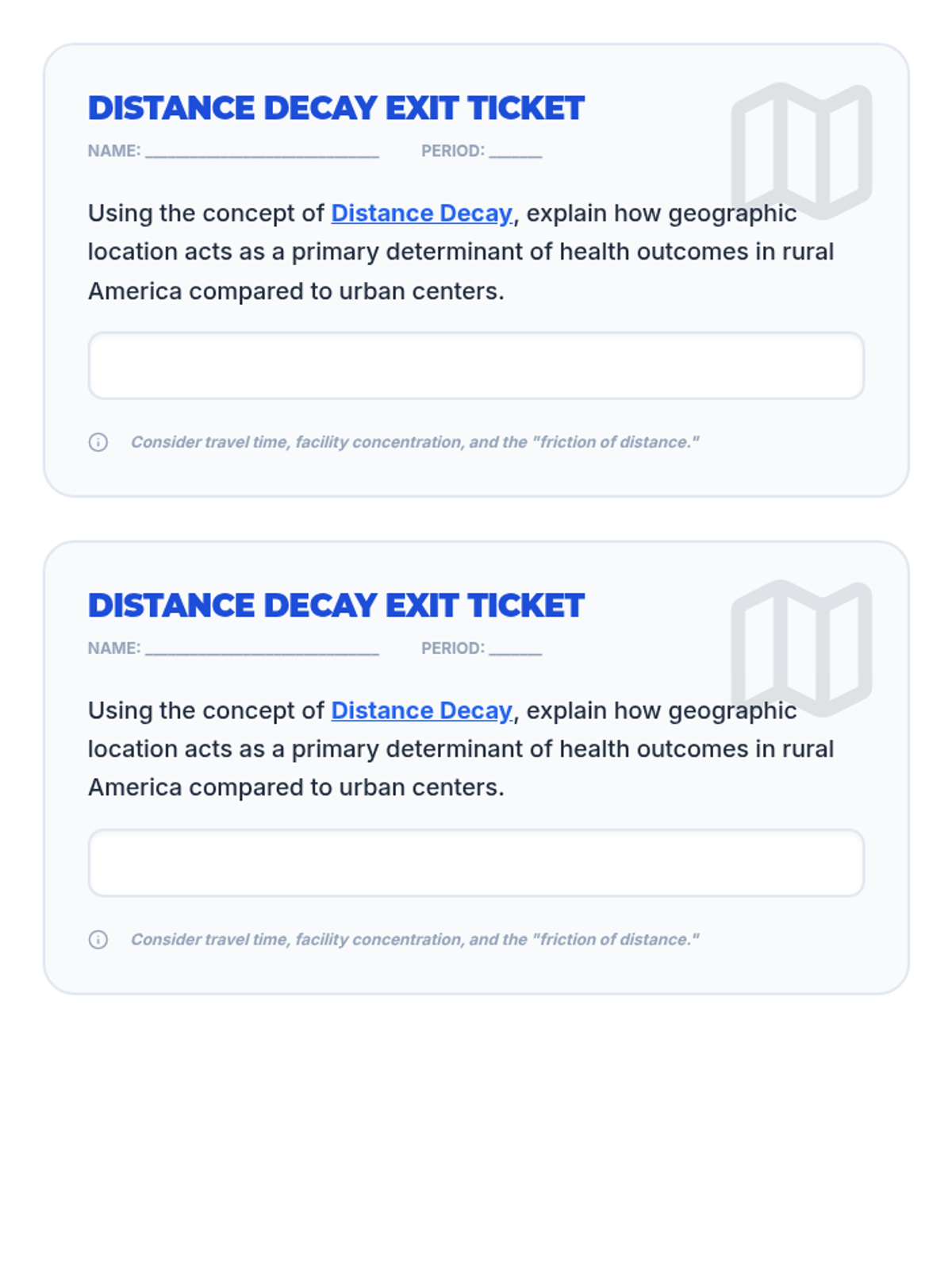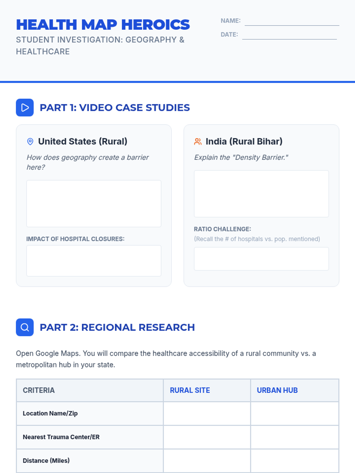 Students explore the spatial relationship between geography and healthcare access, comparing 'distance barriers' in the U.S. to 'density barriers' in India through video analysis and mapping research.