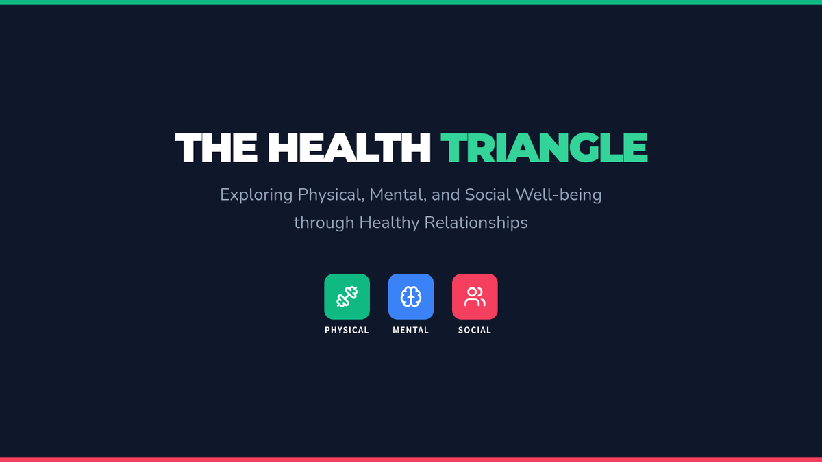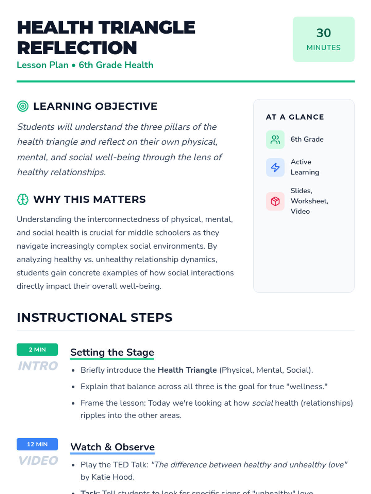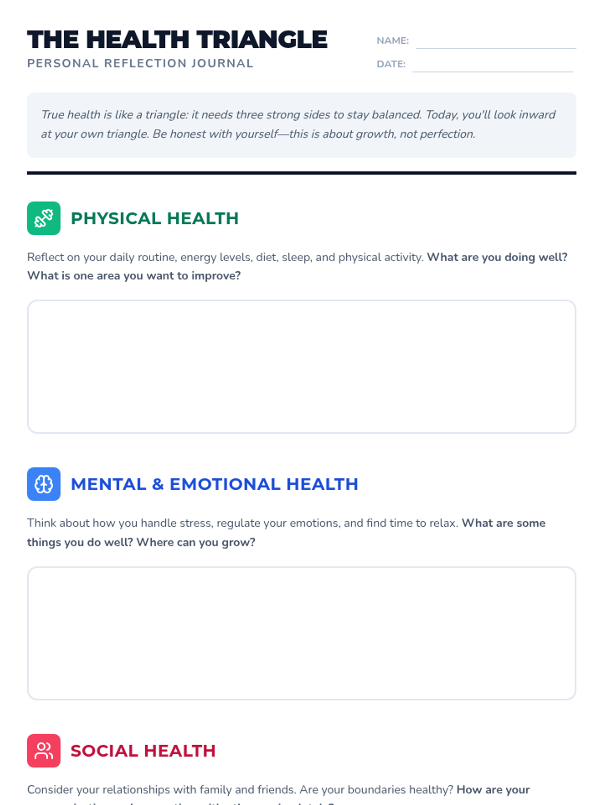 A 6th-grade health lesson exploring the three pillars of the health triangle—physical, mental, and social—through the lens of healthy relationships and self-reflection.