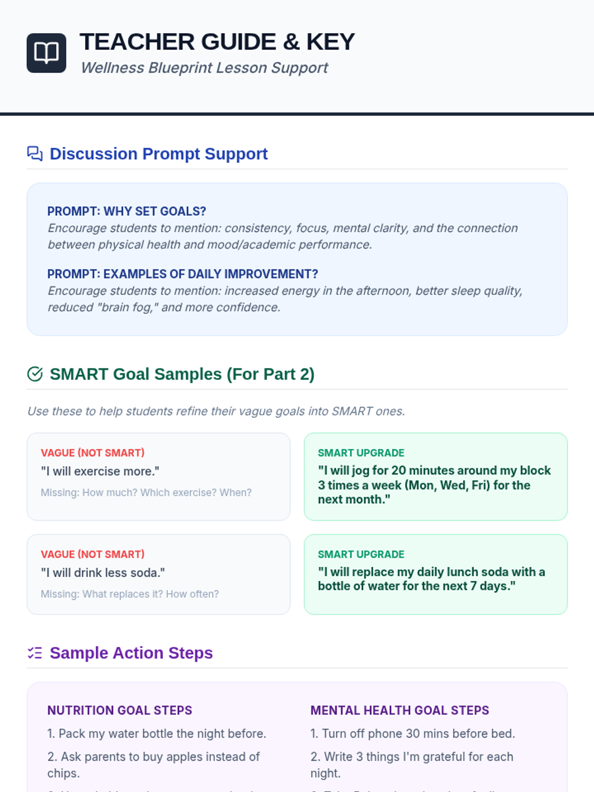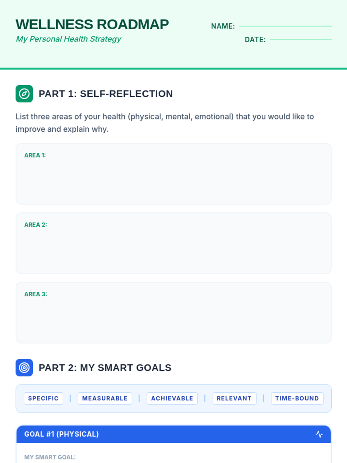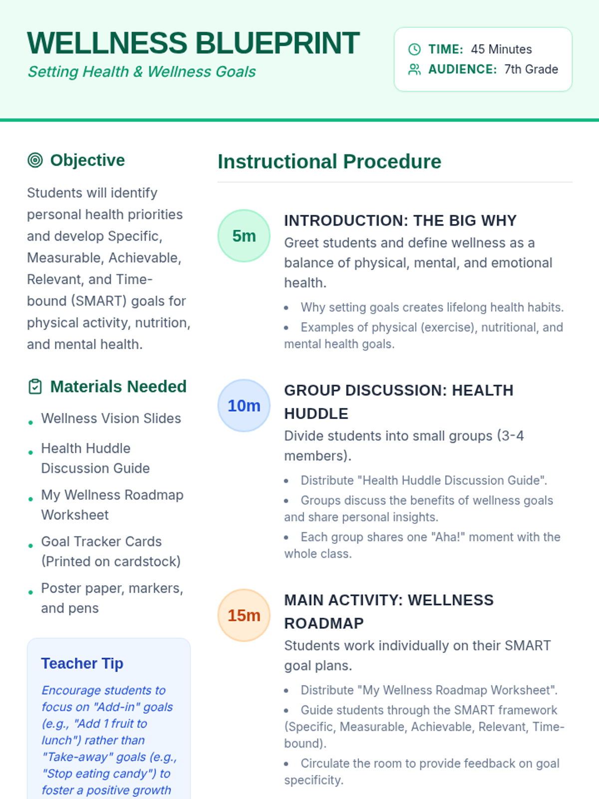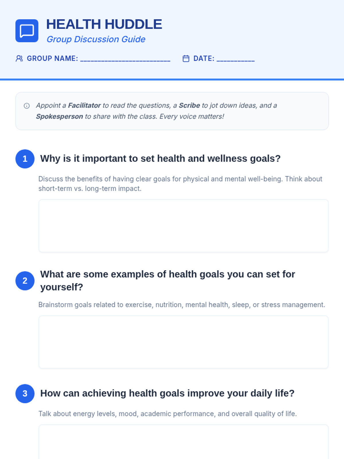 A comprehensive lesson designed for seventh-grade students to identify personal health priorities and create actionable SMART goals for physical, nutritional, and mental well-being. Students will engage in group discussions, reflective writing, and creative poster-making to solidify their commitment to lifelong healthy habits.