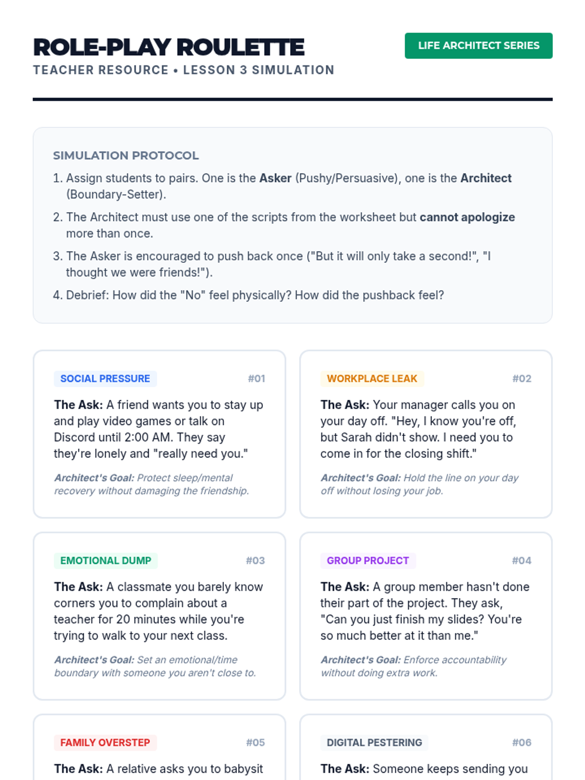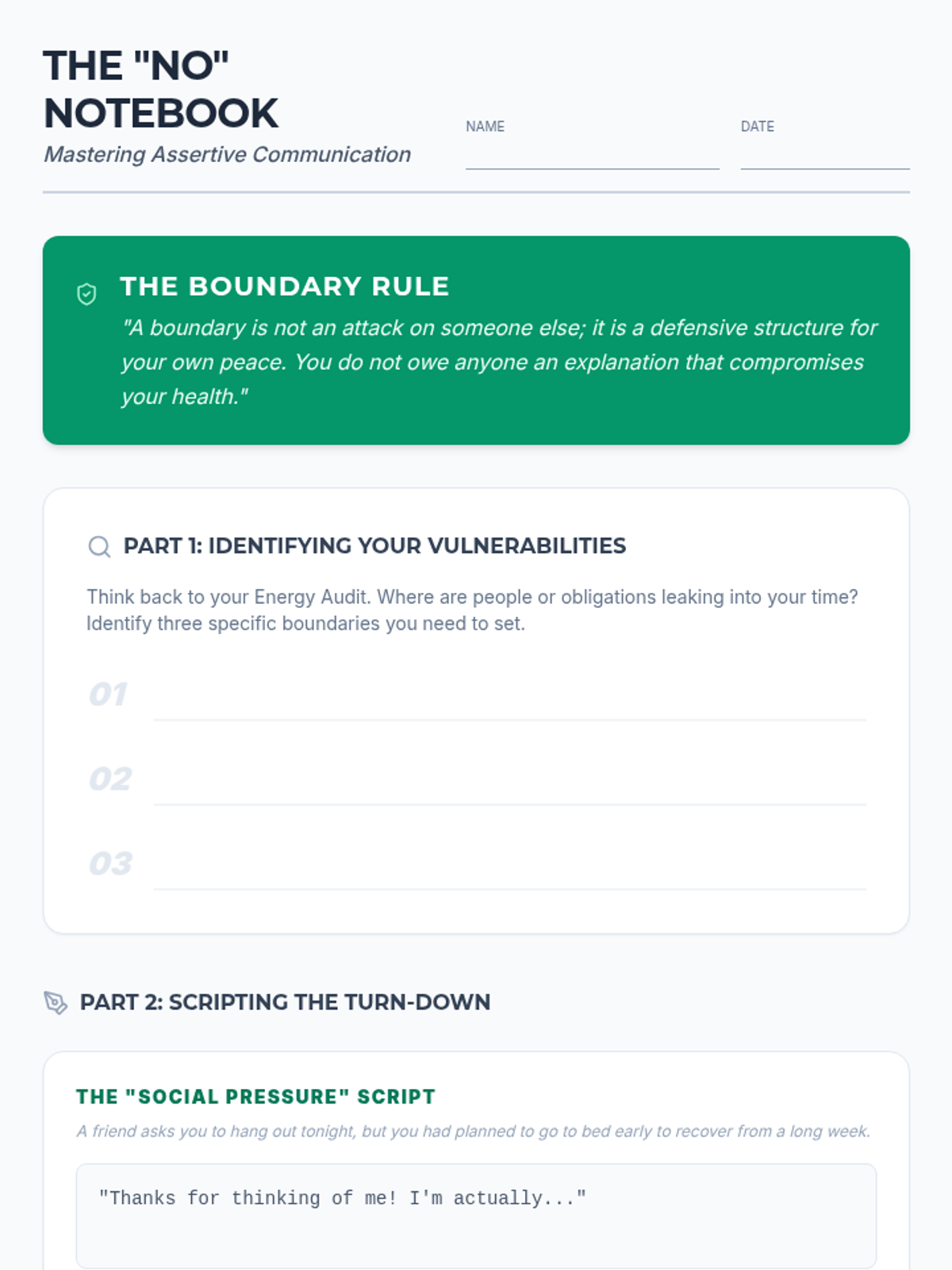 Focuses on the interpersonal aspect of stress management through boundary identification and assertive communication scripts for declining requests effectively.
