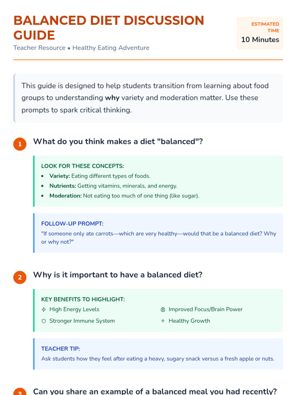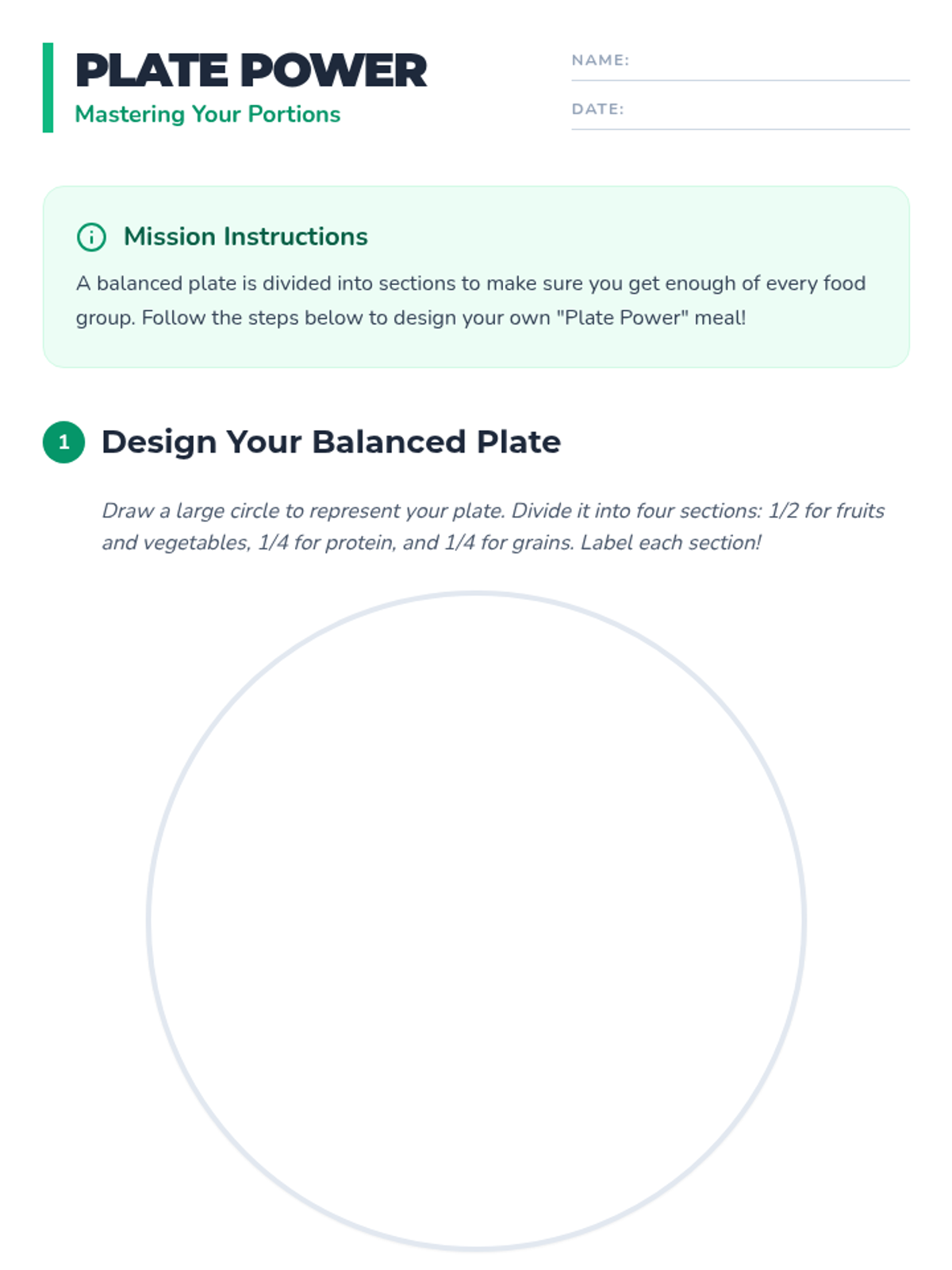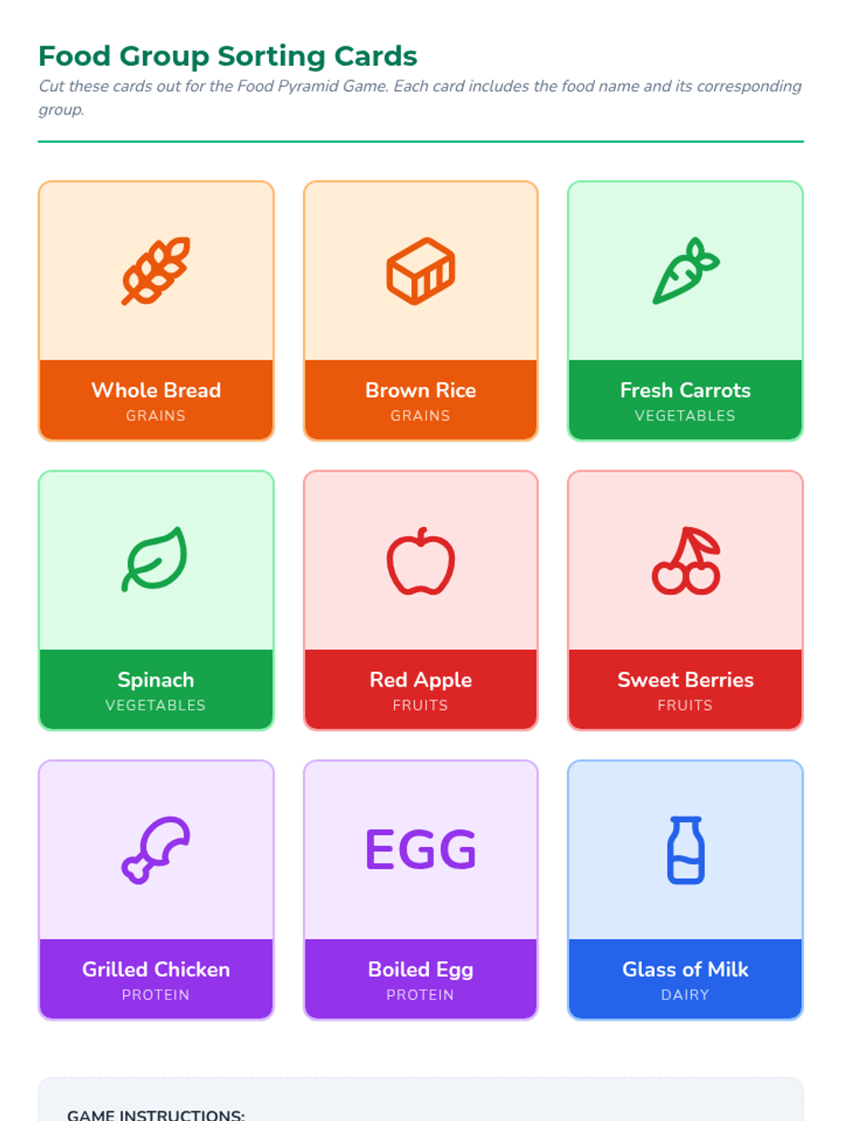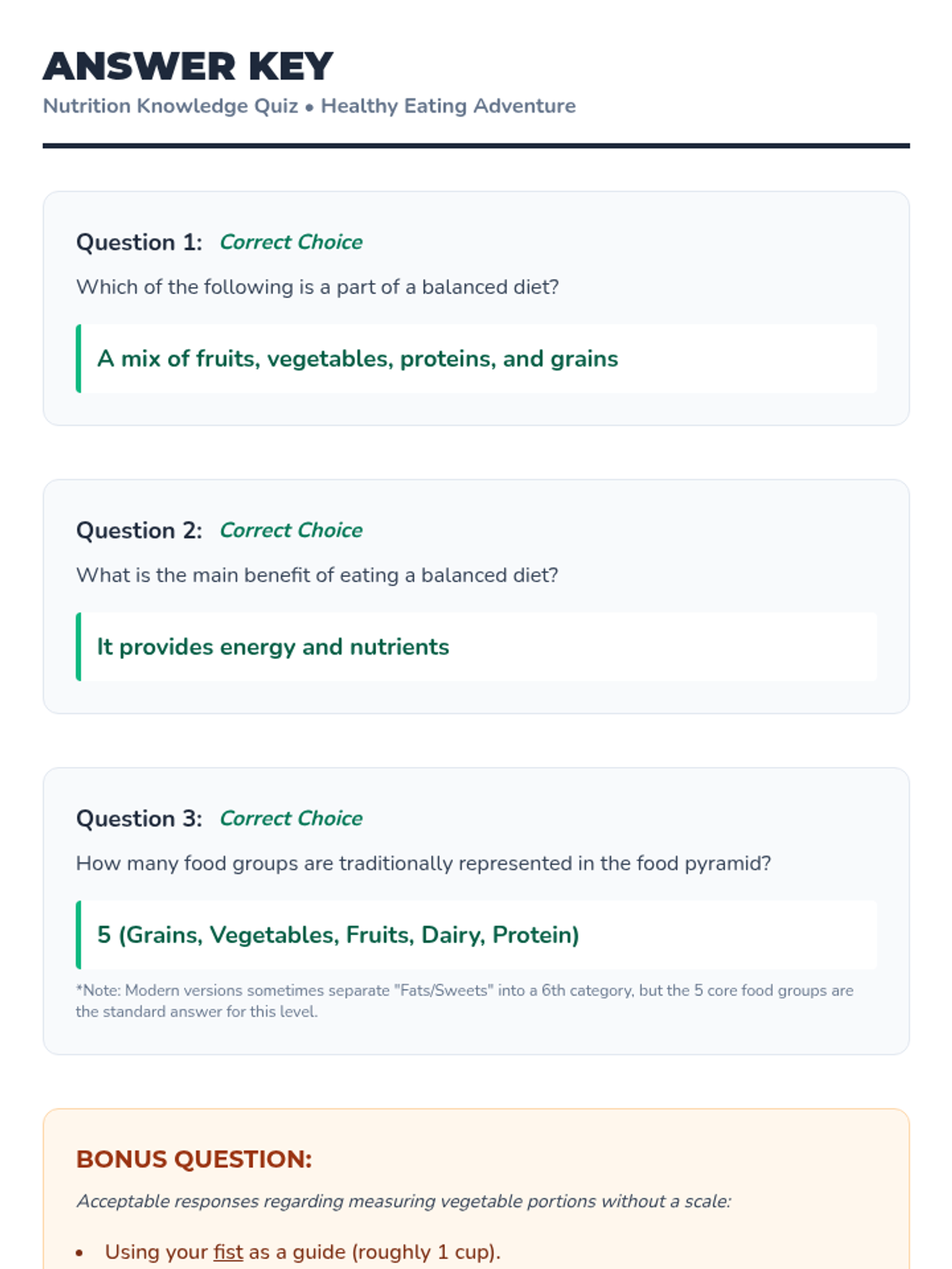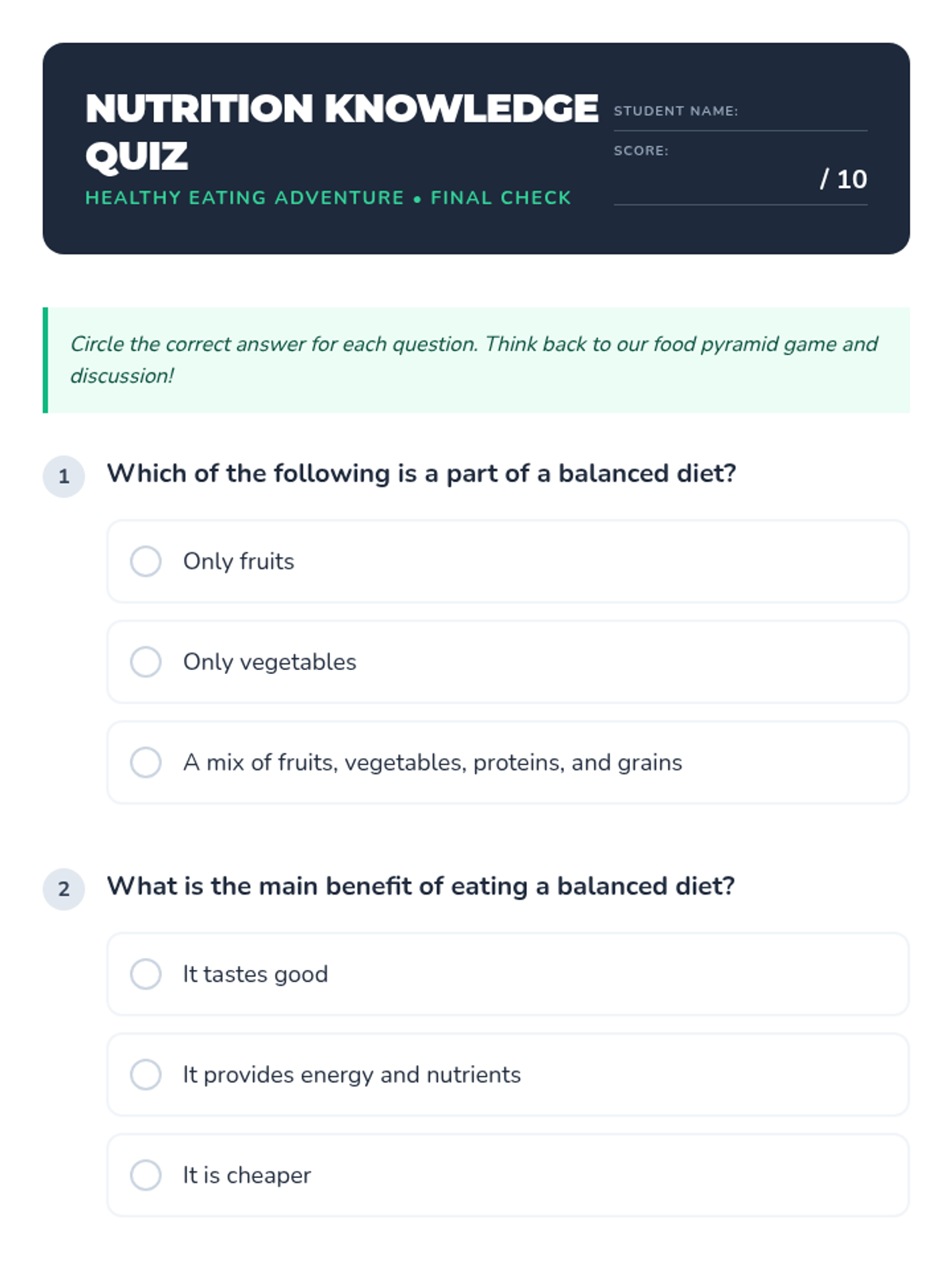 An interactive 5th-grade lesson exploring nutrition basics, the food pyramid, and portion control through games and discussions to promote healthy lifestyle choices.