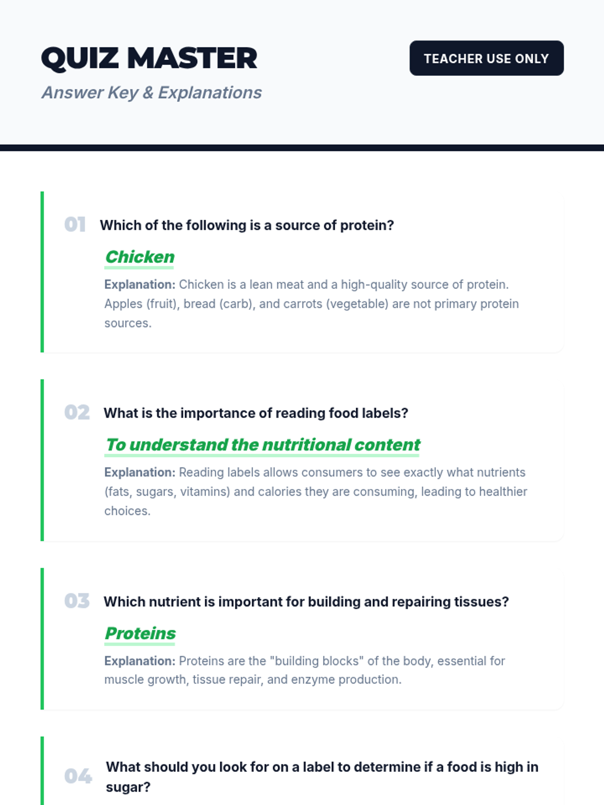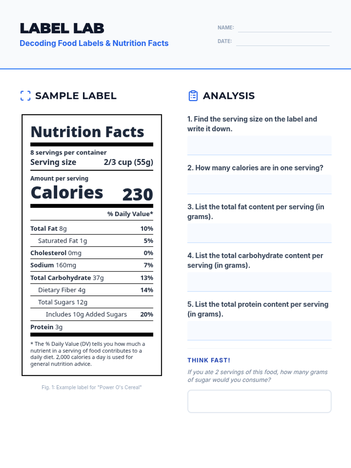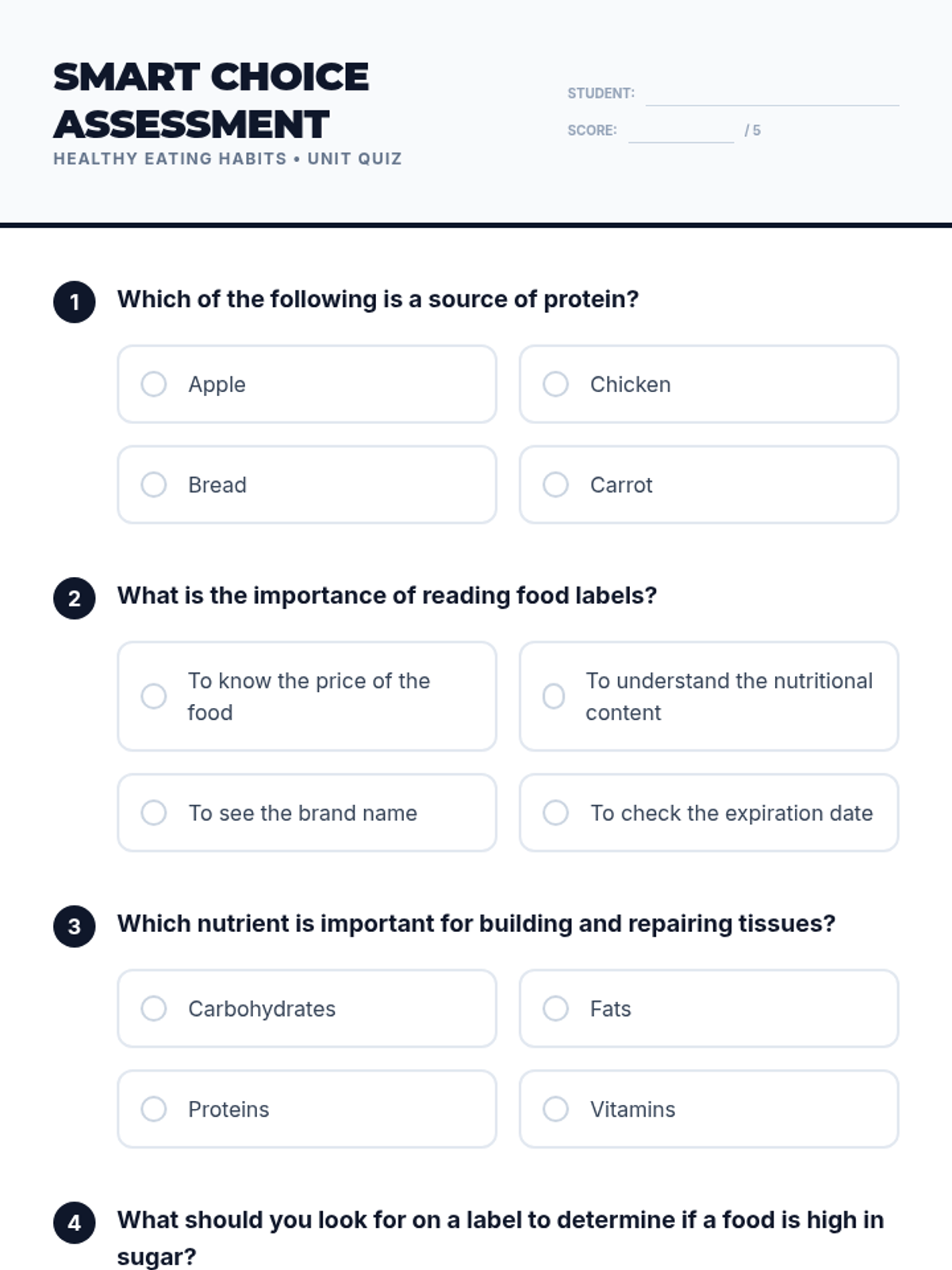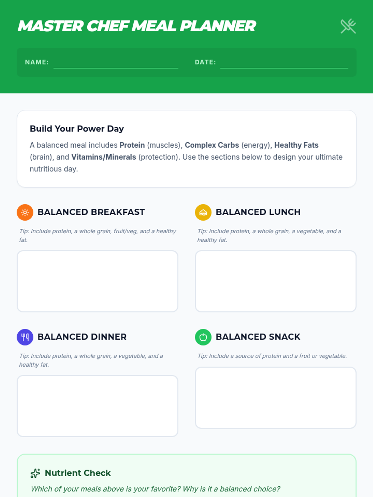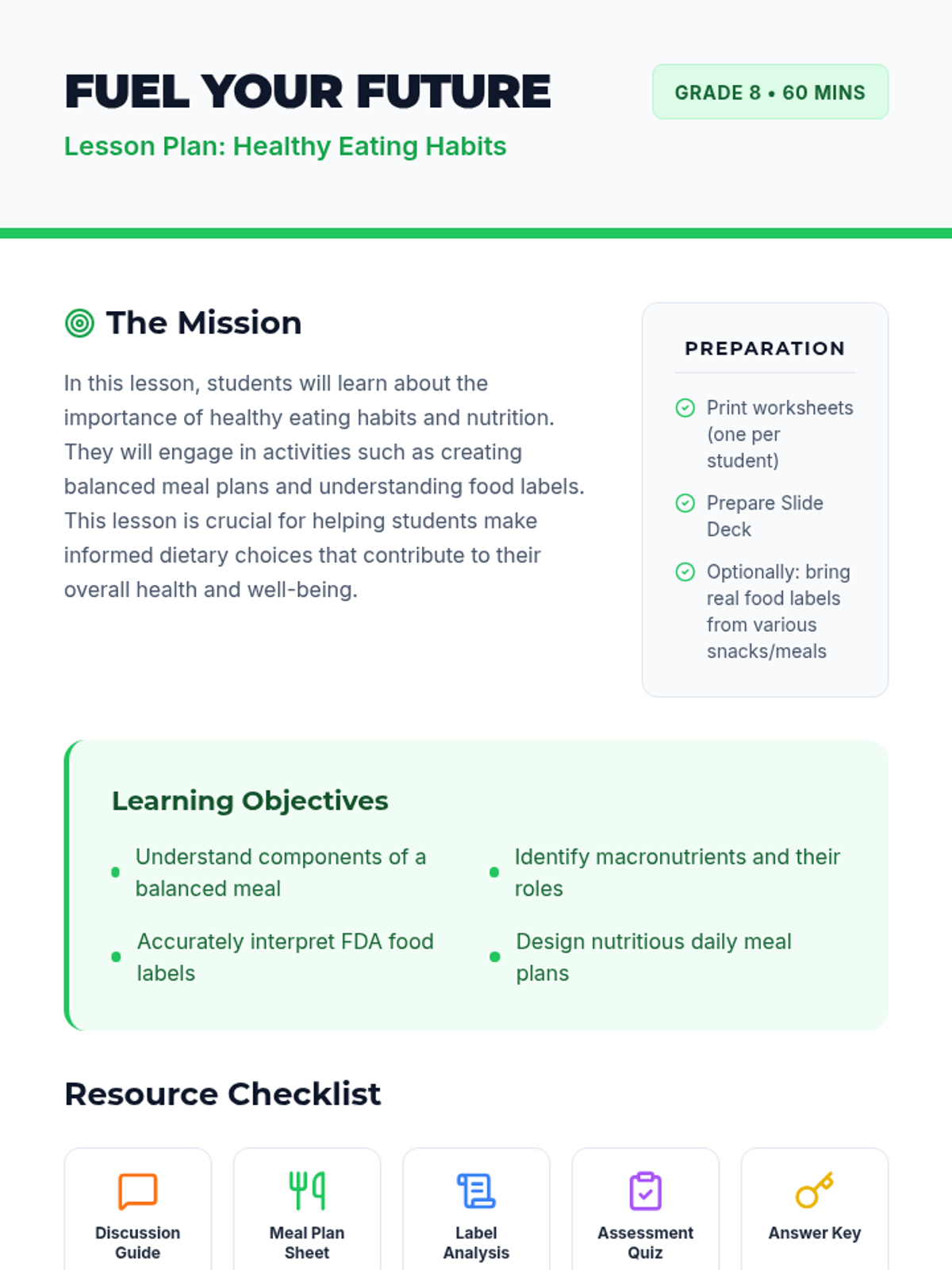 A comprehensive lesson on nutrition and healthy eating for Grade 8, covering macronutrients, meal planning, and food label analysis.