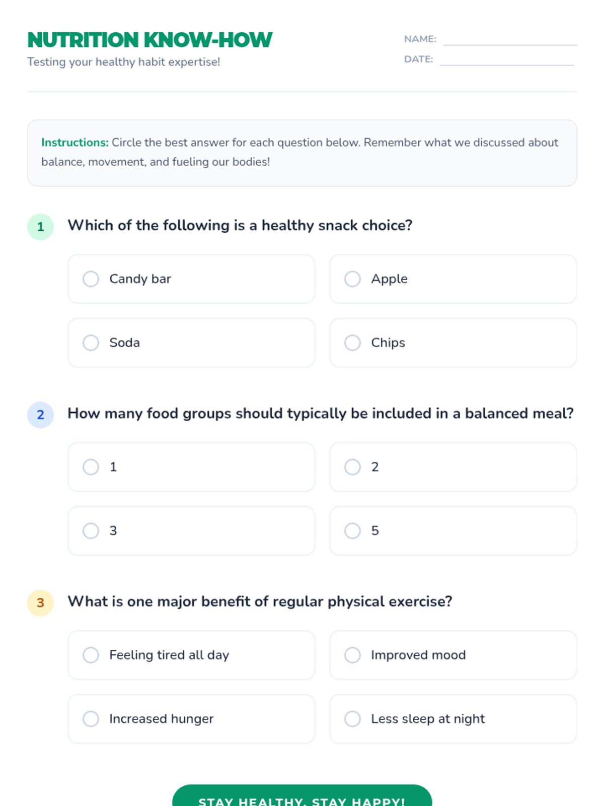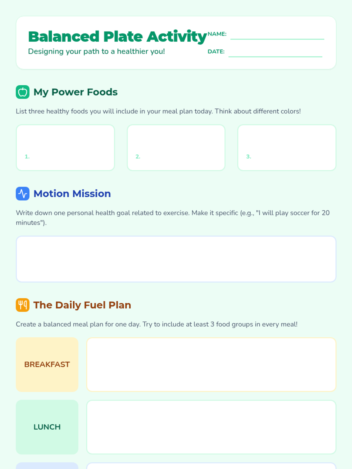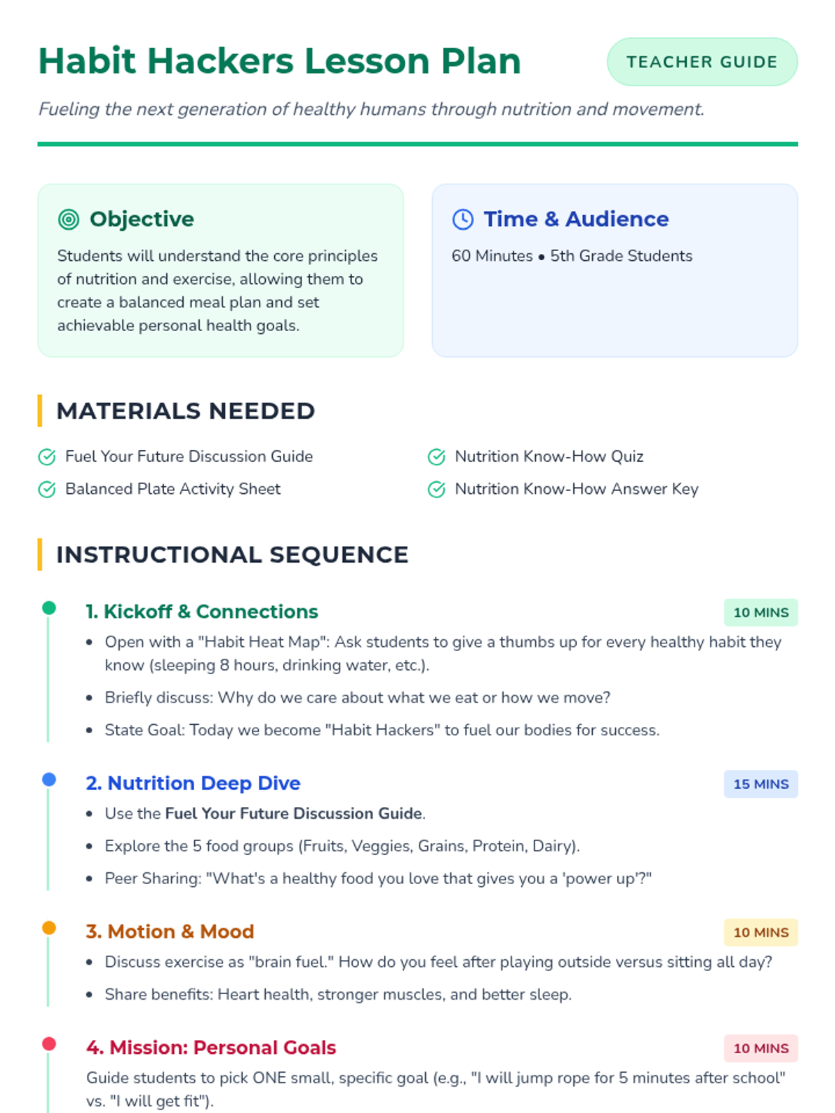 This lesson introduces 5th-grade students to the importance of healthy habits, focusing on nutrition and exercise. Students will learn how to set personal health goals and create a balanced meal plan.