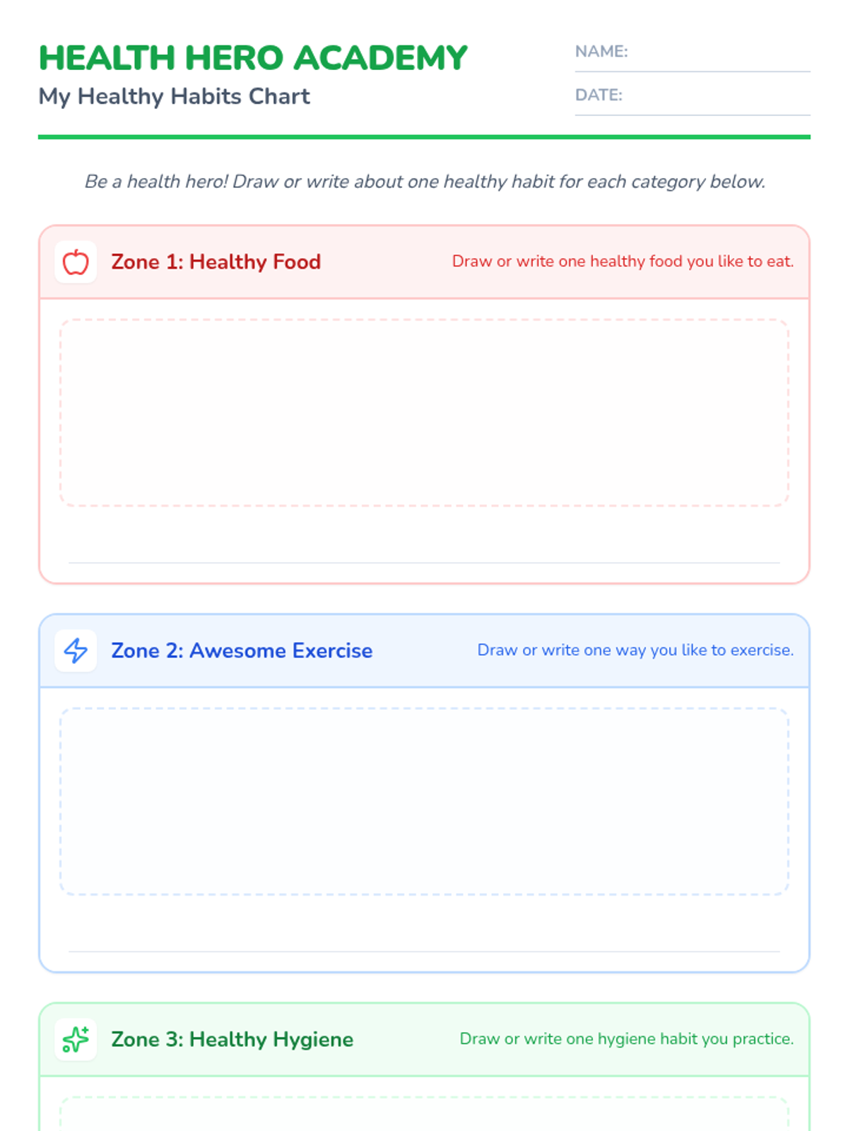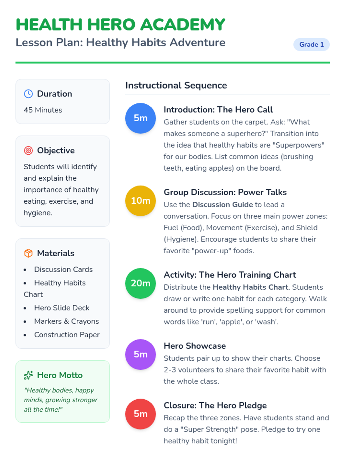 This lesson introduces Grade 1 students to the importance of healthy eating, exercise, and hygiene through interactive activities. Students will engage in a group discussion and create a personalized healthy habits chart to lay the foundation for lifelong well-being.