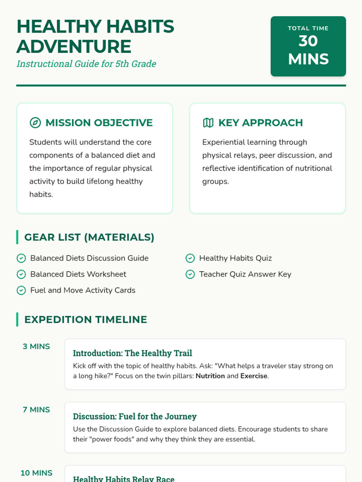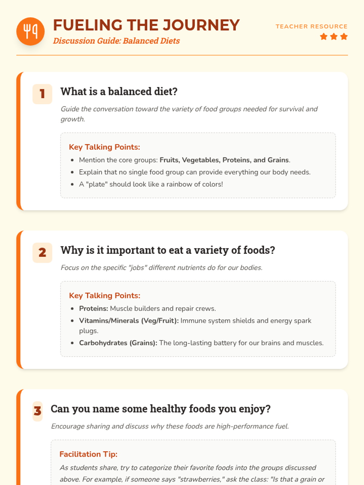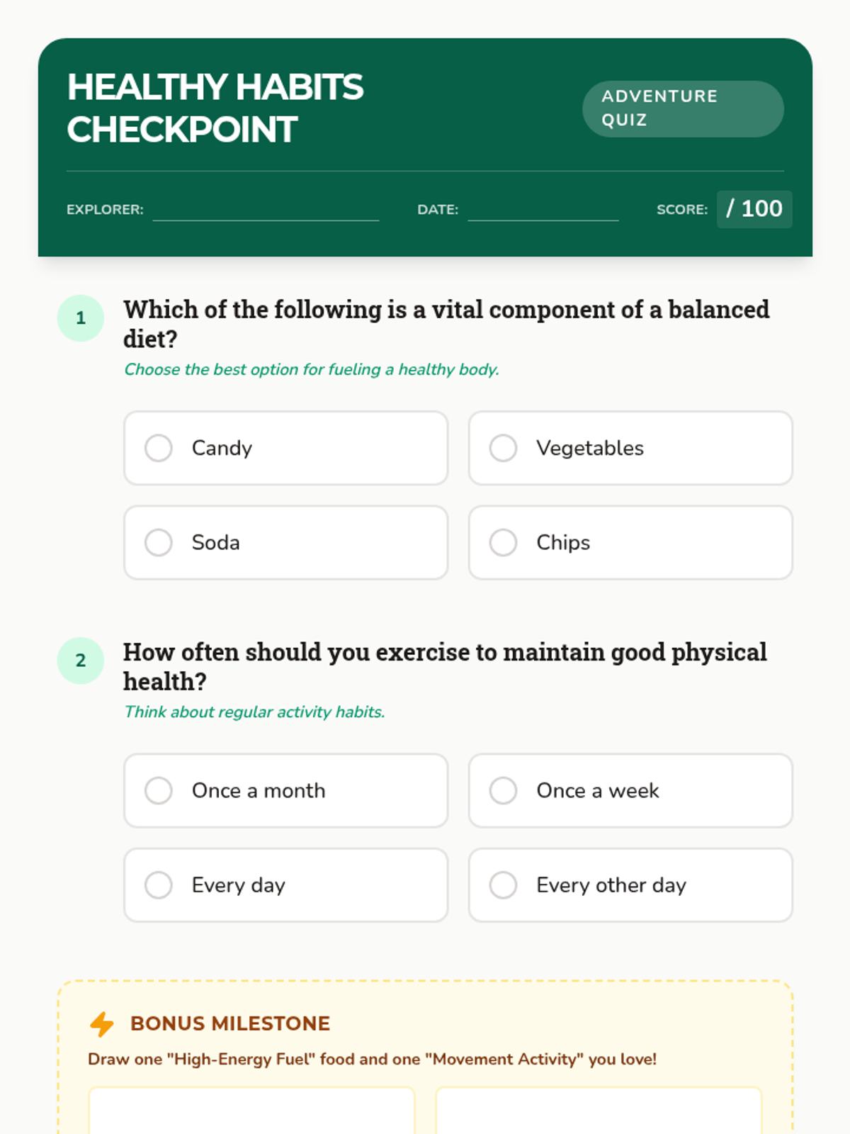 Students will explore the importance of physical health through nutrition and exercise, participating in a relay race and discussing balanced diets to build lifelong healthy habits.