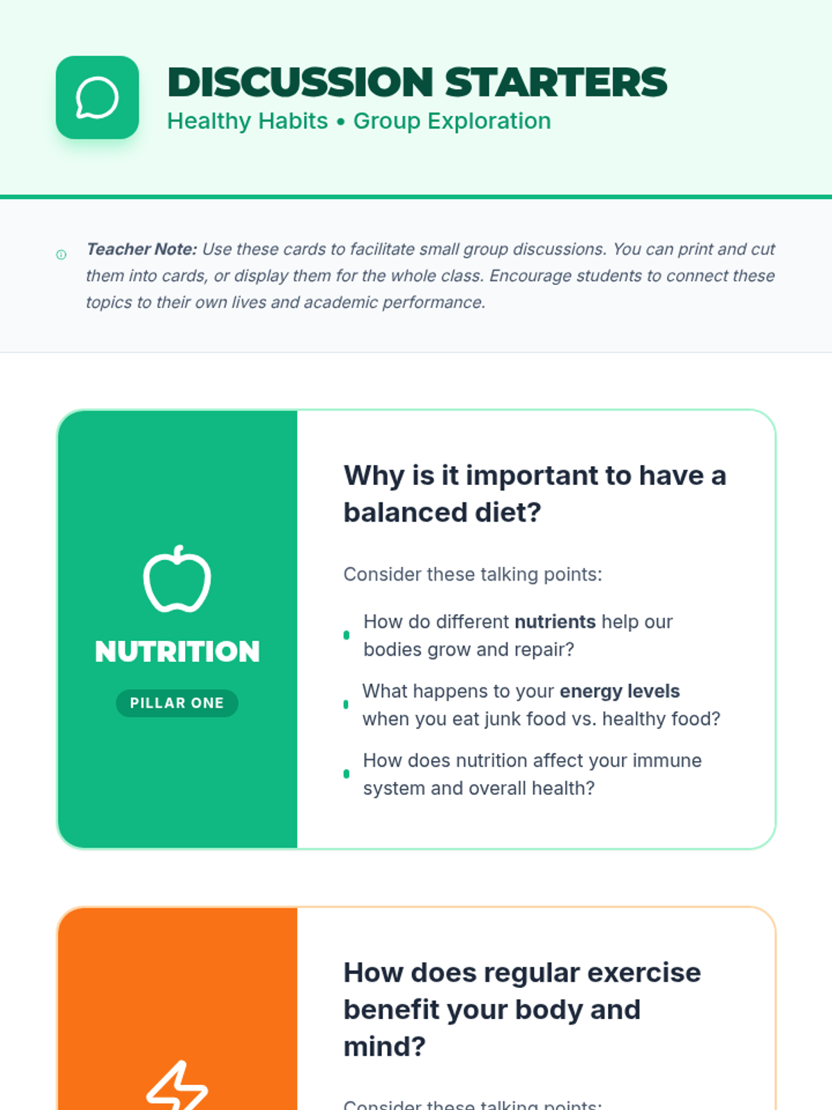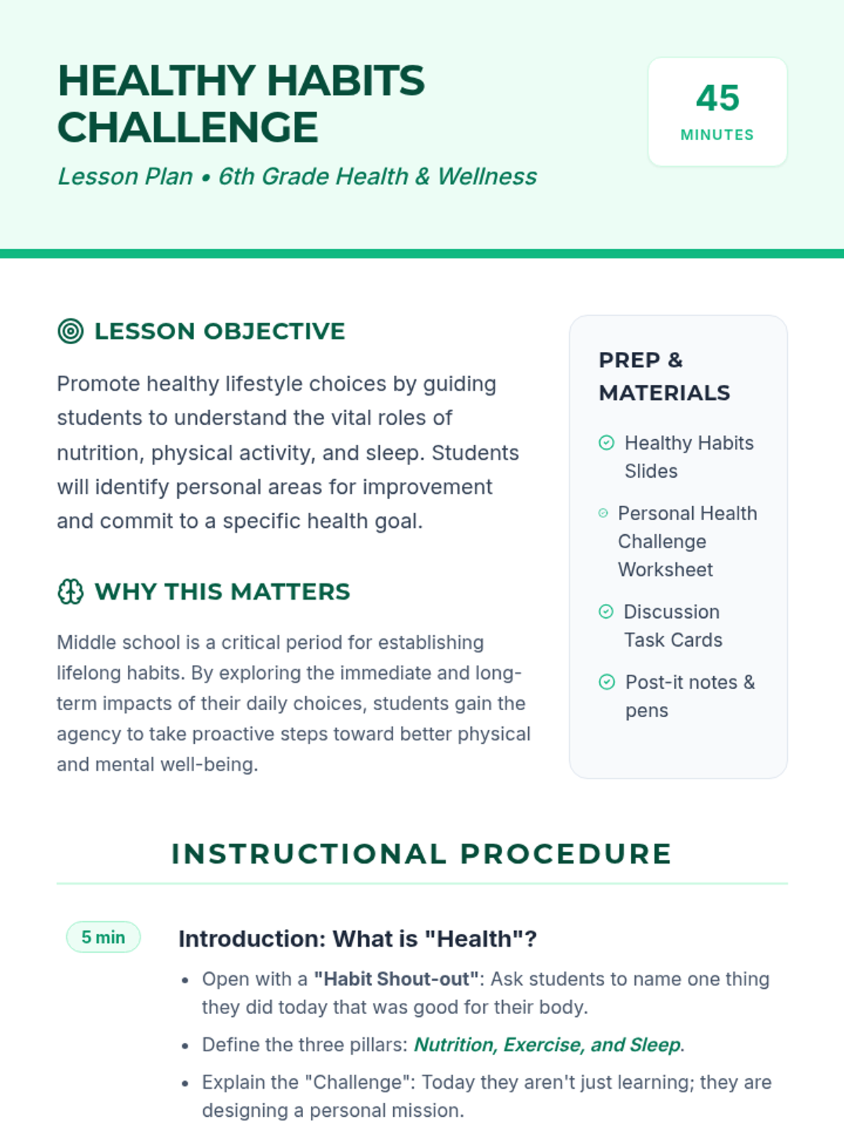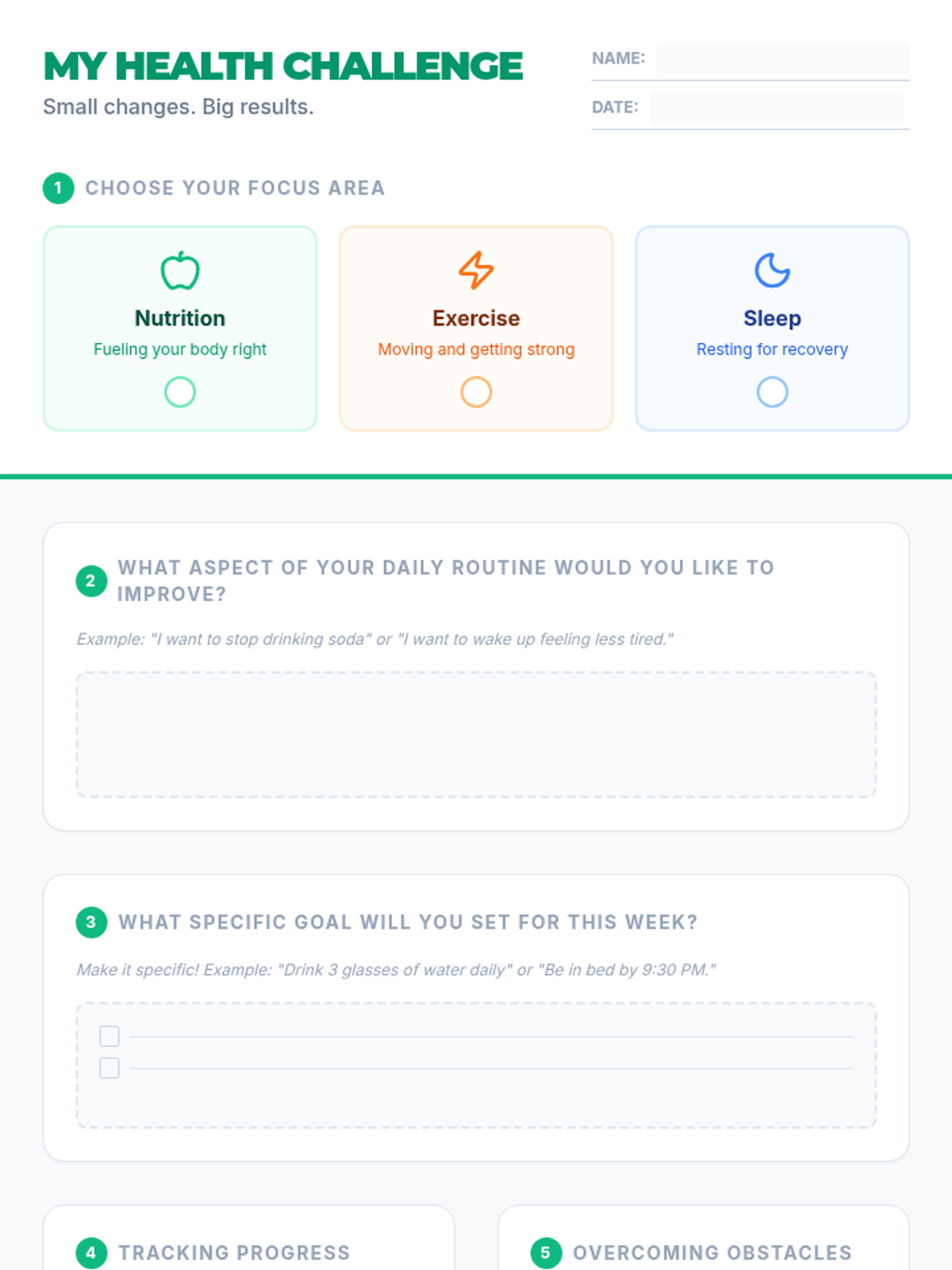 Students explore the importance of nutrition, exercise, and sleep, culminating in a personal health challenge goal-setting activity.
