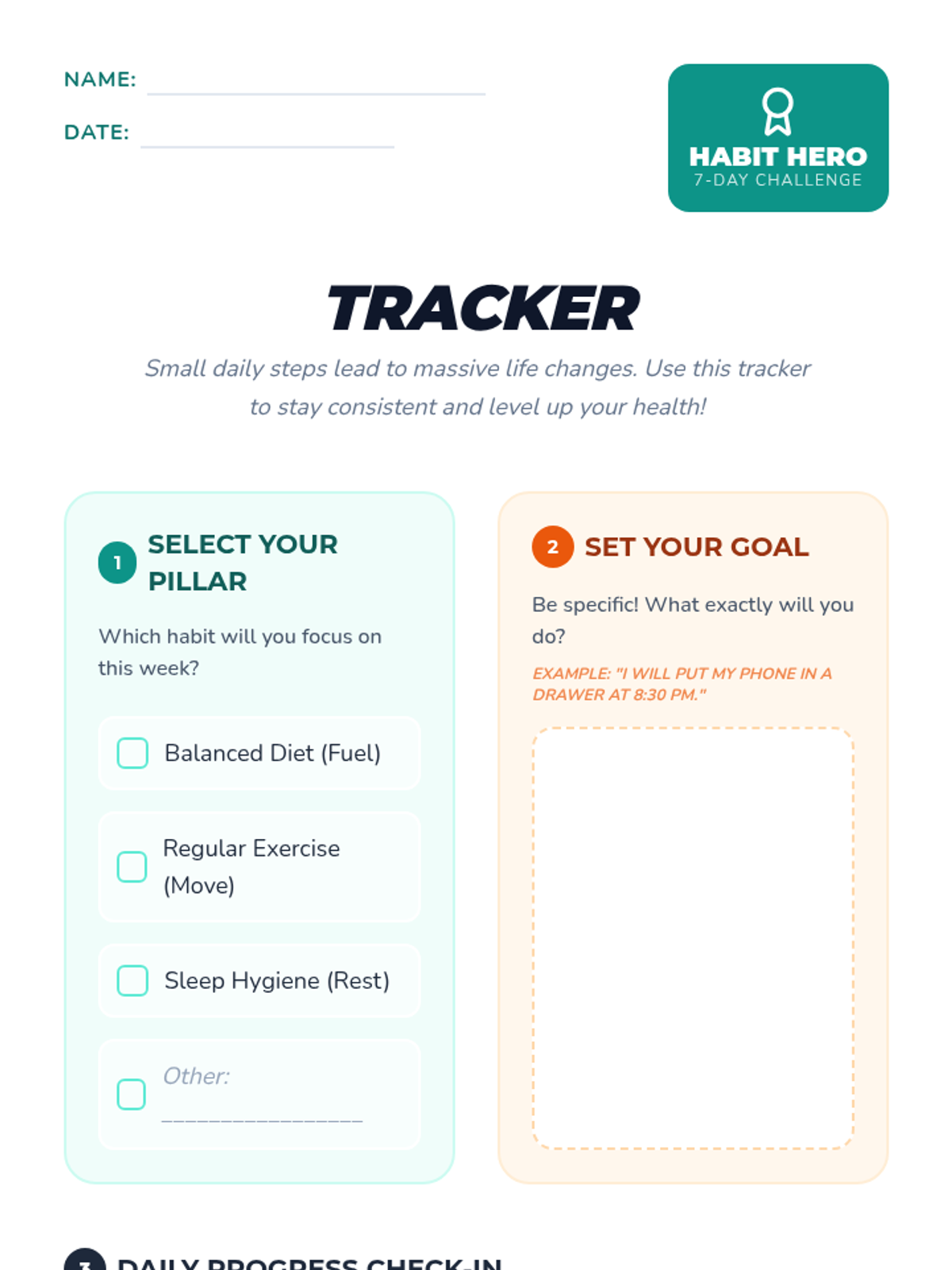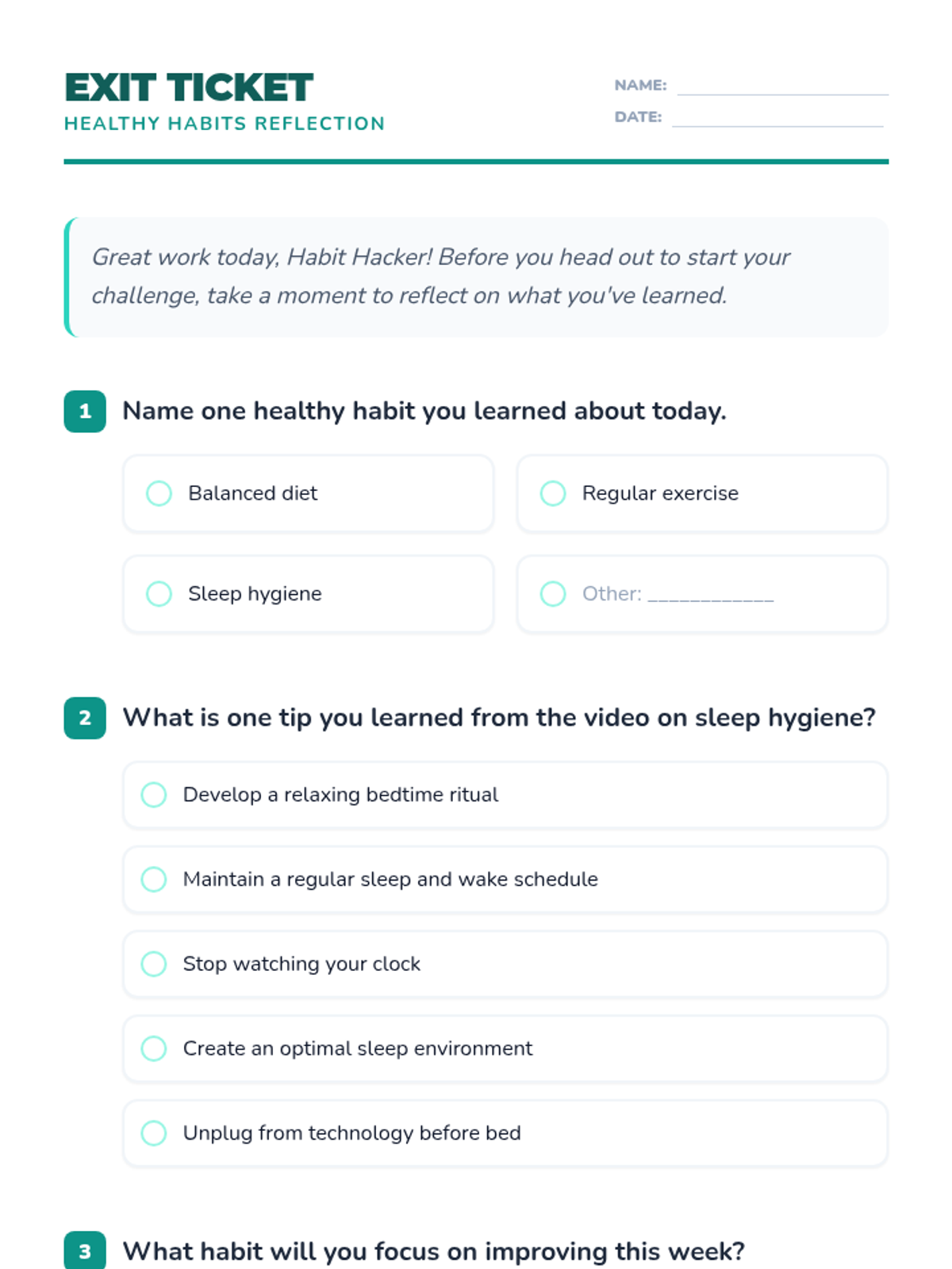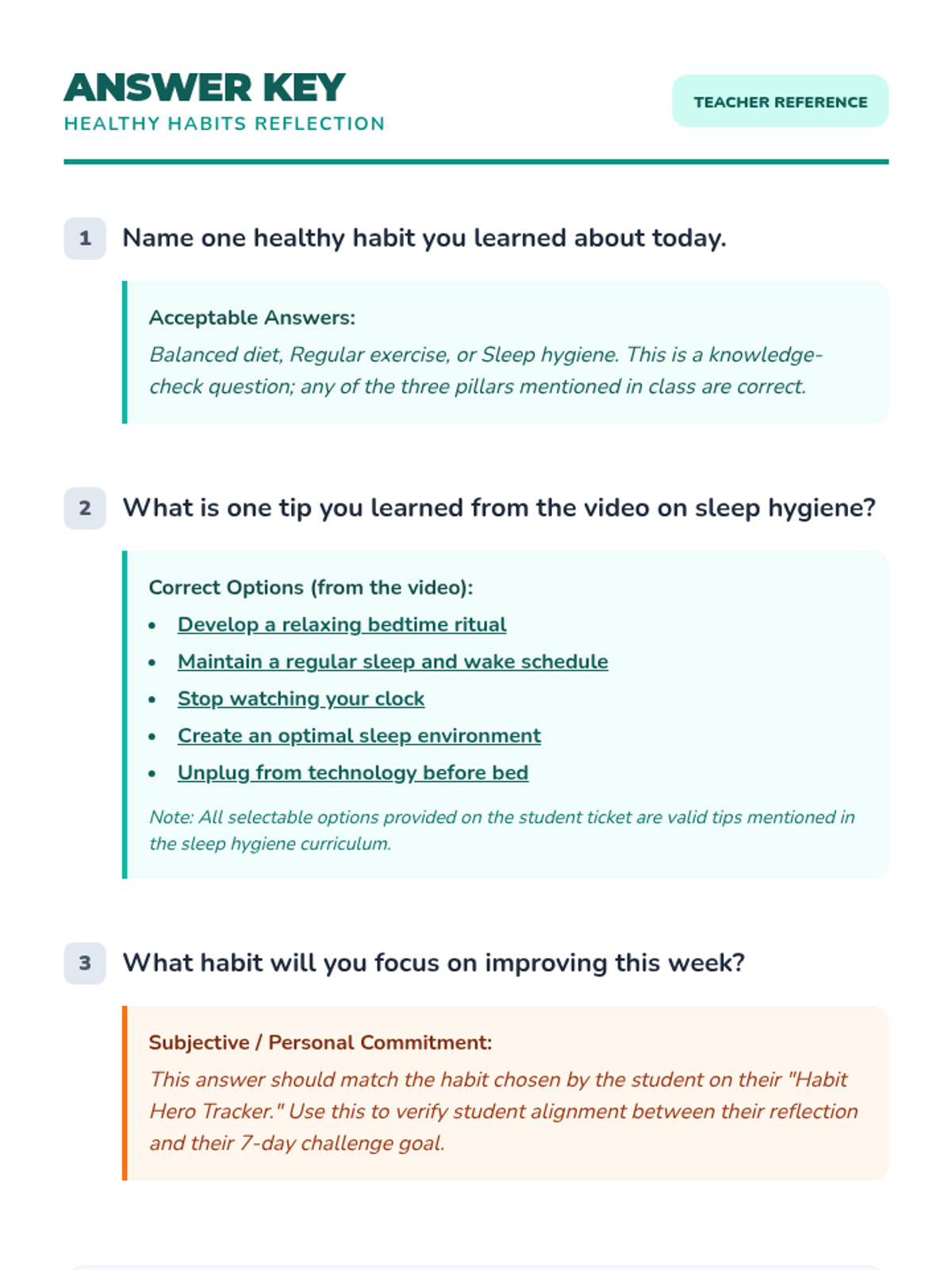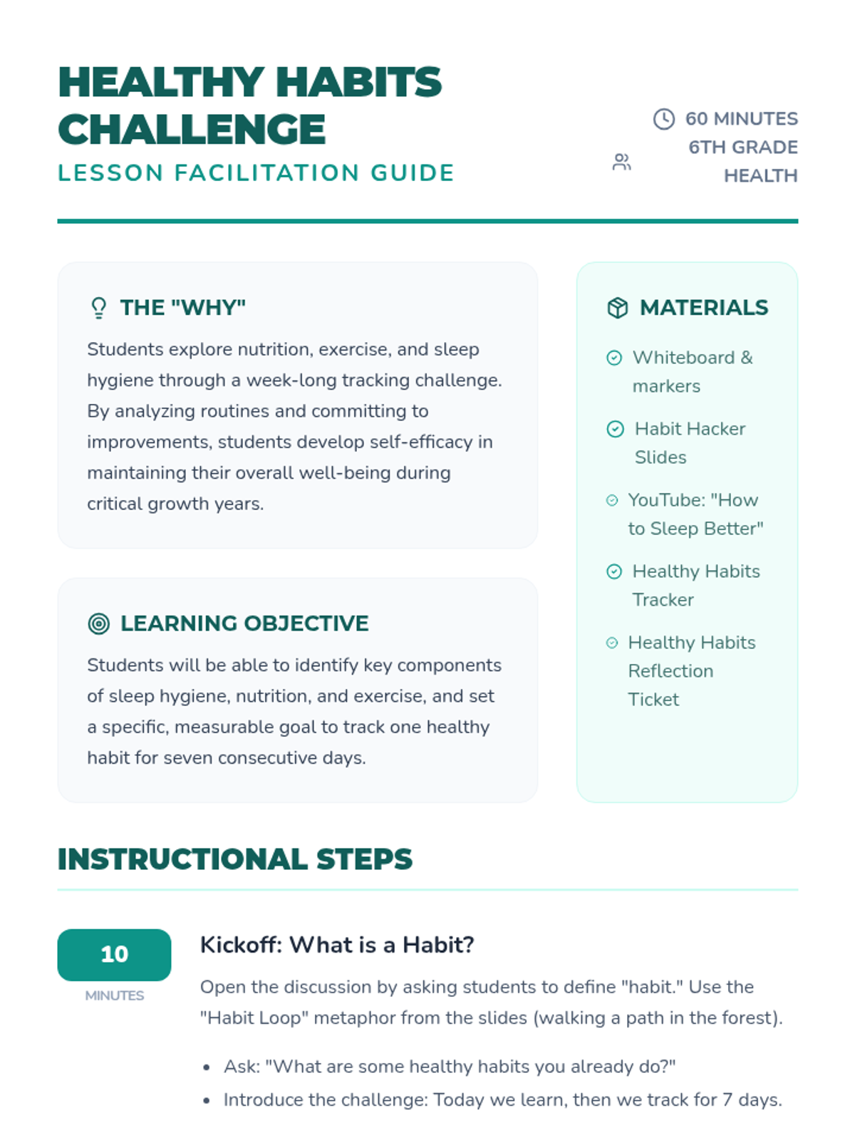 A comprehensive lesson for 6th graders to explore nutrition, exercise, and sleep hygiene through a week-long personal habit-tracking challenge. Students will analyze their own routines and commit to one healthy improvement.