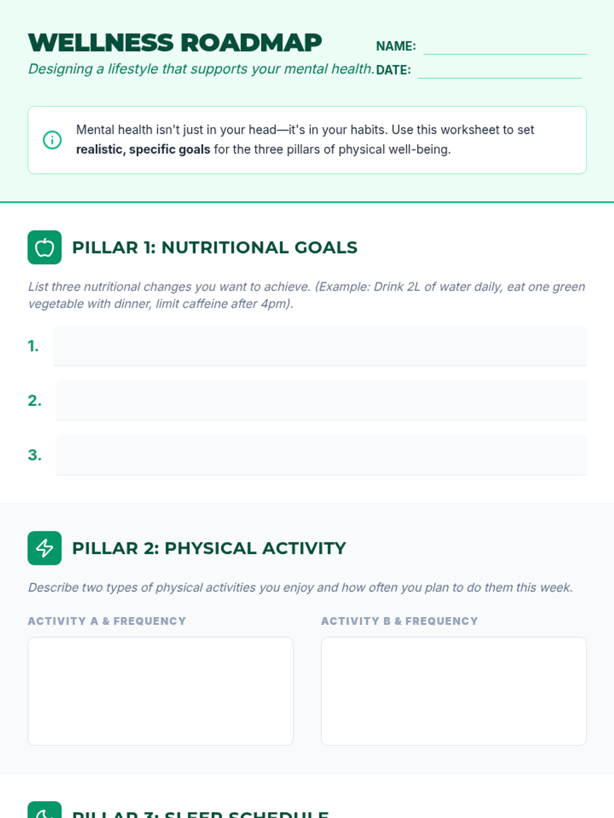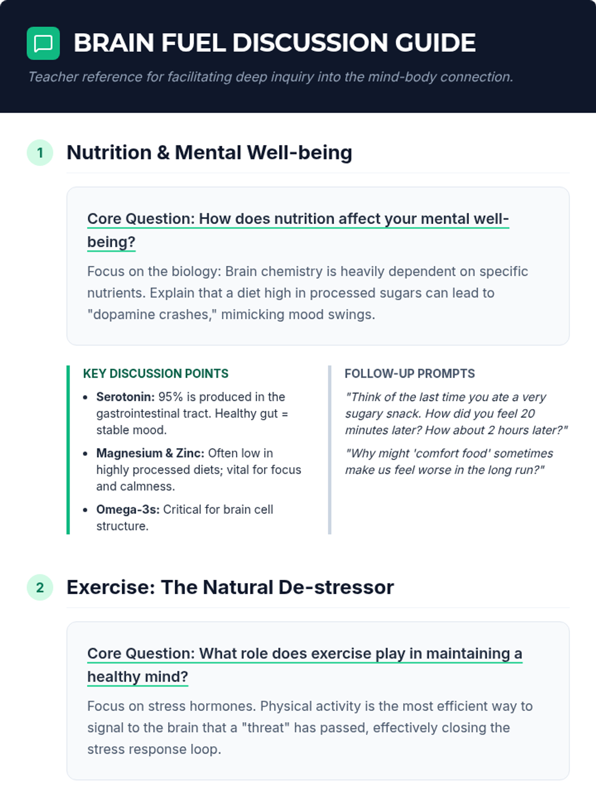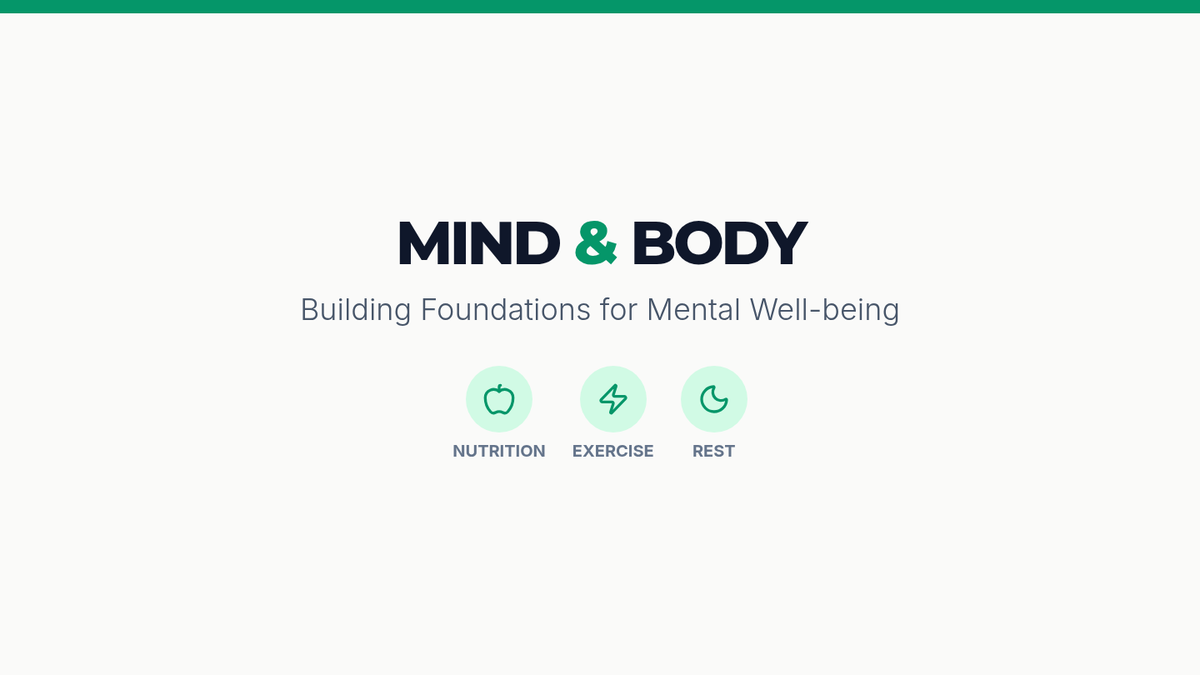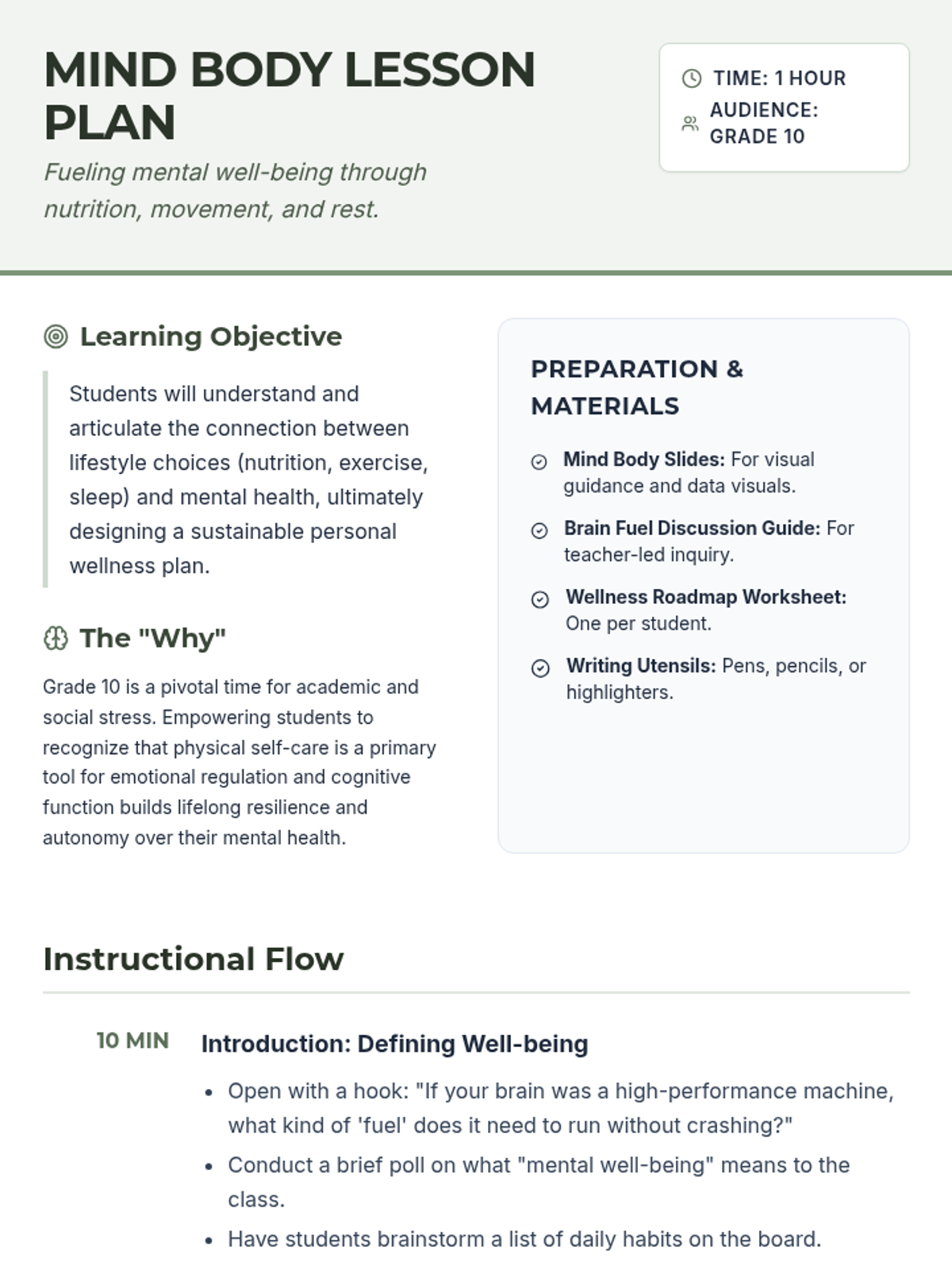 A comprehensive lesson for Grade 10 students exploring the foundational link between physical habits—nutrition, exercise, and sleep—and mental well-being. Students create personalized wellness plans to support their long-term mental health.