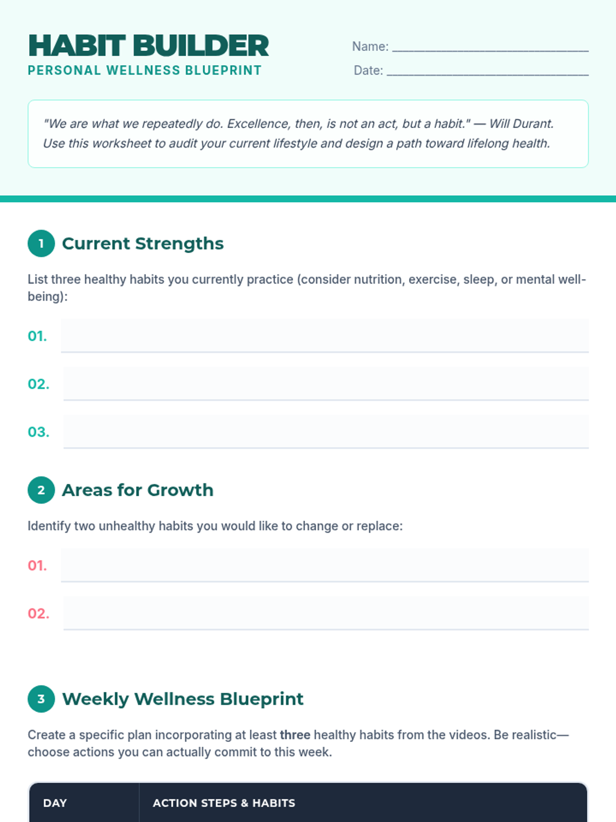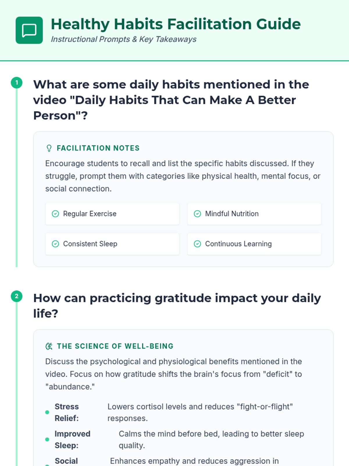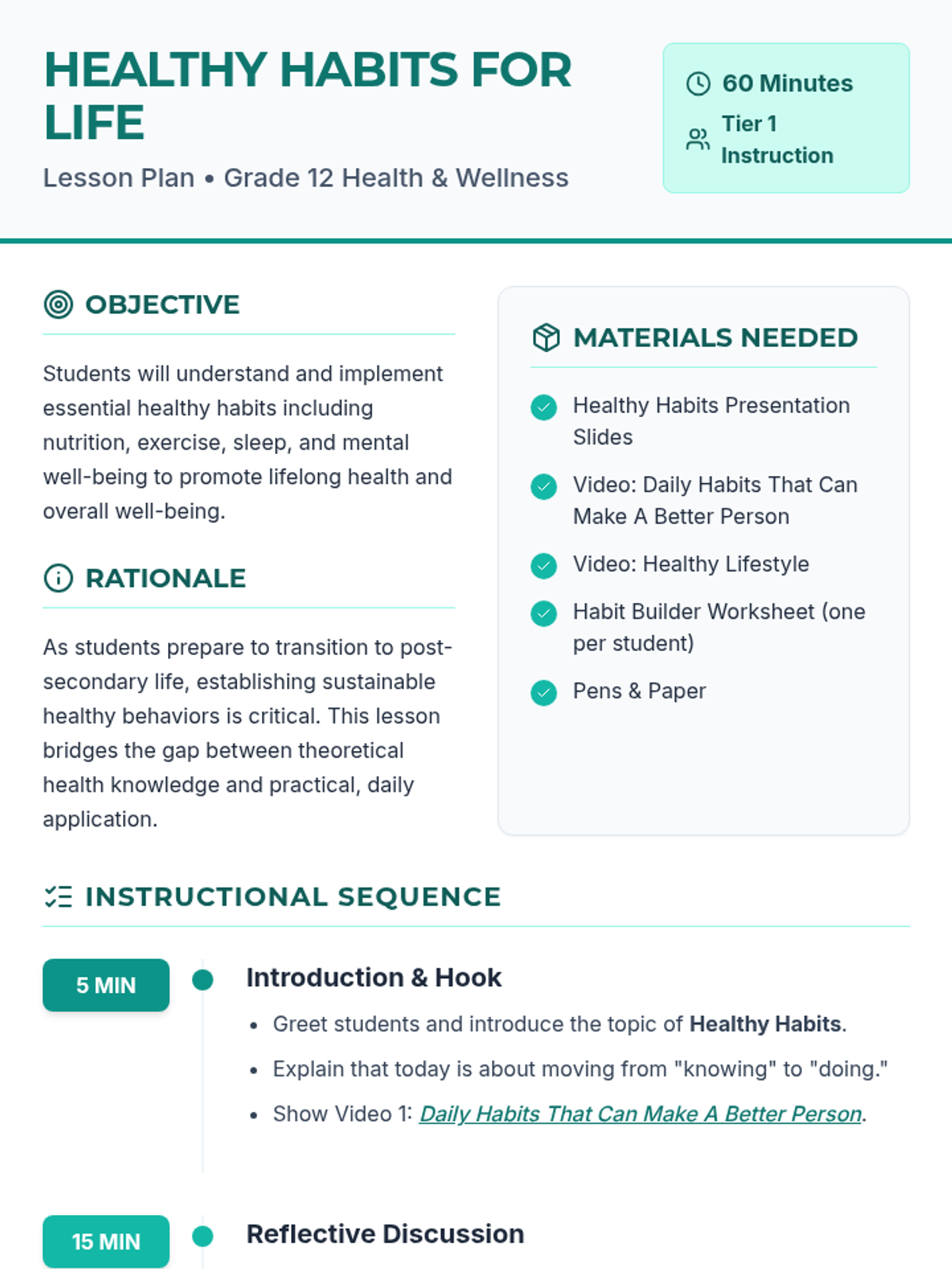 A comprehensive lesson for Grade 12 students focusing on essential healthy habits across nutrition, exercise, sleep, and mental well-being to promote lifelong health.
