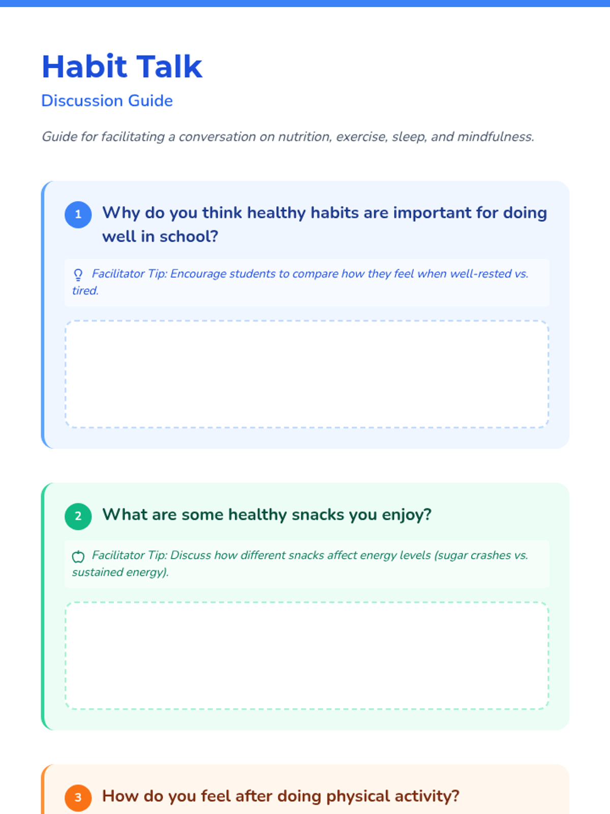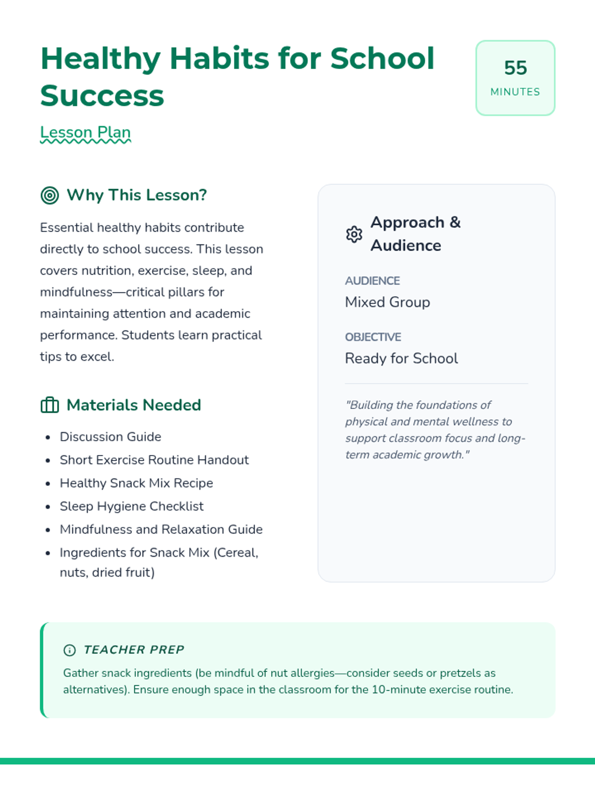 This lesson focuses on essential healthy habits that contribute to success in school, covering nutrition, exercise, sleep hygiene, and mindfulness. Students will participate in hands-on activities like preparing a healthy snack and practicing relaxation techniques.