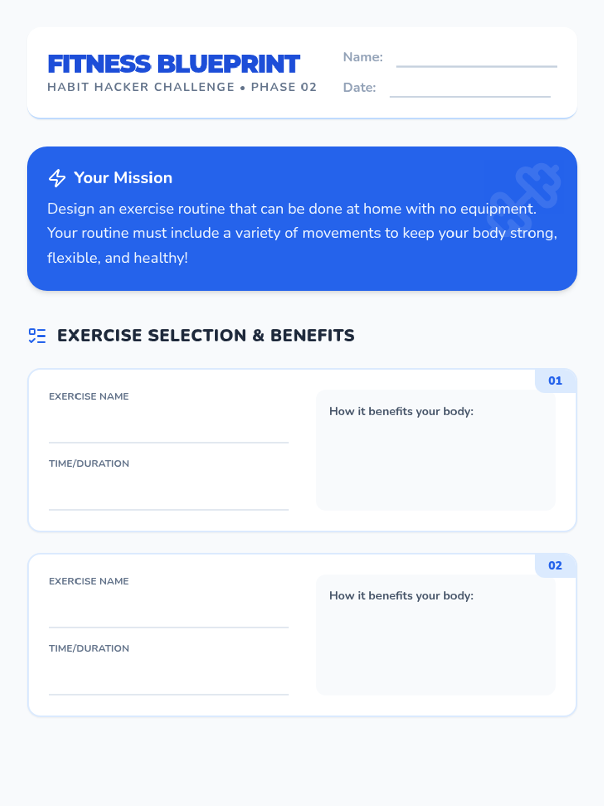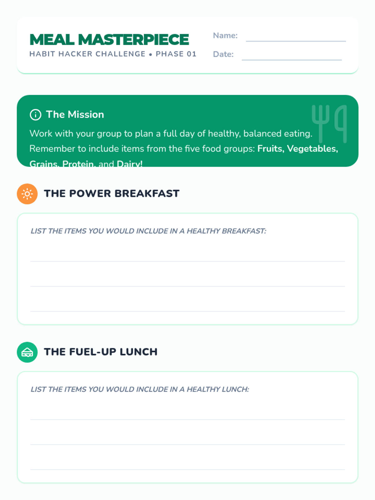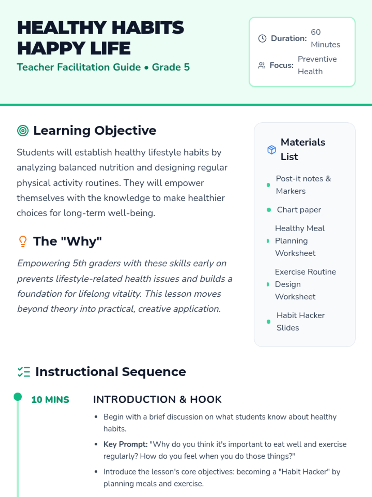 A comprehensive lesson for 5th graders on developing healthy lifestyle habits, focusing on balanced nutrition and regular physical activity through meal planning and exercise design.