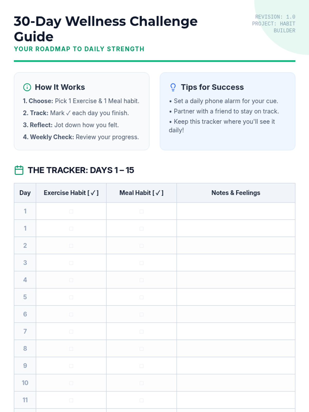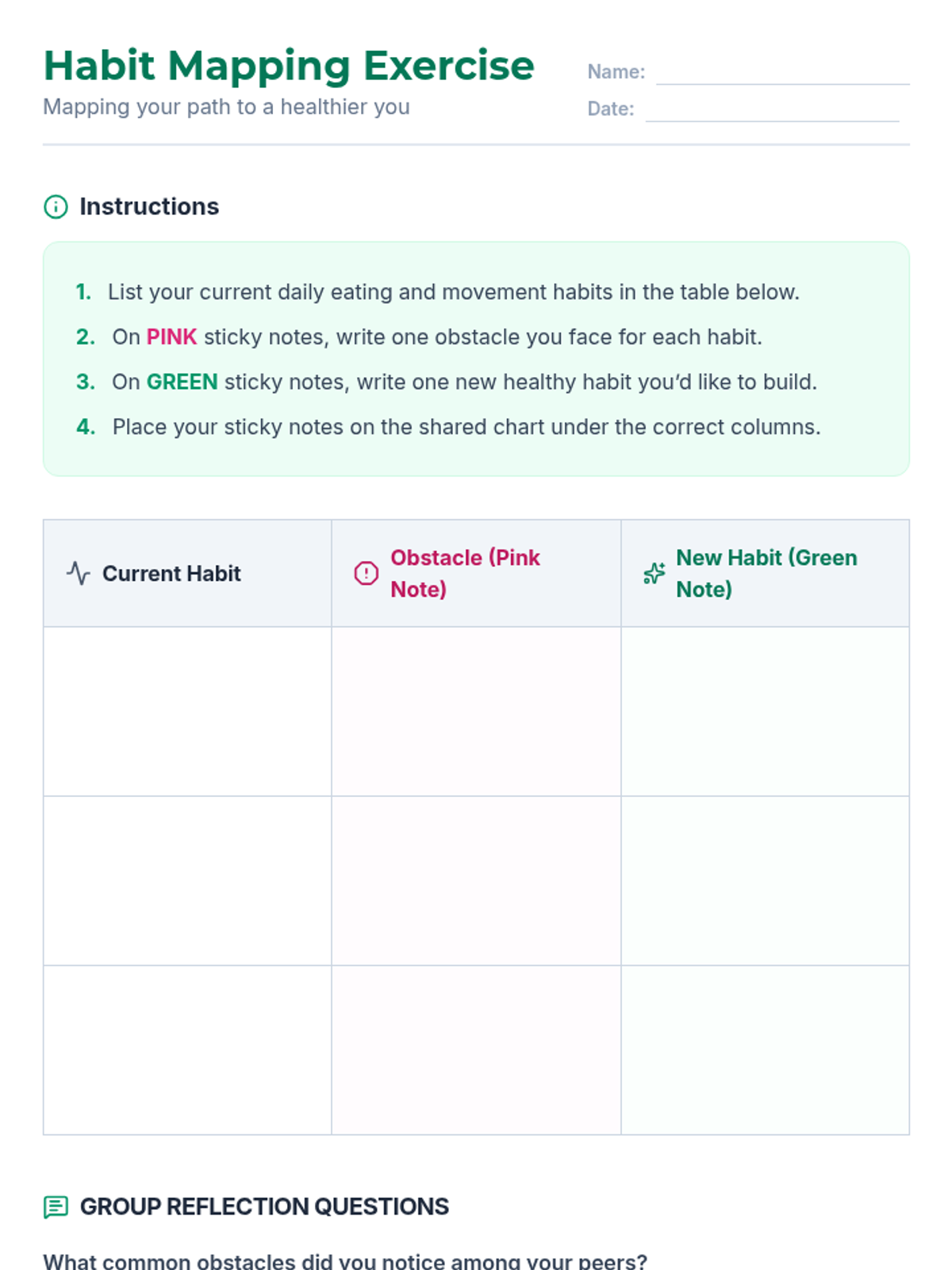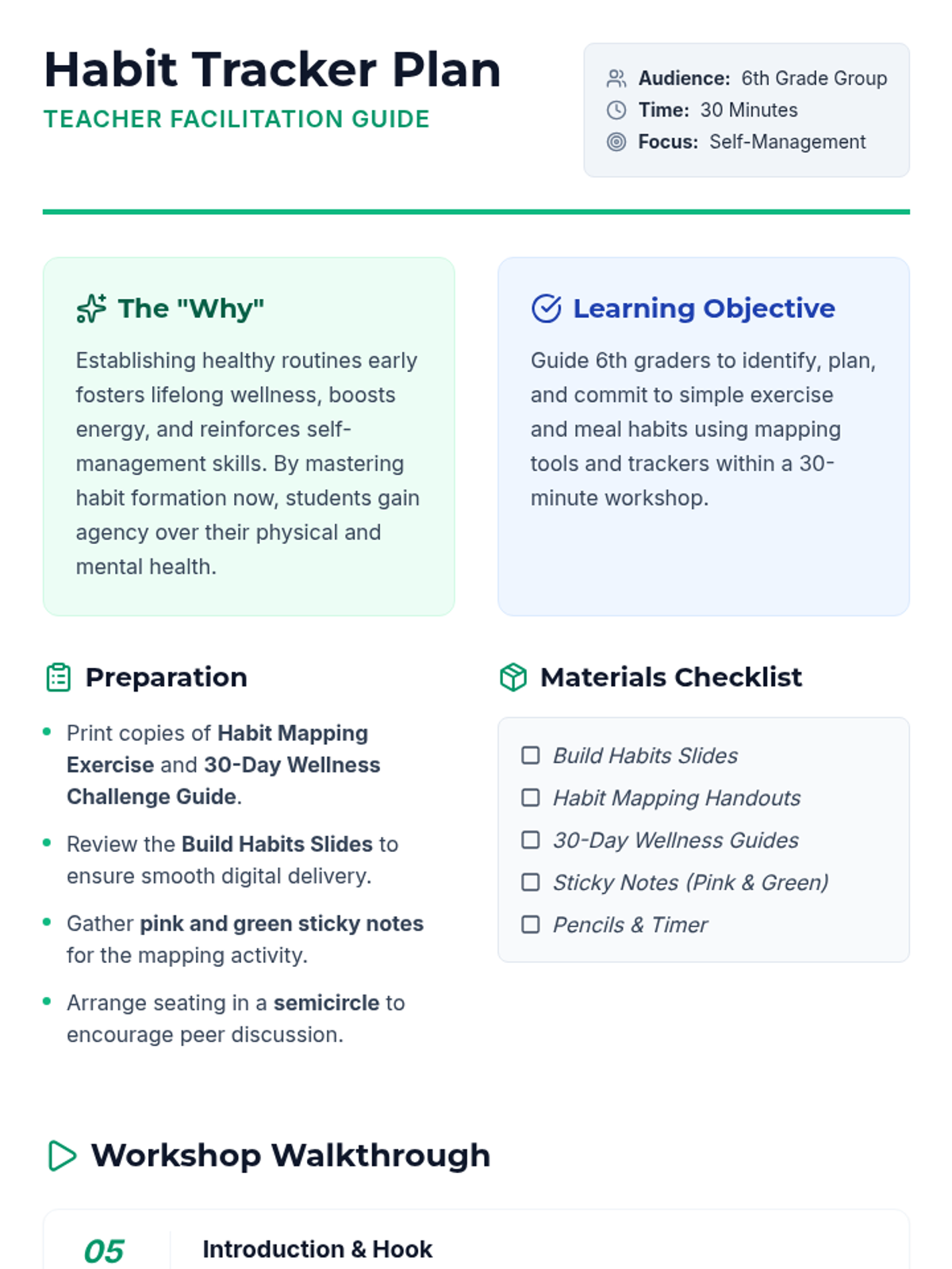 A 30-minute Tier 2 workshop for 6th graders focused on habit formation strategies for exercise and nutrition, featuring mapping activities and a 30-day tracking challenge.