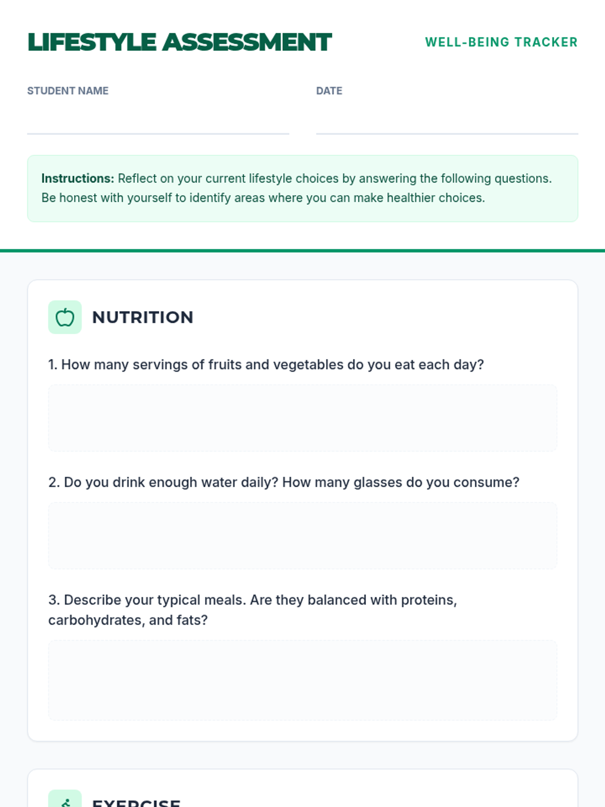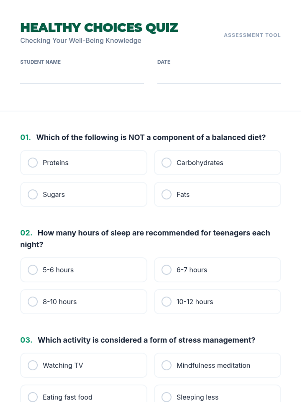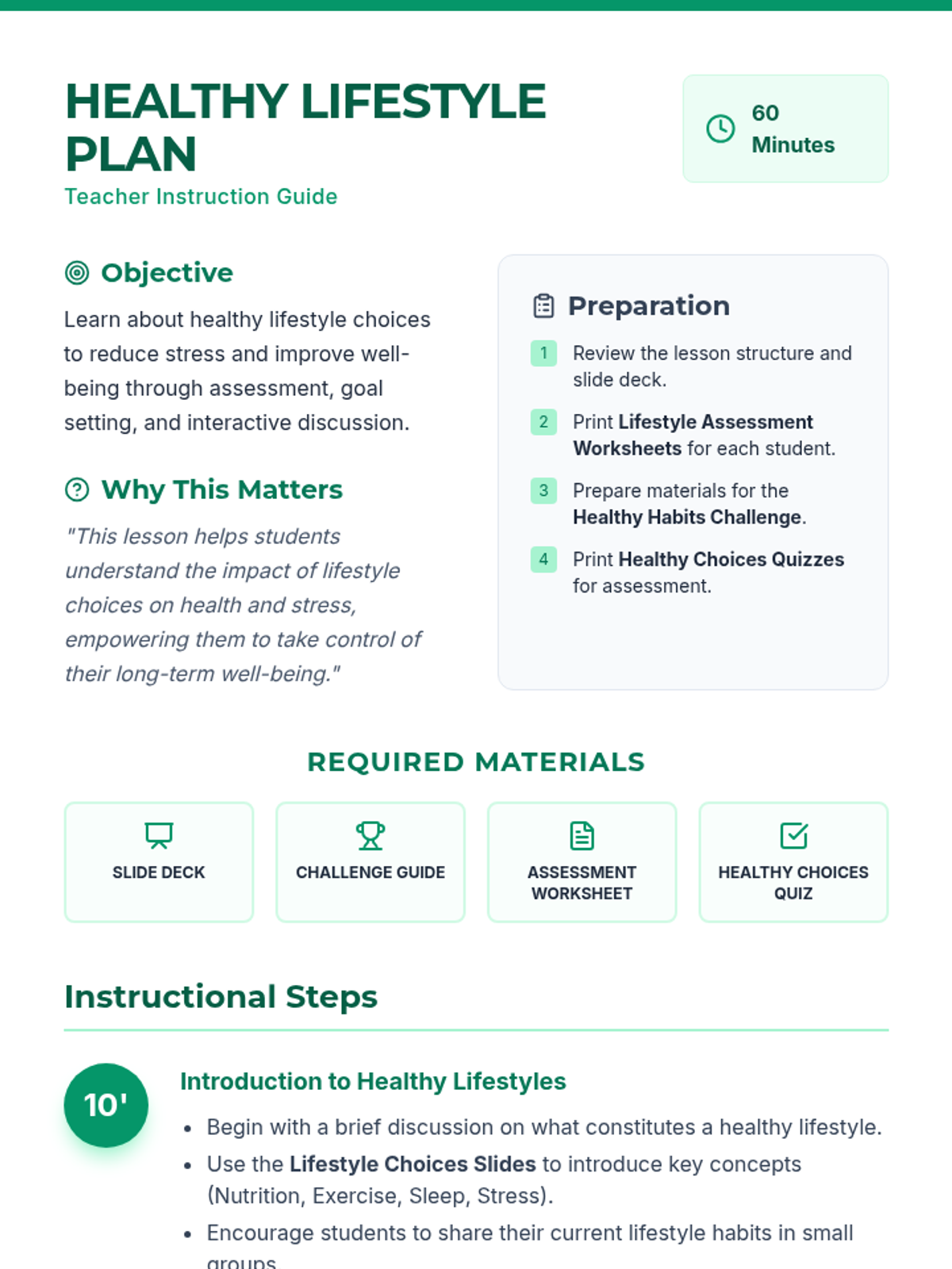 A comprehensive lesson designed for middle school students to explore the impact of nutrition, exercise, sleep, and stress management on their overall well-being. Students assess their current habits and set personal goals for a healthier lifestyle.
