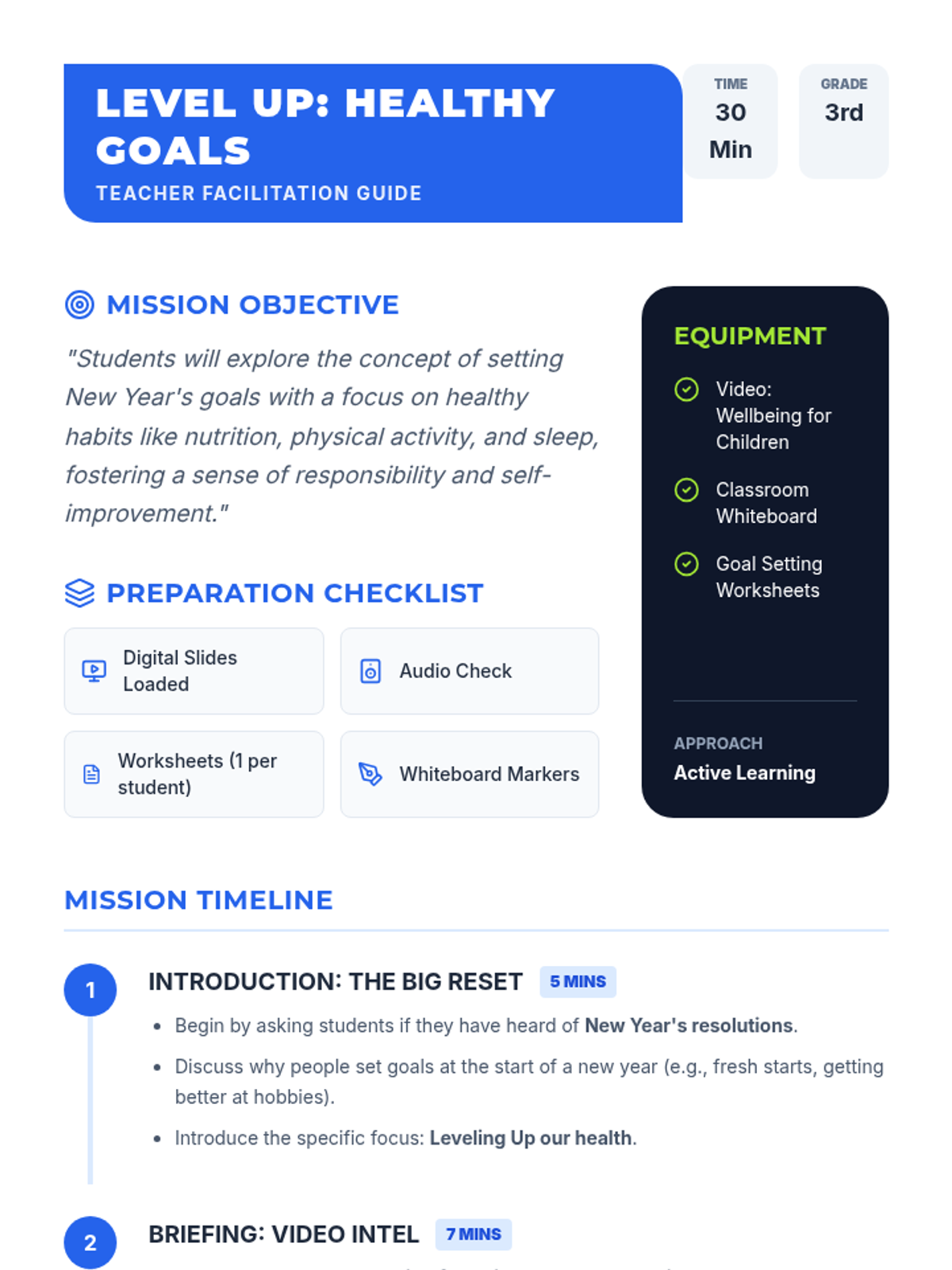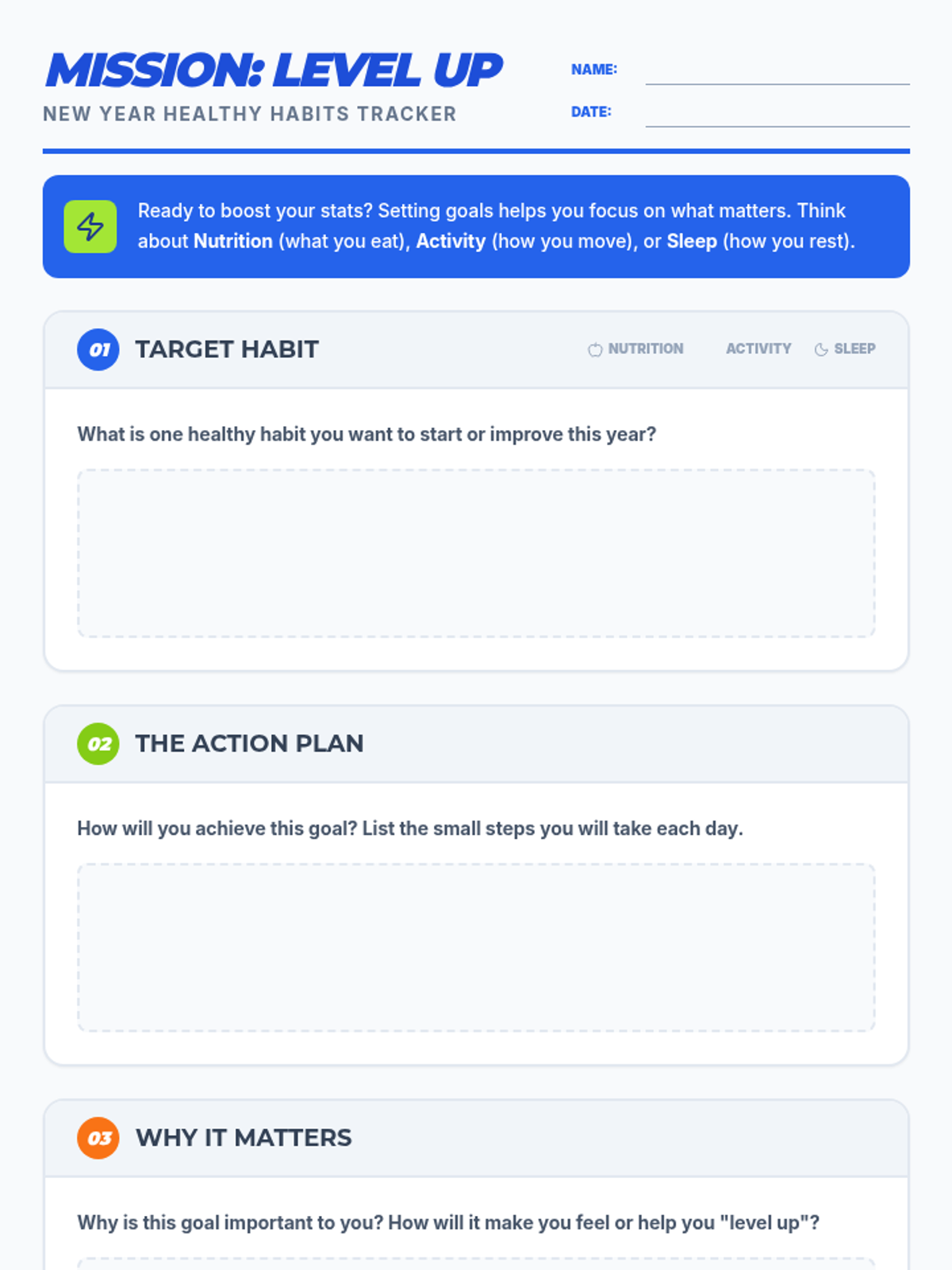 Students will explore setting New Year's goals focused on healthy habits like nutrition, exercise, and sleep. This lesson uses a video to inspire students to 'Level Up' their wellbeing through realistic goal-setting.